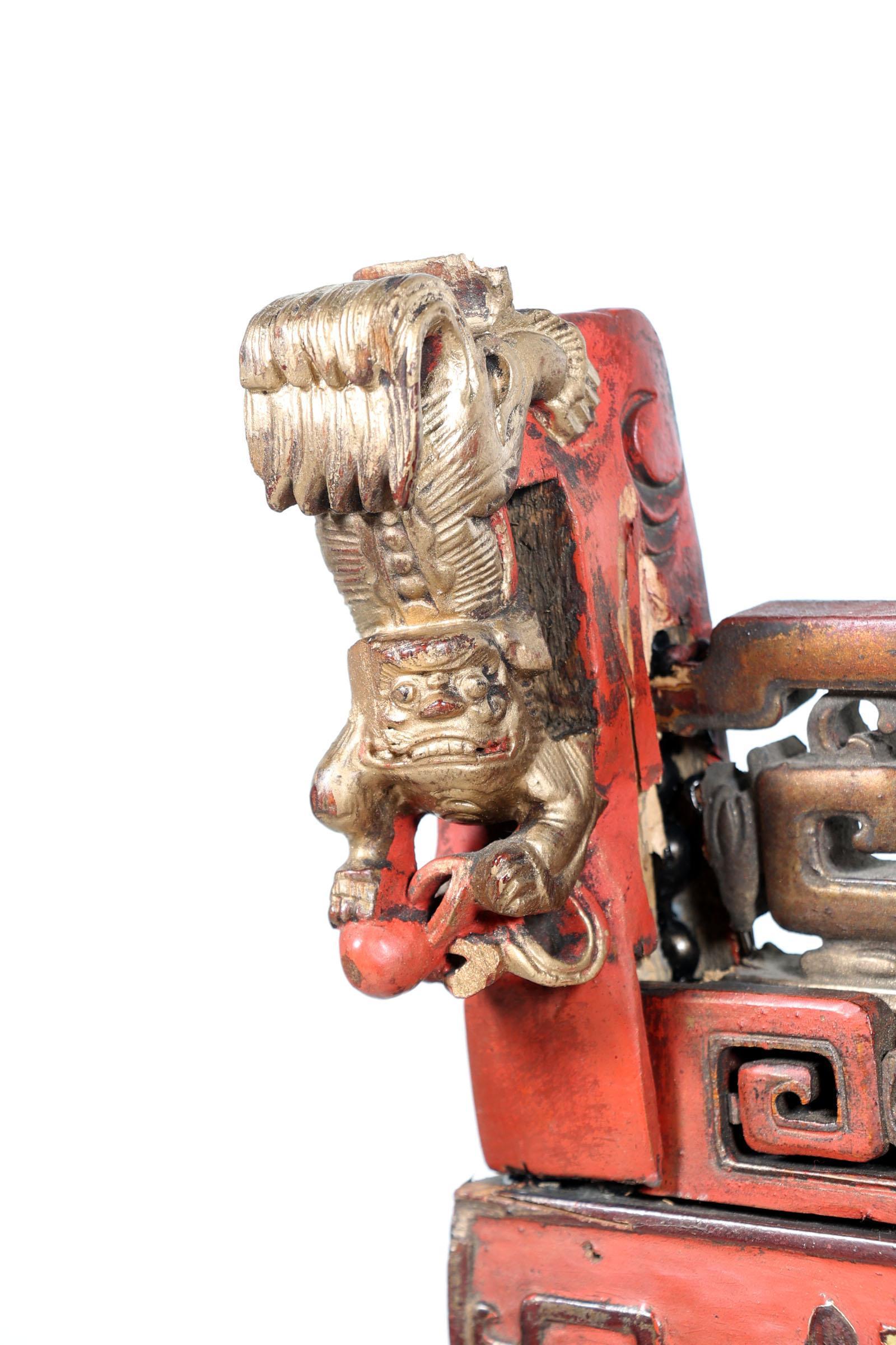 Rood gelakte Chinese houten bruidskast met rijkbewerkte bovenzijde en koperen beslag, h.180 x b.103 x d.75 cm.
