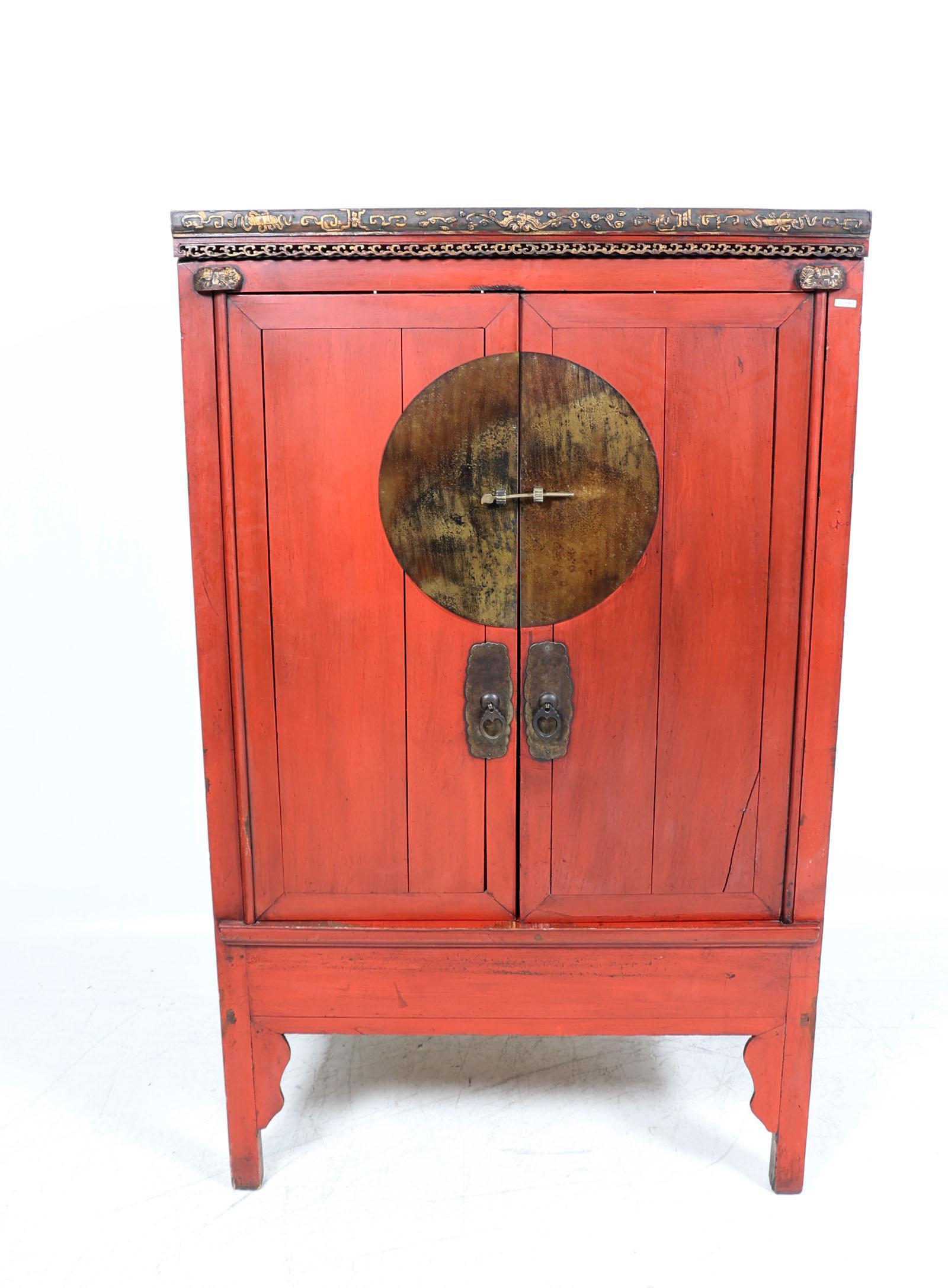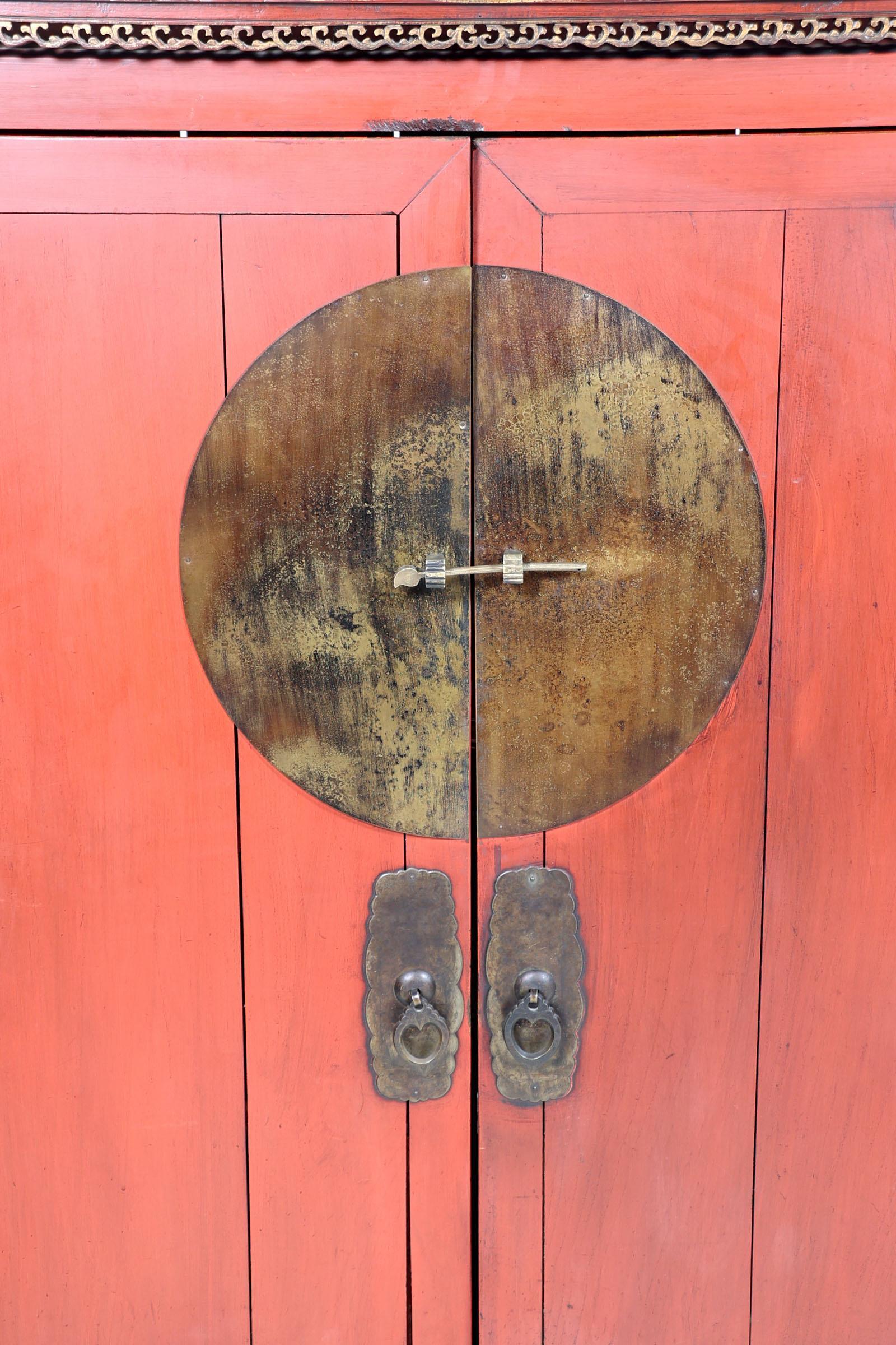 Rood gelakte Chinese houten bruidskast met bewerkte bovenzijde en koperen beslag, h.174 x b.106 x d.64 cm.
