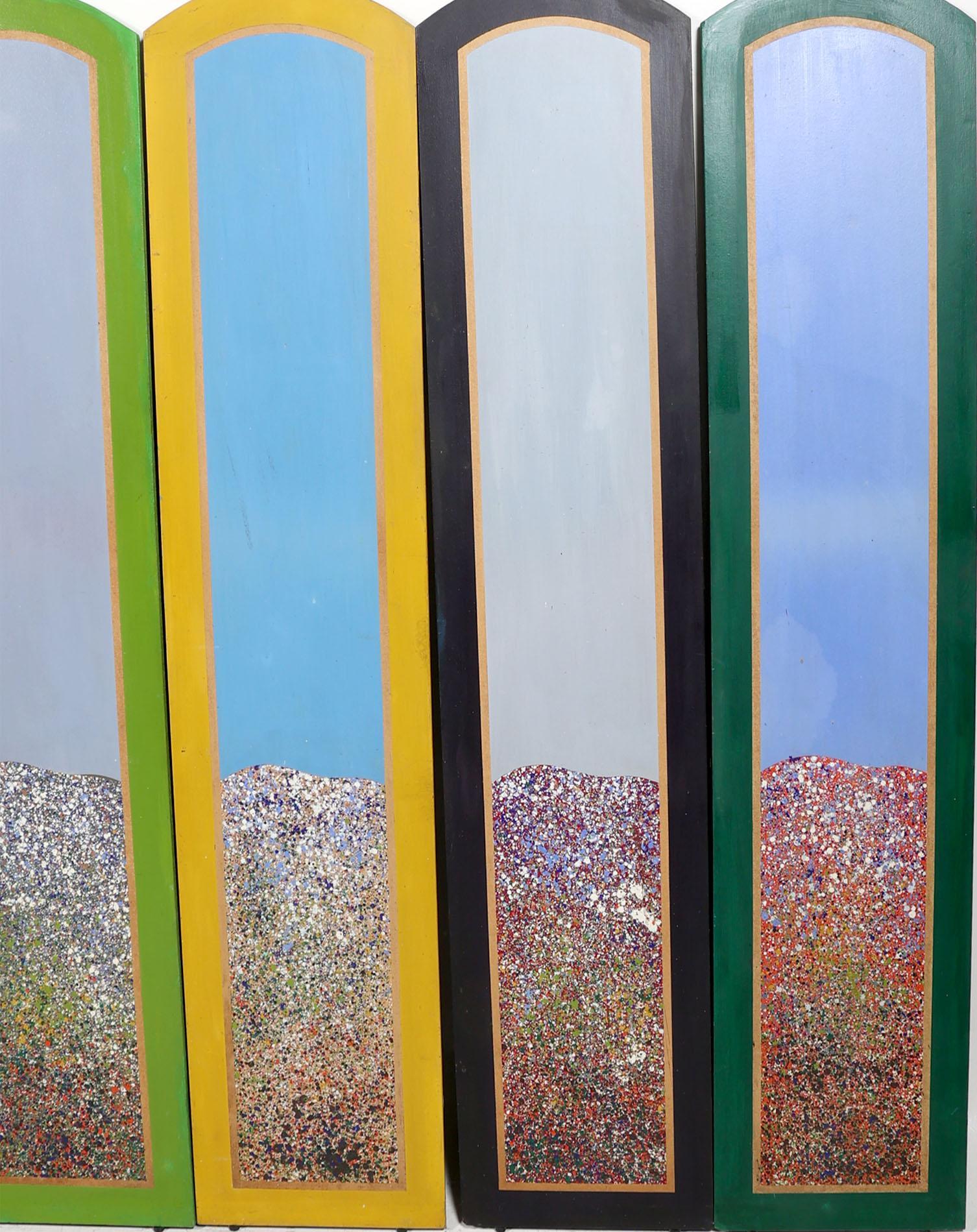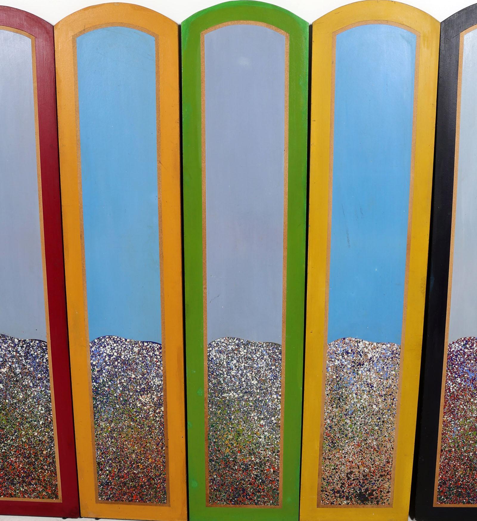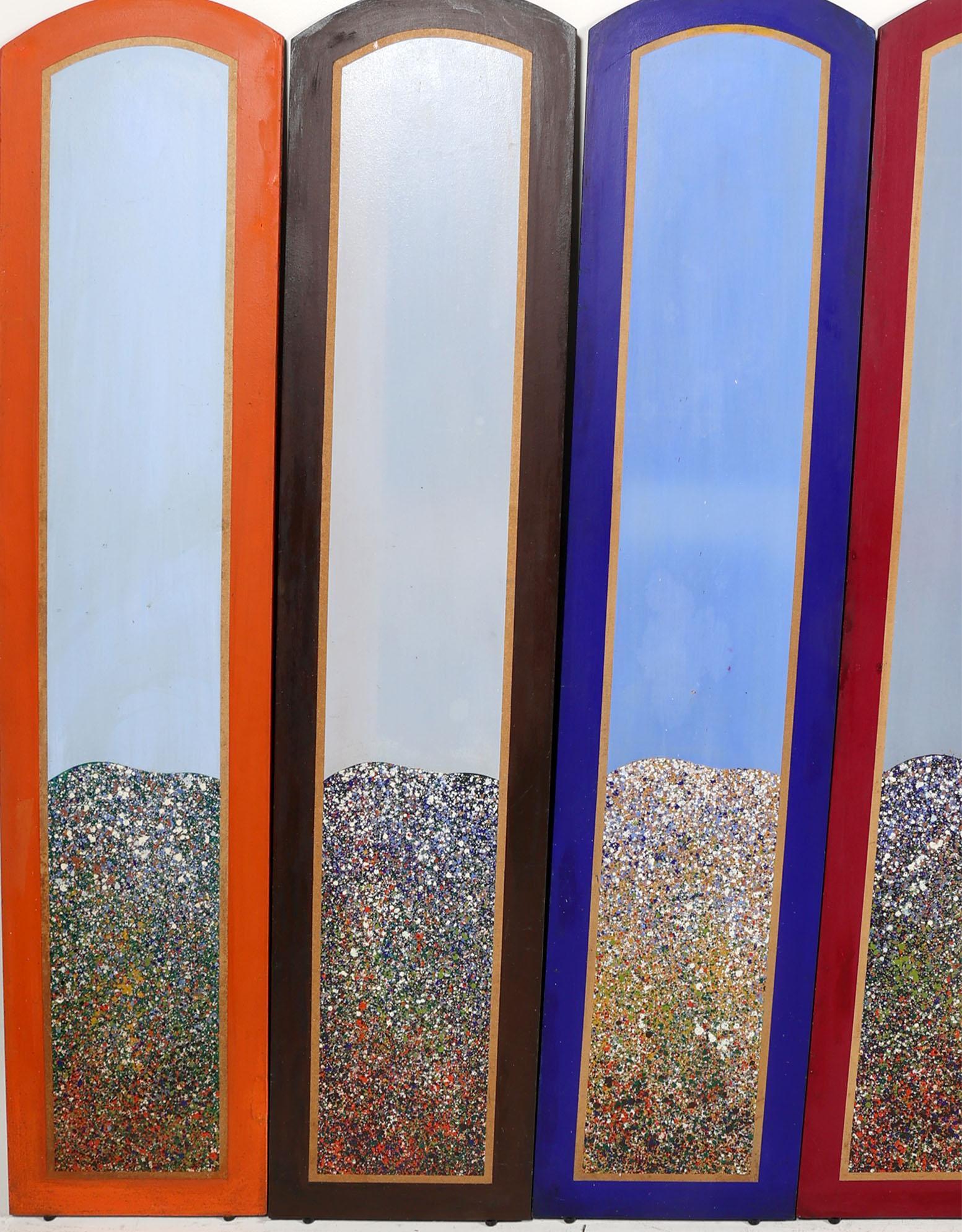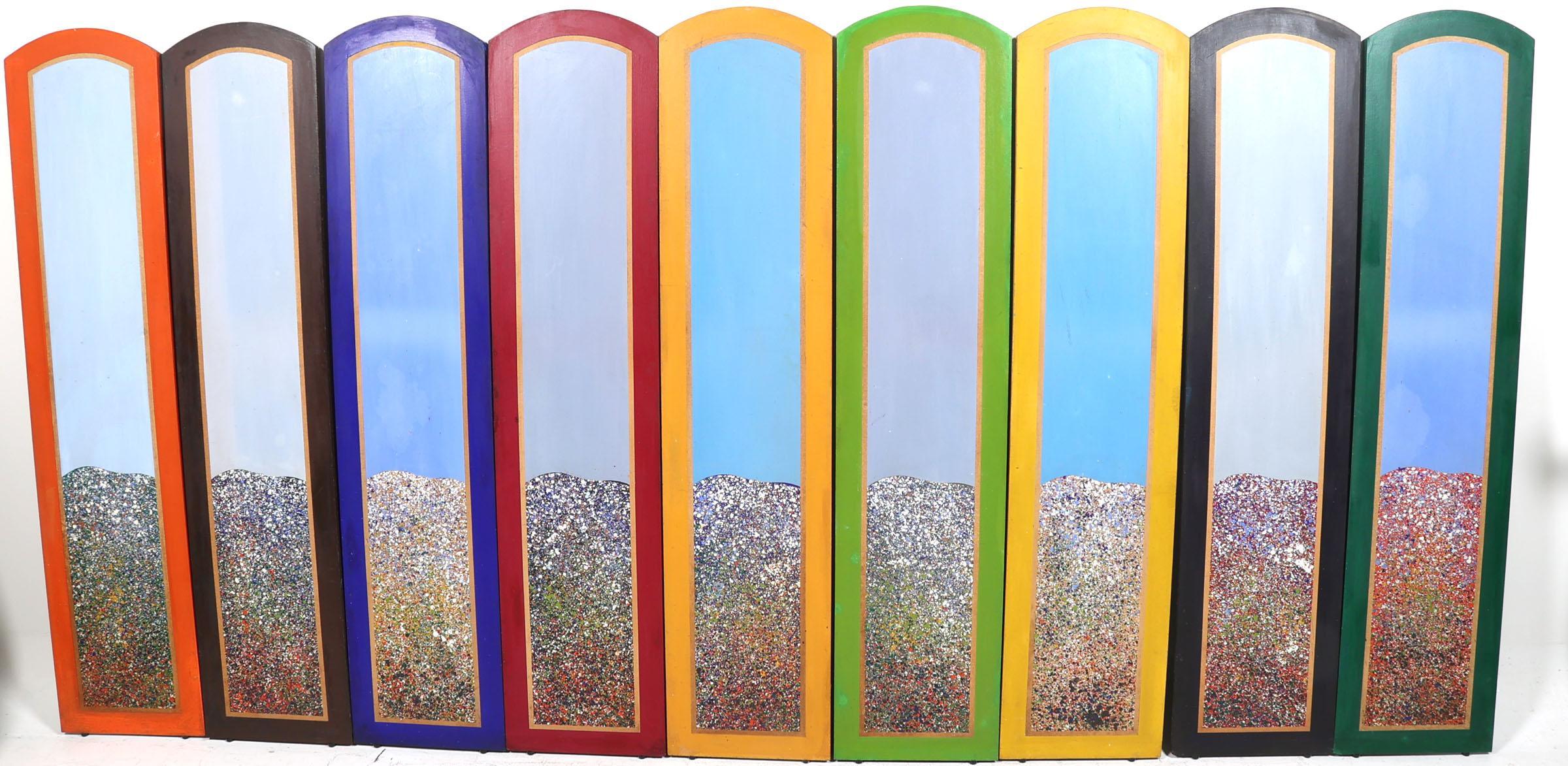 Guillaume Theodoor Lo-a-Njoe (1937), Zonder titel, 9 diverse beschilderde panelen, gemaakt als kunstproject voor het Stedelijk Museum in de jaren 70', h.181 x b.40 cm. per stuk