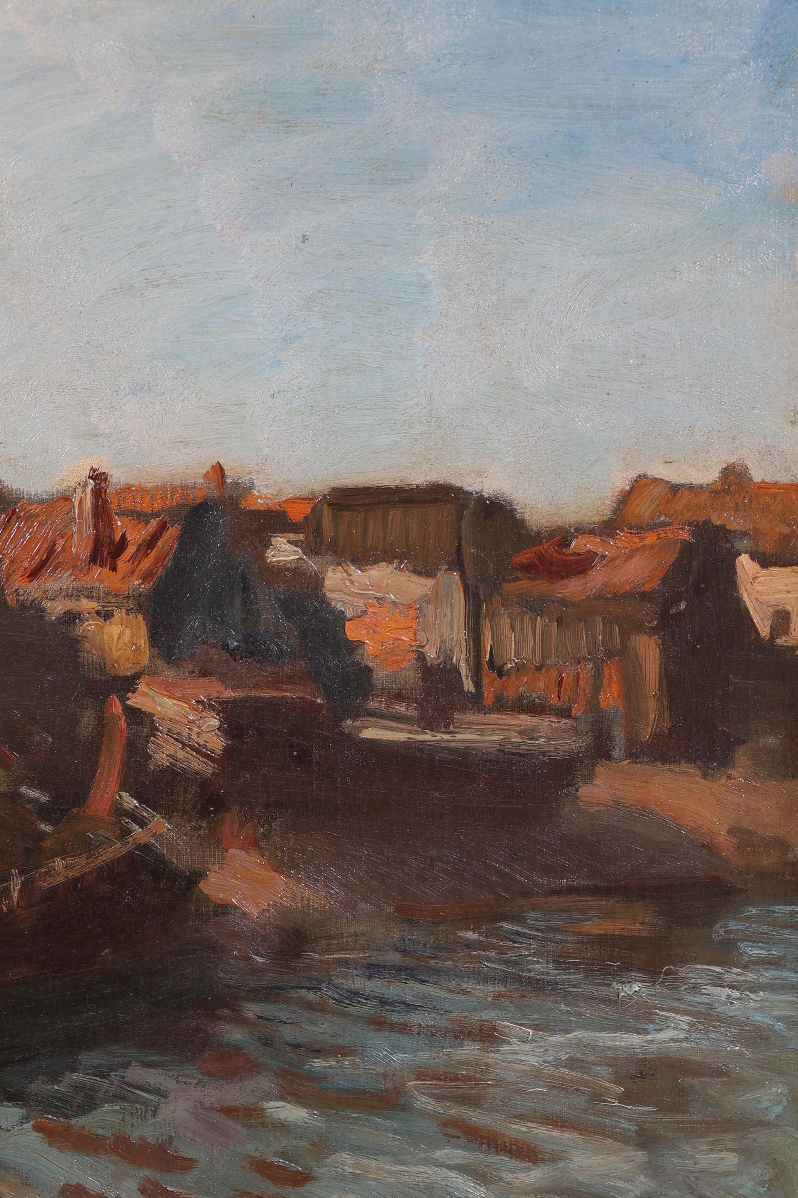 'Arnold' Hendrik Koning (1860-1945), Huisjes aan het water, olieverf op doek, 36,5 x 53 cm.