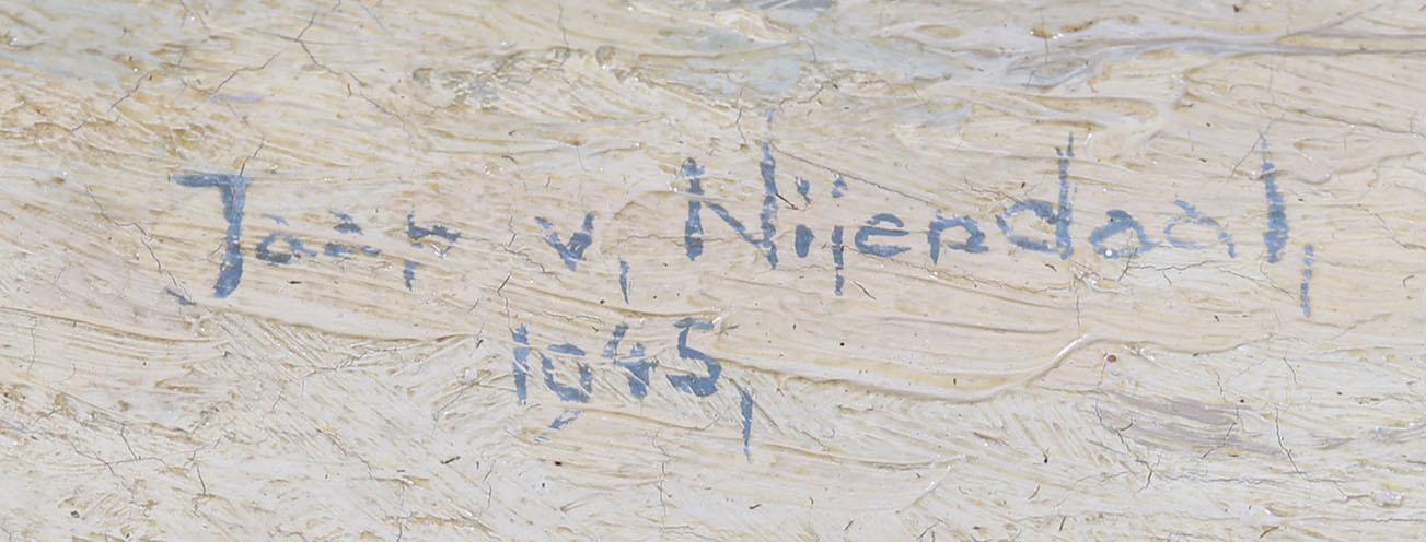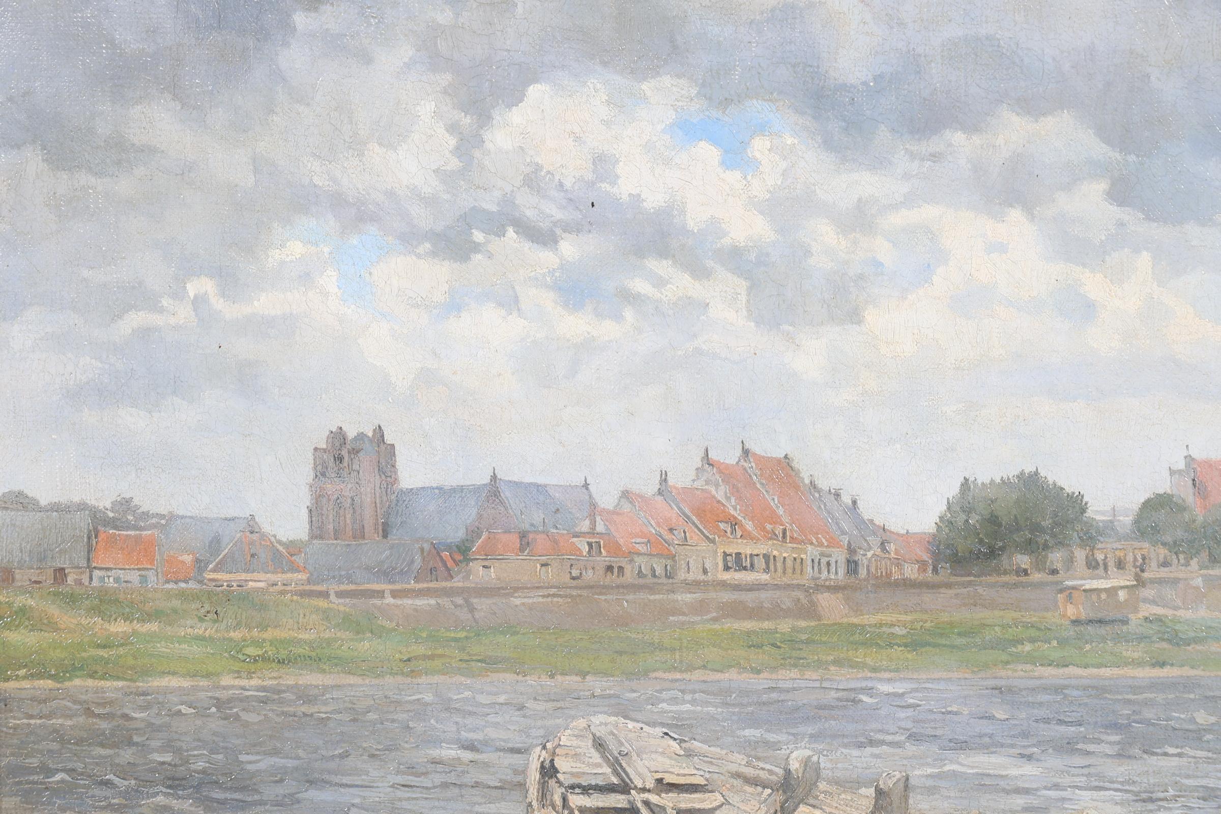 Jaap van Nijendaal (1916-1990), Stadsgezicht aan het water met scheepswrak, olieverf op doek, gedateerd 1945, 49 x 58 cm.