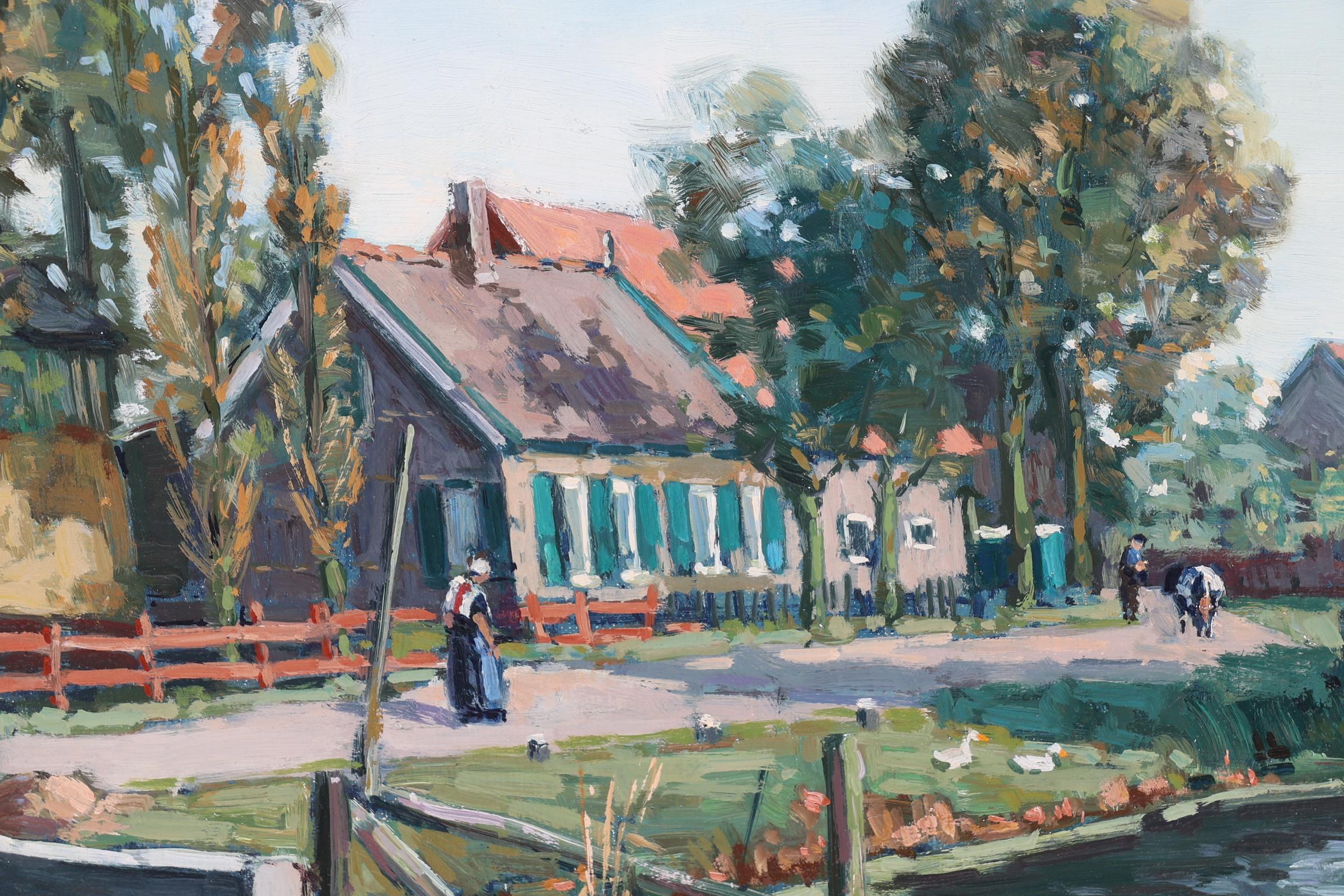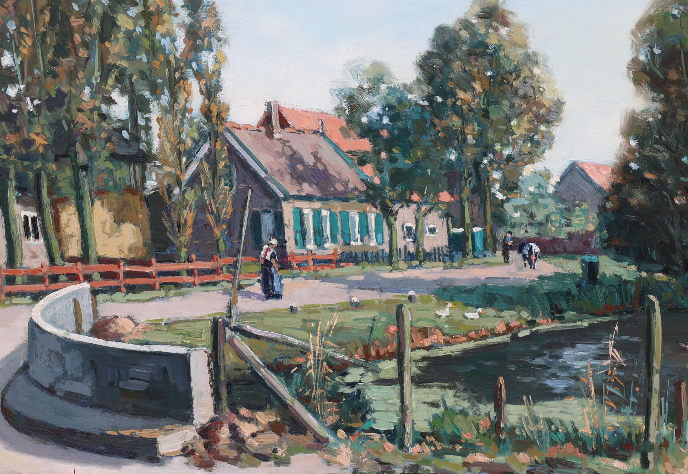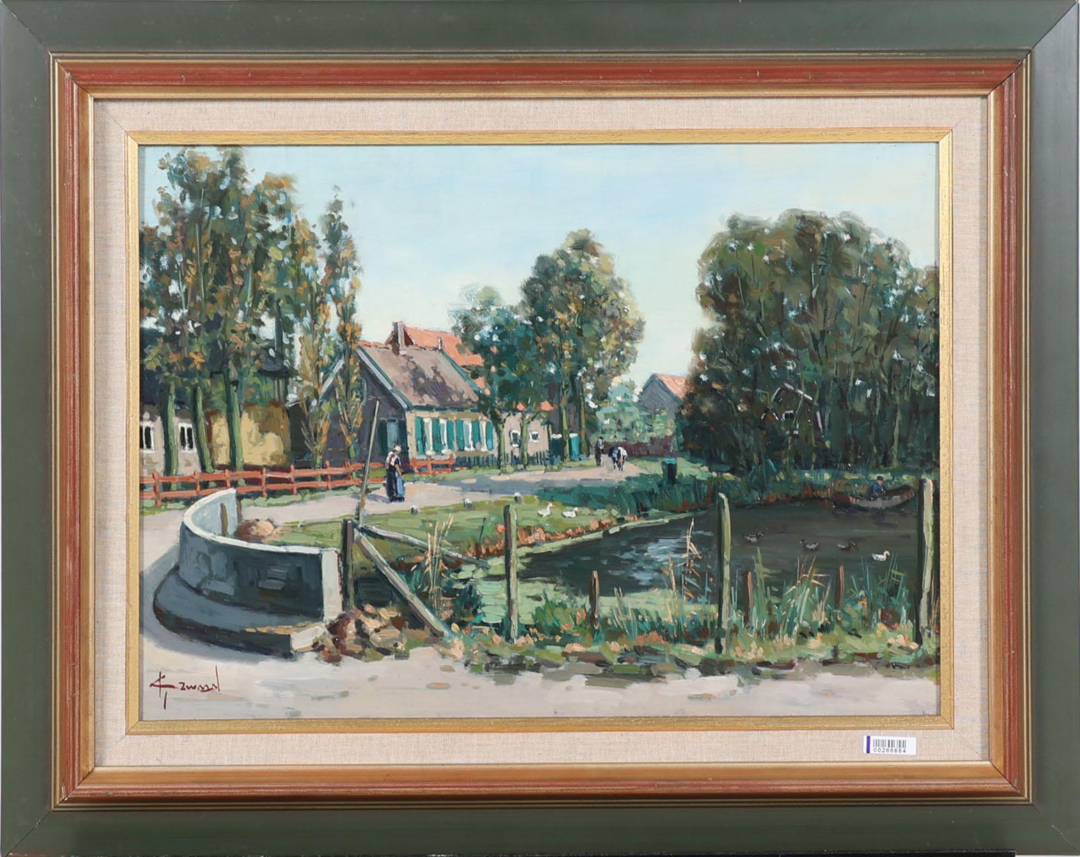 Klaas Zwaan (1922), Dorpsgezicht met personen en eendenvijver, olieverf op doek, 34 x 49 cm.