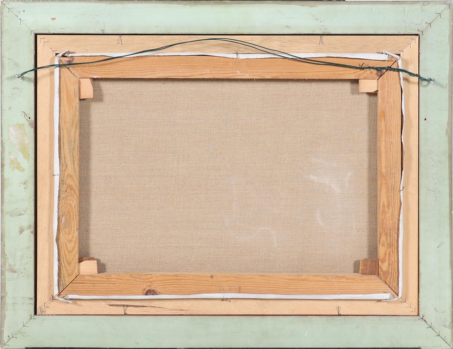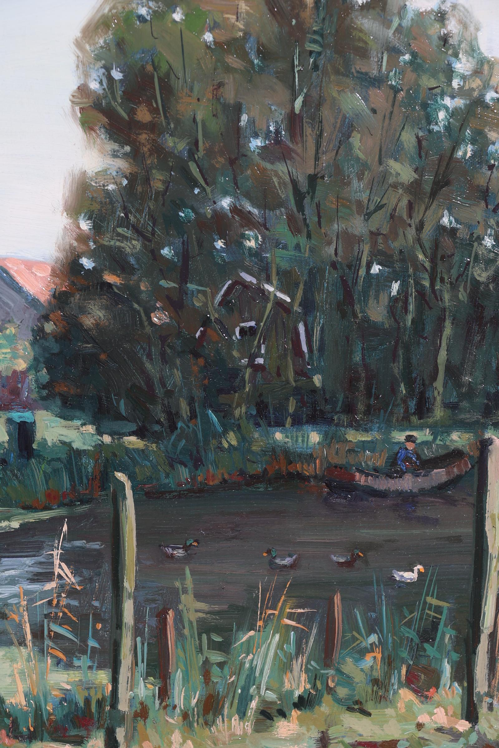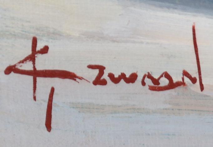 Klaas Zwaan (1922), Dorpsgezicht met personen en eendenvijver, olieverf op doek, 34 x 49 cm.
