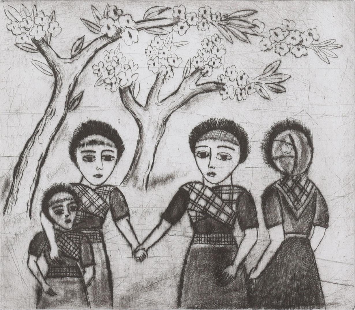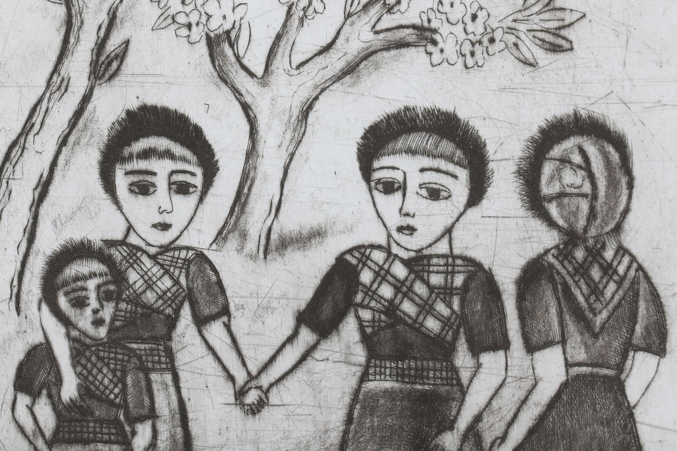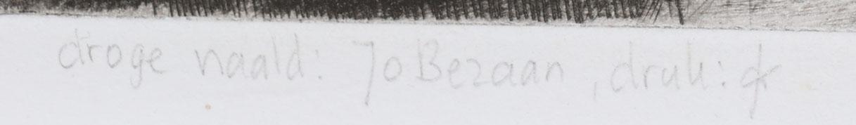 Johan 'Jo' Bezaan (1894-1952), Bloesembomen met personen, handgesigneerde ets, 19 x 21,5 cm.