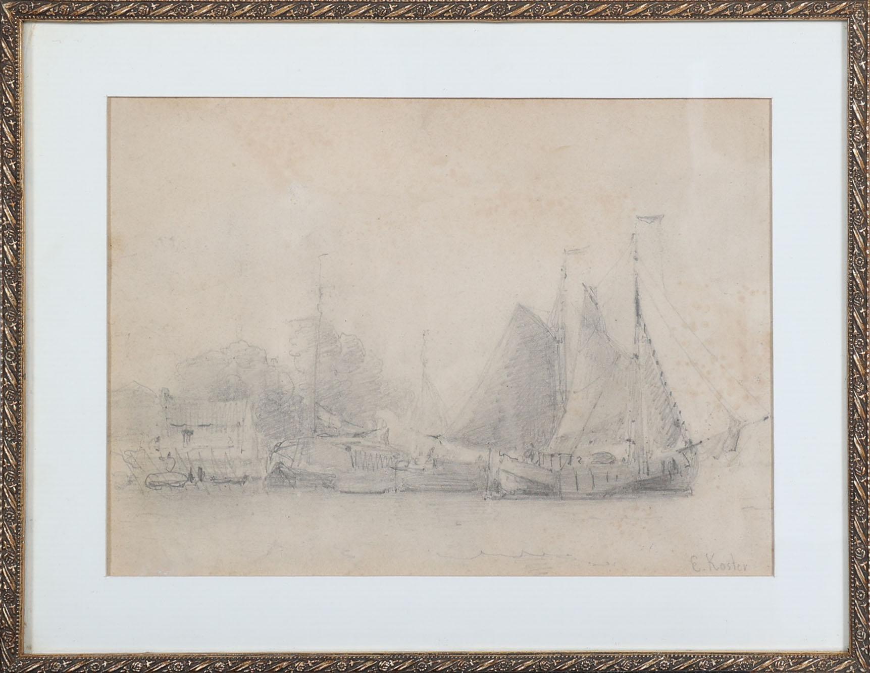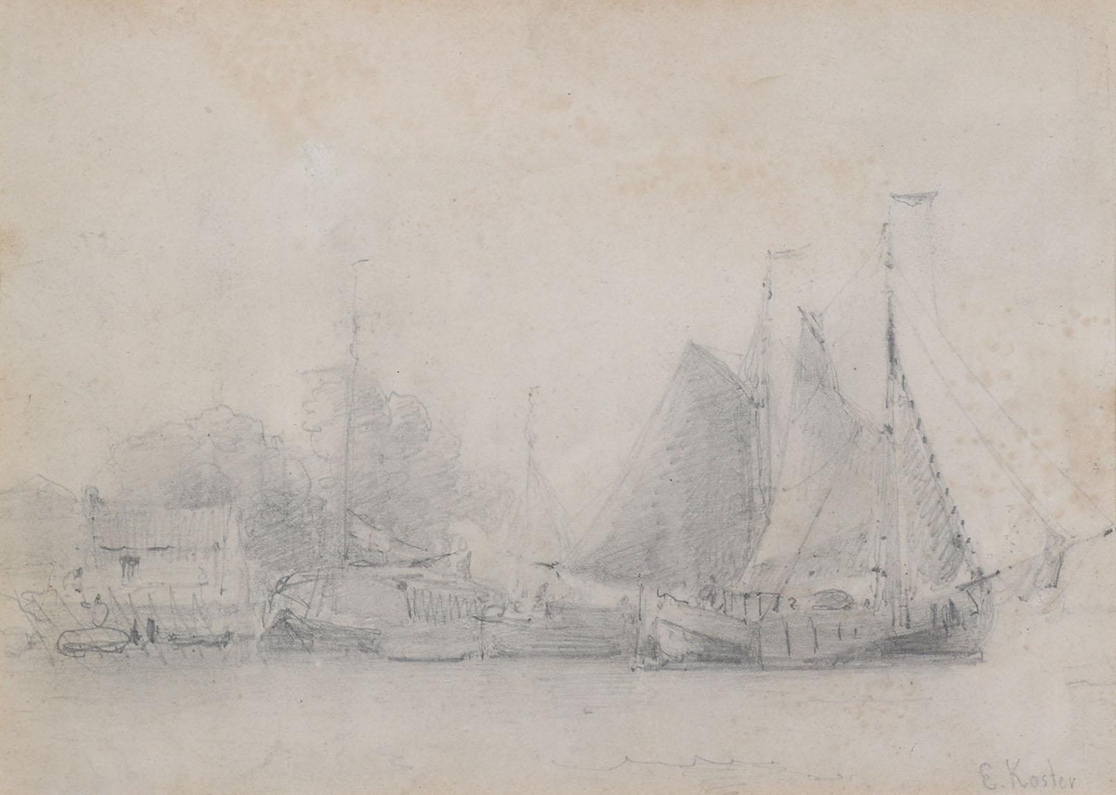 Everhardus Koster (1817-1892), Zeilschepen, handgesigneerde tekening, 20 x 27,5 cm.