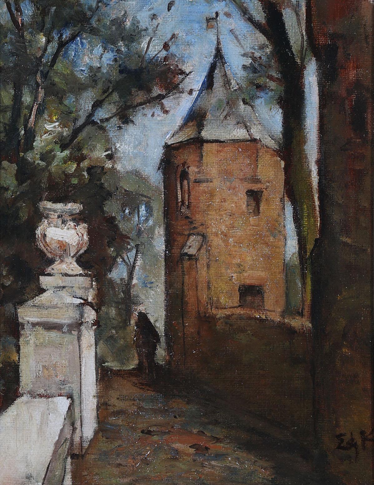 Edzard Willem Koning (1869-1954), Gezicht op een Slot met persoon, marouflé, 22 x 16,5 cm. (lijst beschadigd)