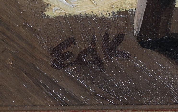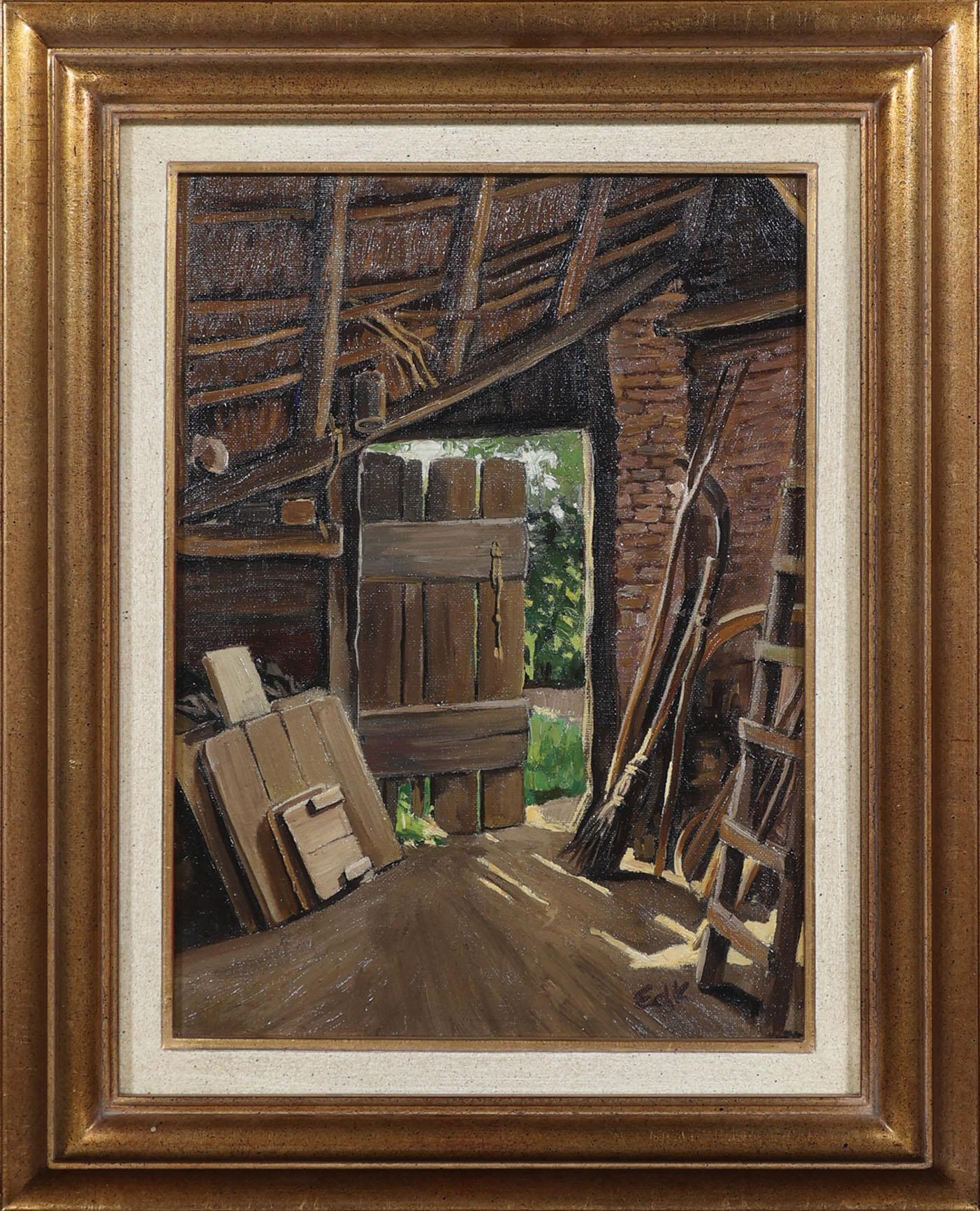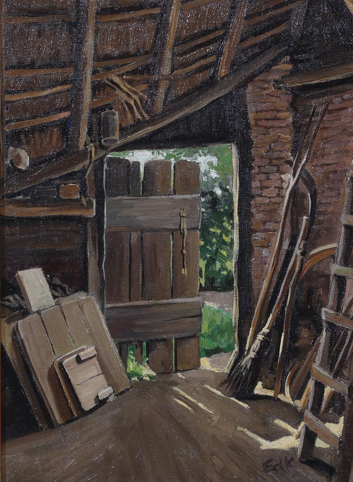 Edzard Willem Koning (1869-1954), Interieur van een schuur, marouflé, 33 x 24 cm.