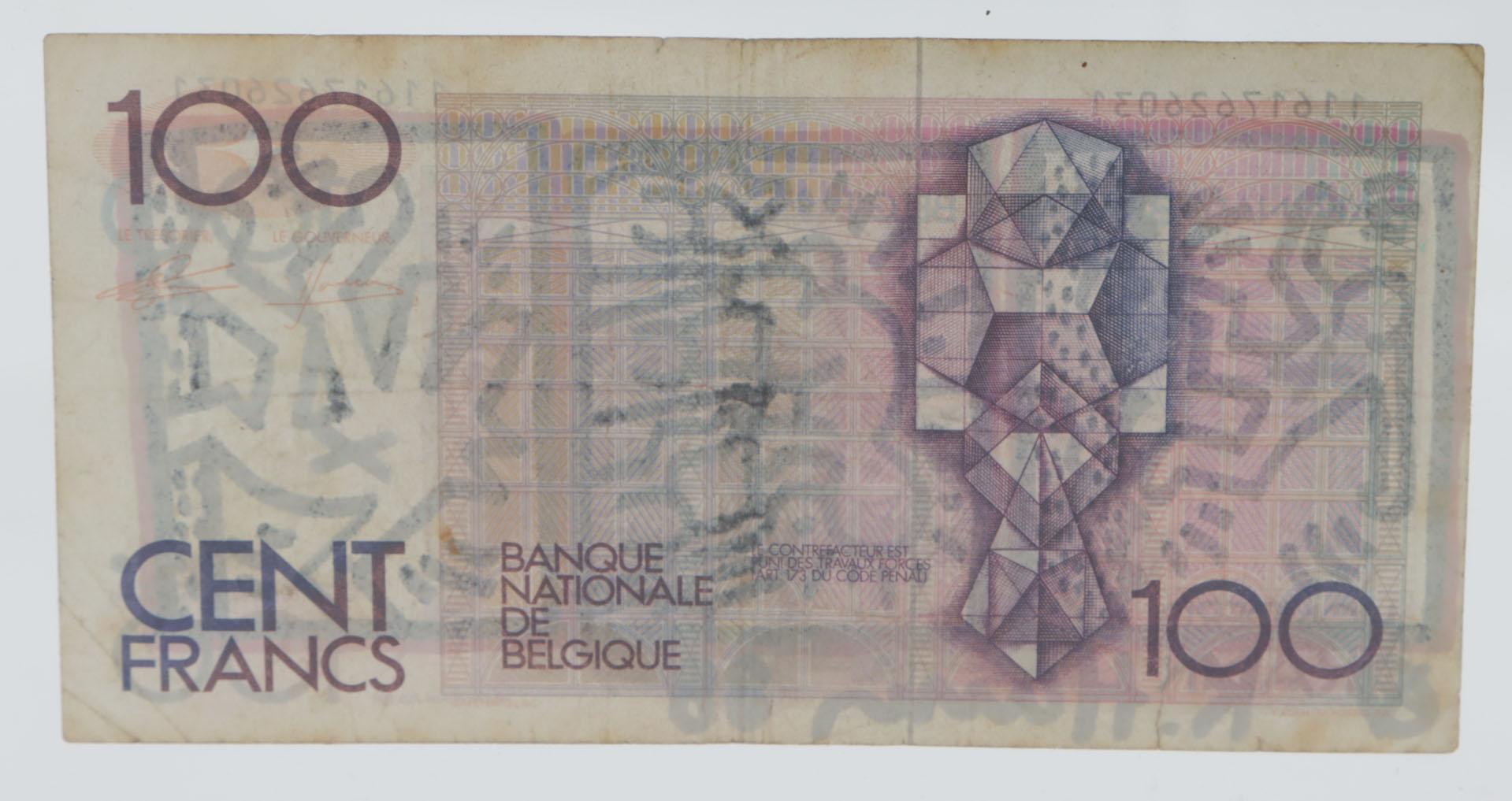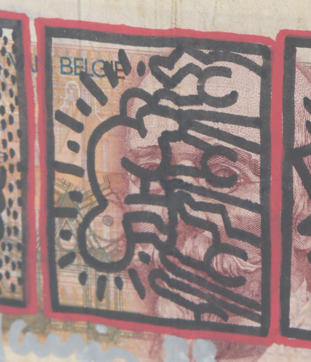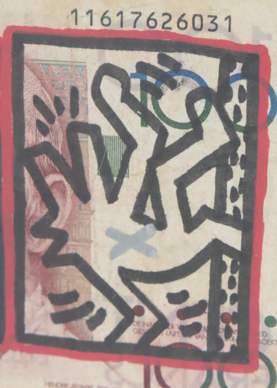Keith Haring (1958-1990), 100 Frank biljet met originele tekening, gesigneerd en gedateerd '88, in plexiglazen houder, 13 x 18 x 2 cm.