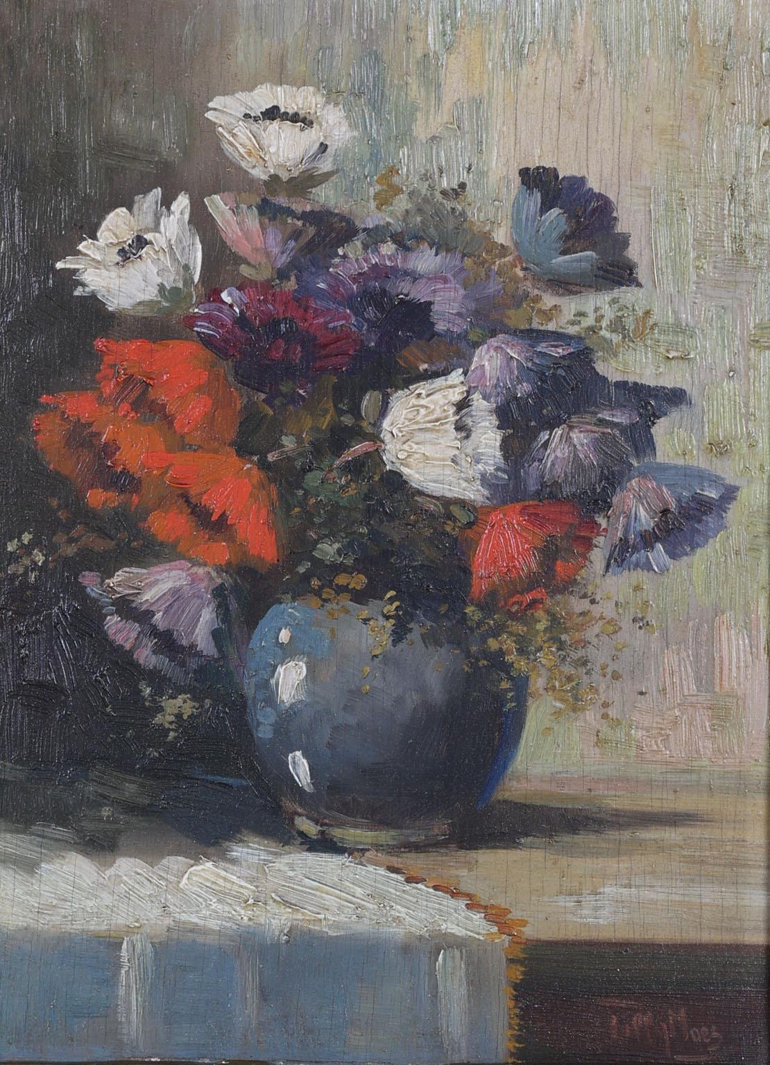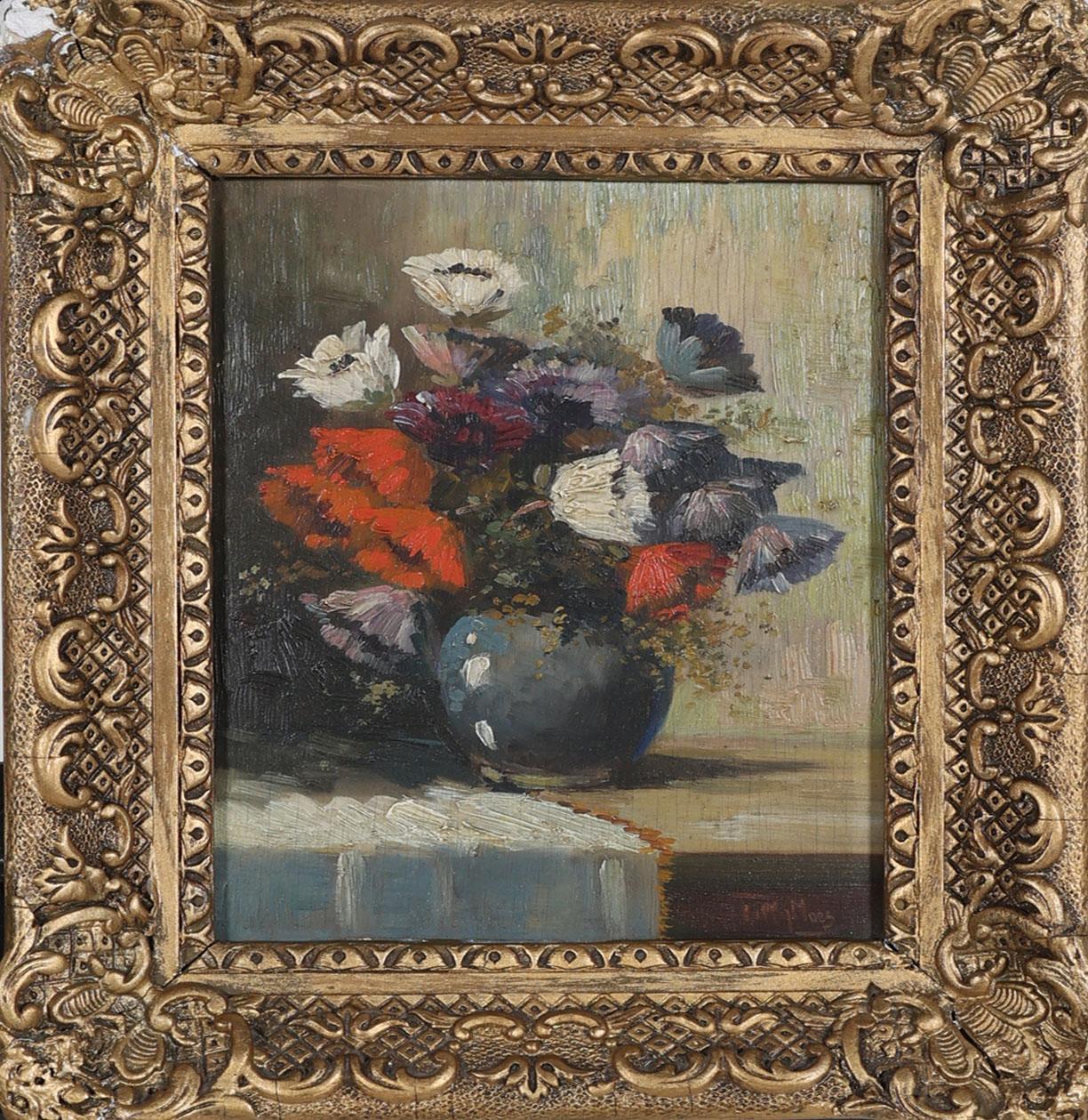 Tilly Moes (1899-1979), Bloemstilleven, olieverf op paneel, 19,5 x 14 cm. (lijst defect)