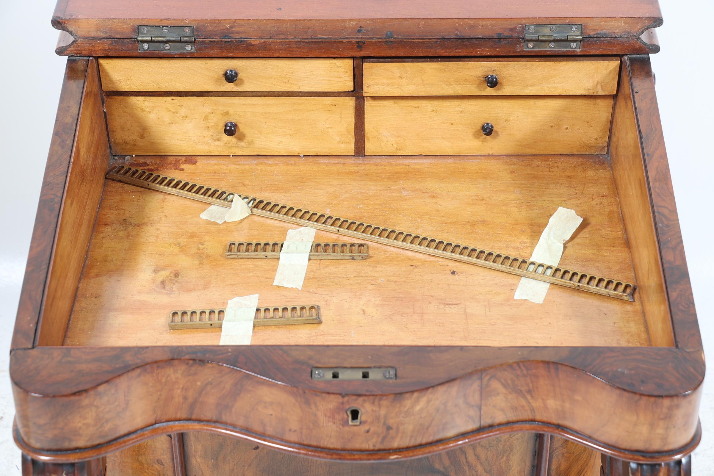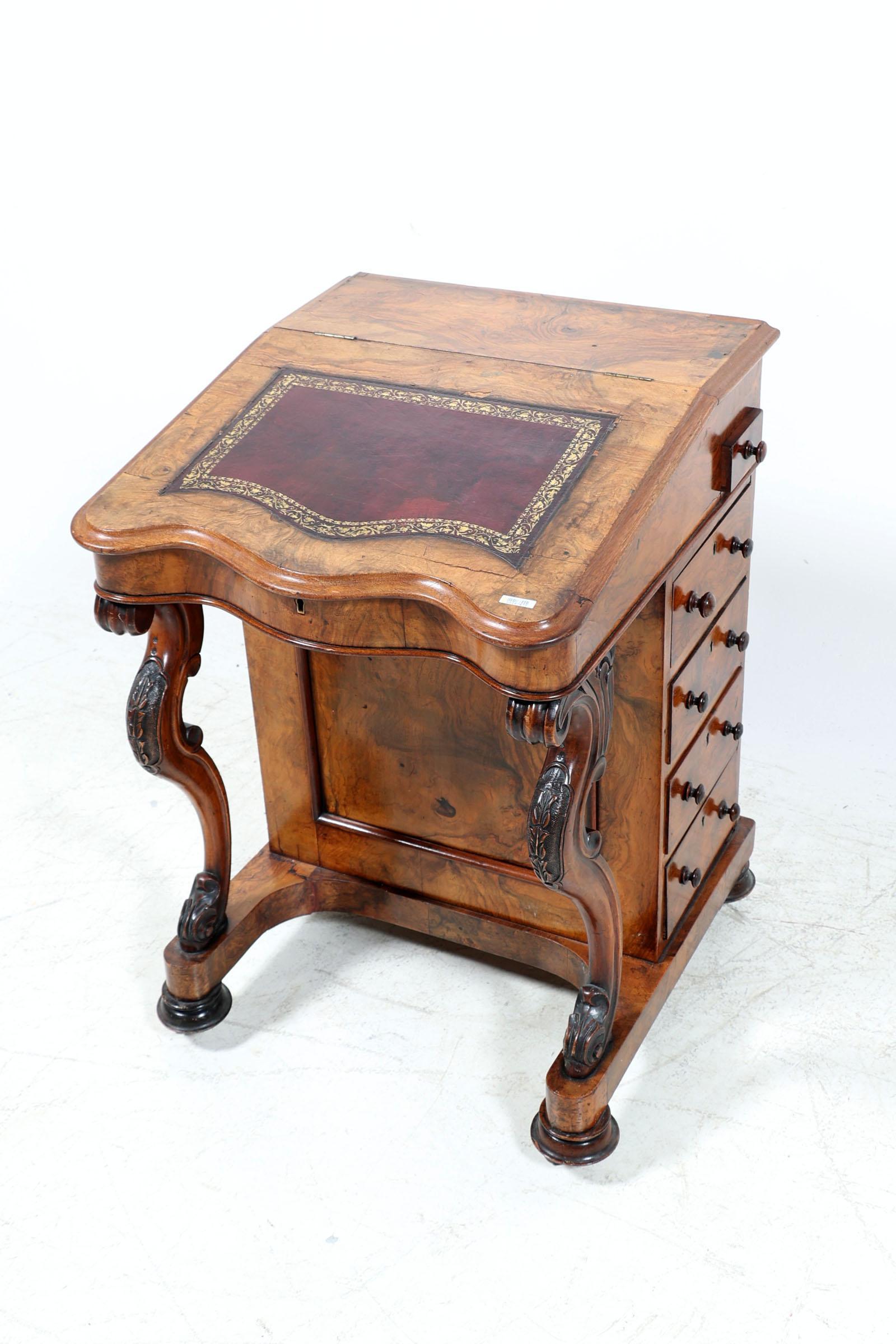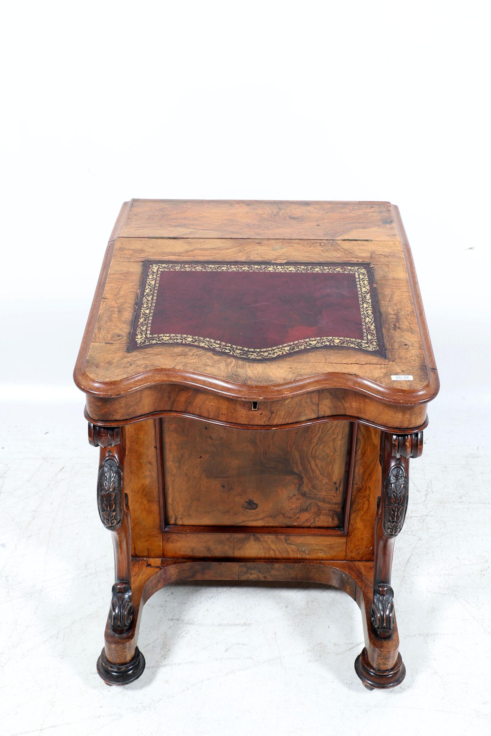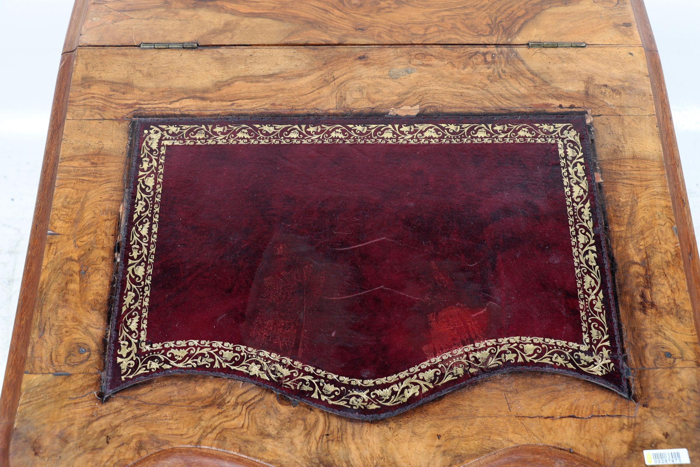 Antieke wortelnotenhouten davenport met rood lederen blad, h.80 x b.56 x d.57 cm.