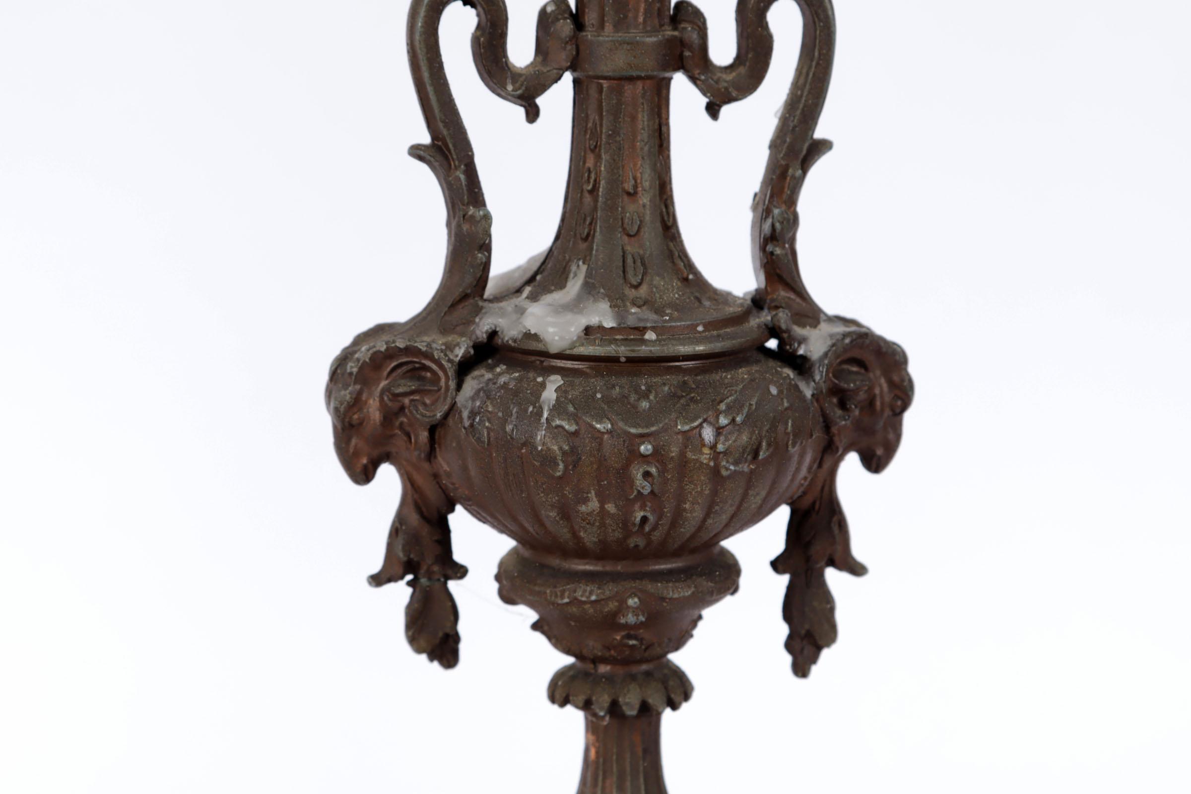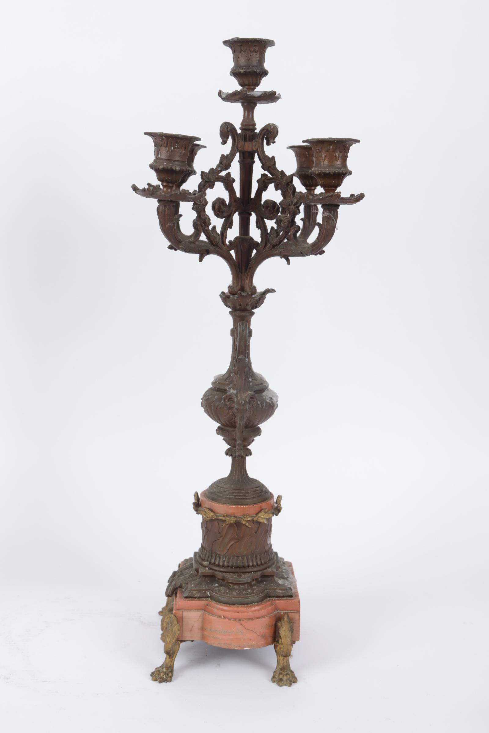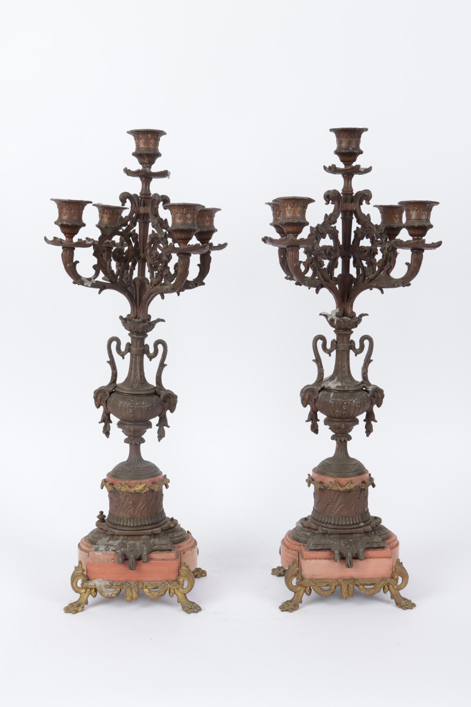 Set van 2 legering 5-lichts kandelaars op roze marmeren voetstuk, h.51 cm.