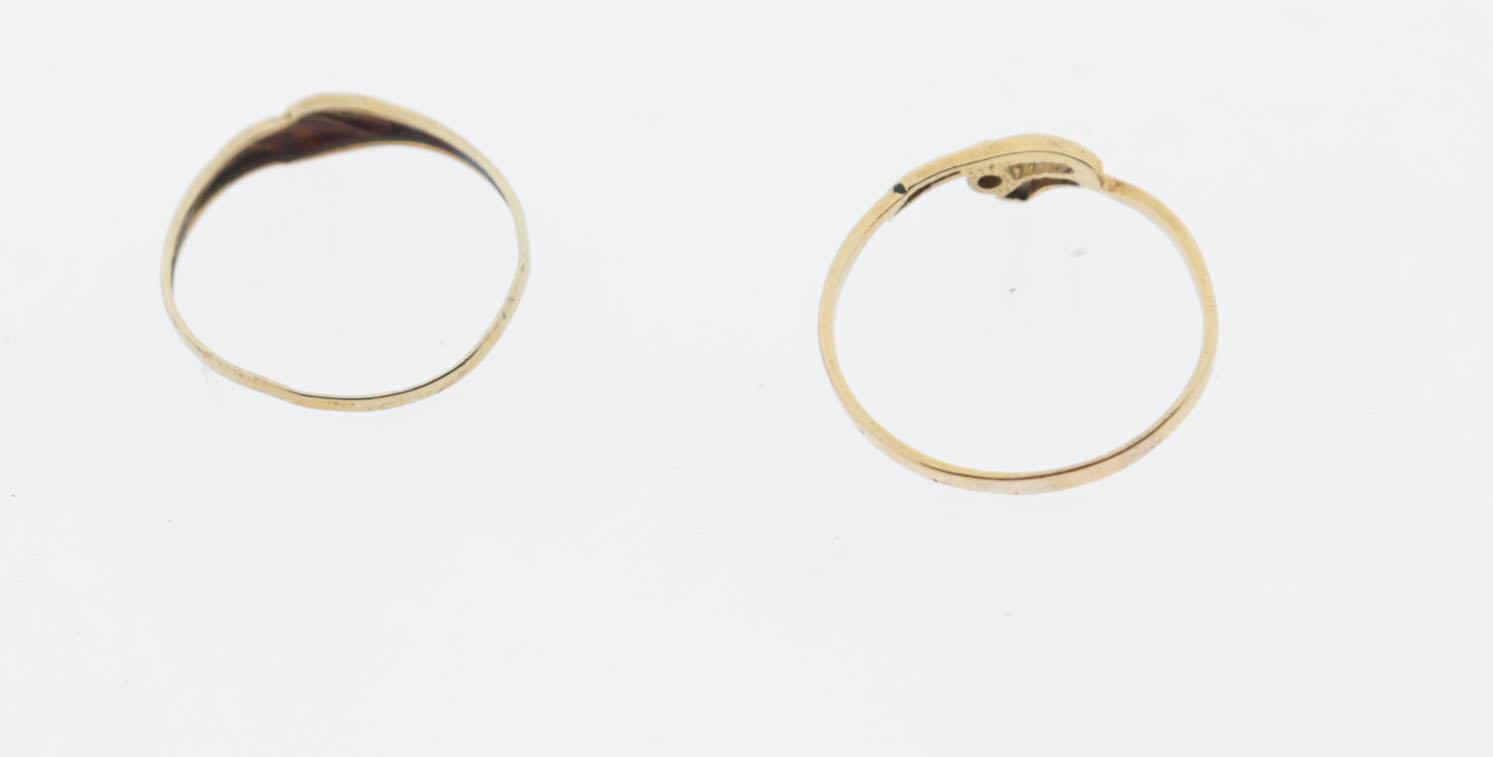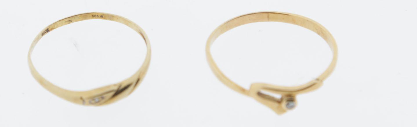 Twee 14 kt. gouden ringen bezet met briljant, diam.17 en 18 mm.