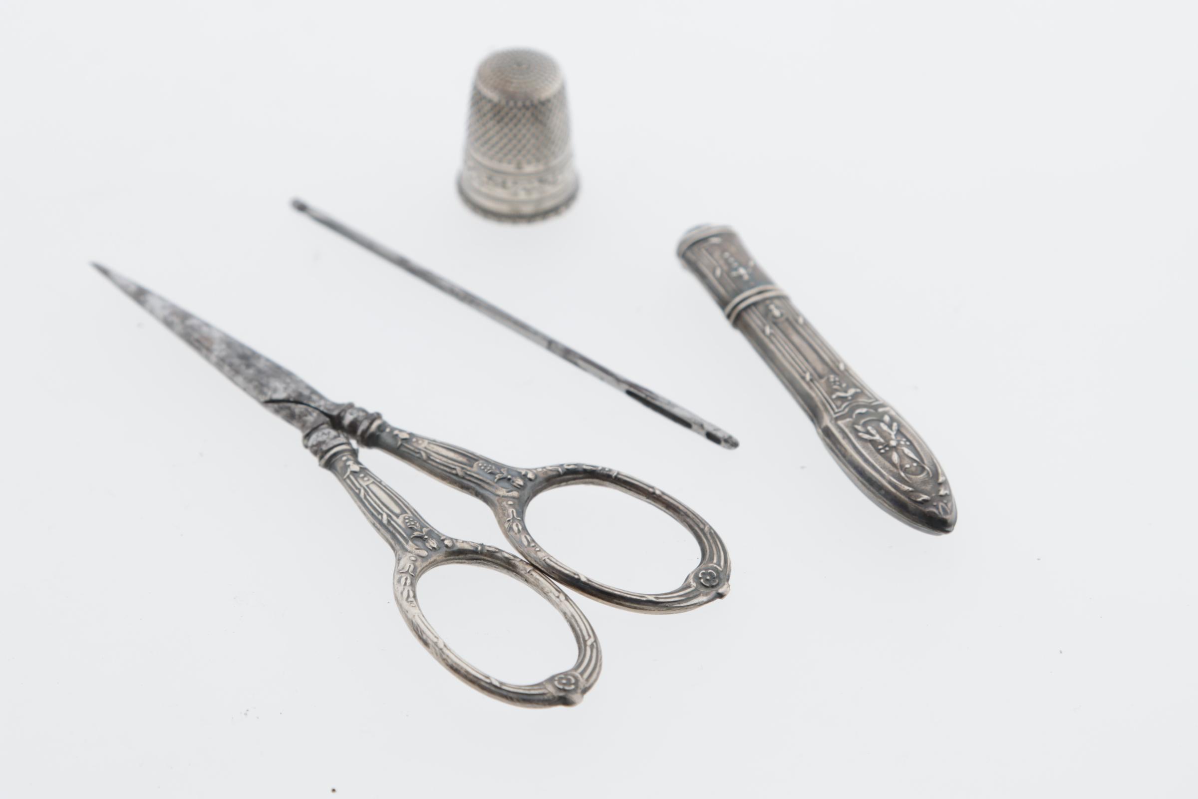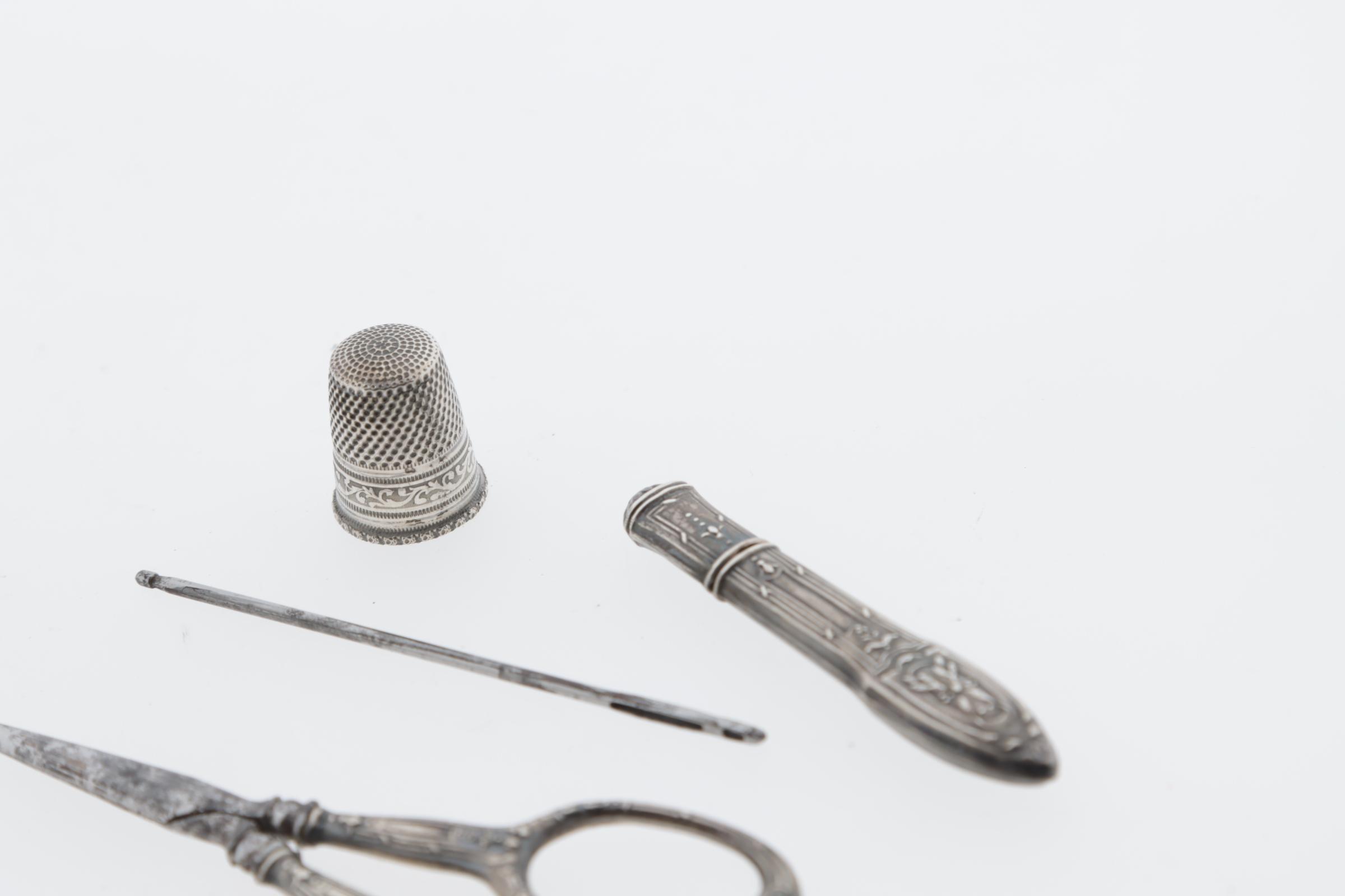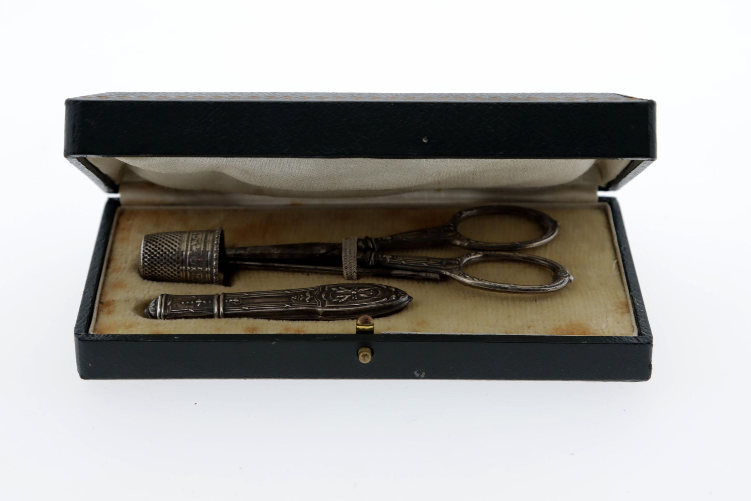 Antiek zilveren naaisetje w.o. naaldenkoker, schaartje, vingerhoed en naald in doosje
