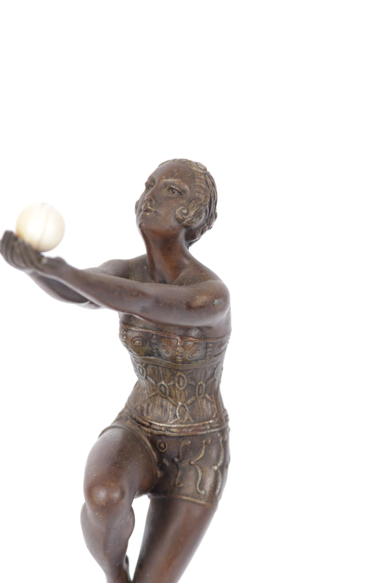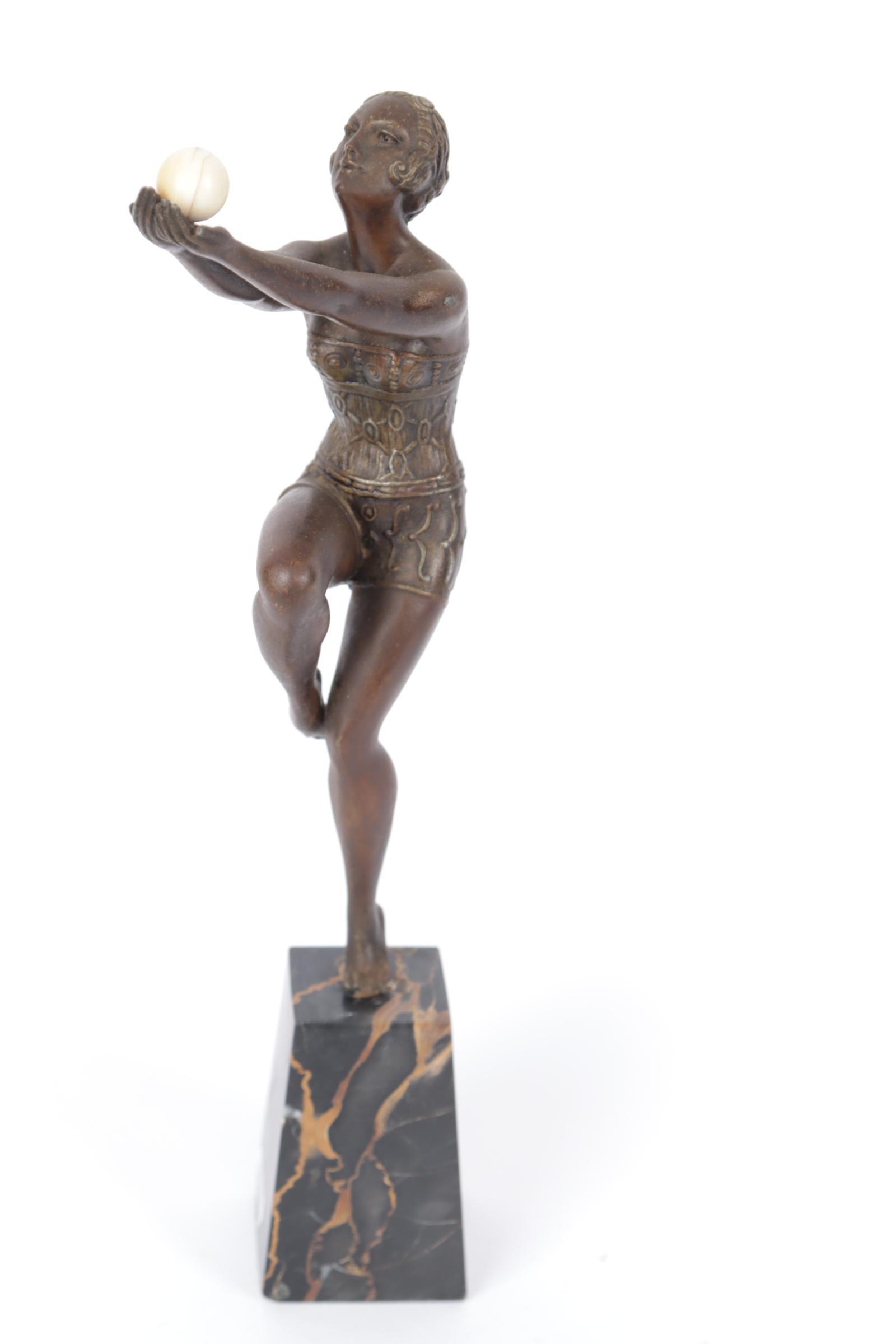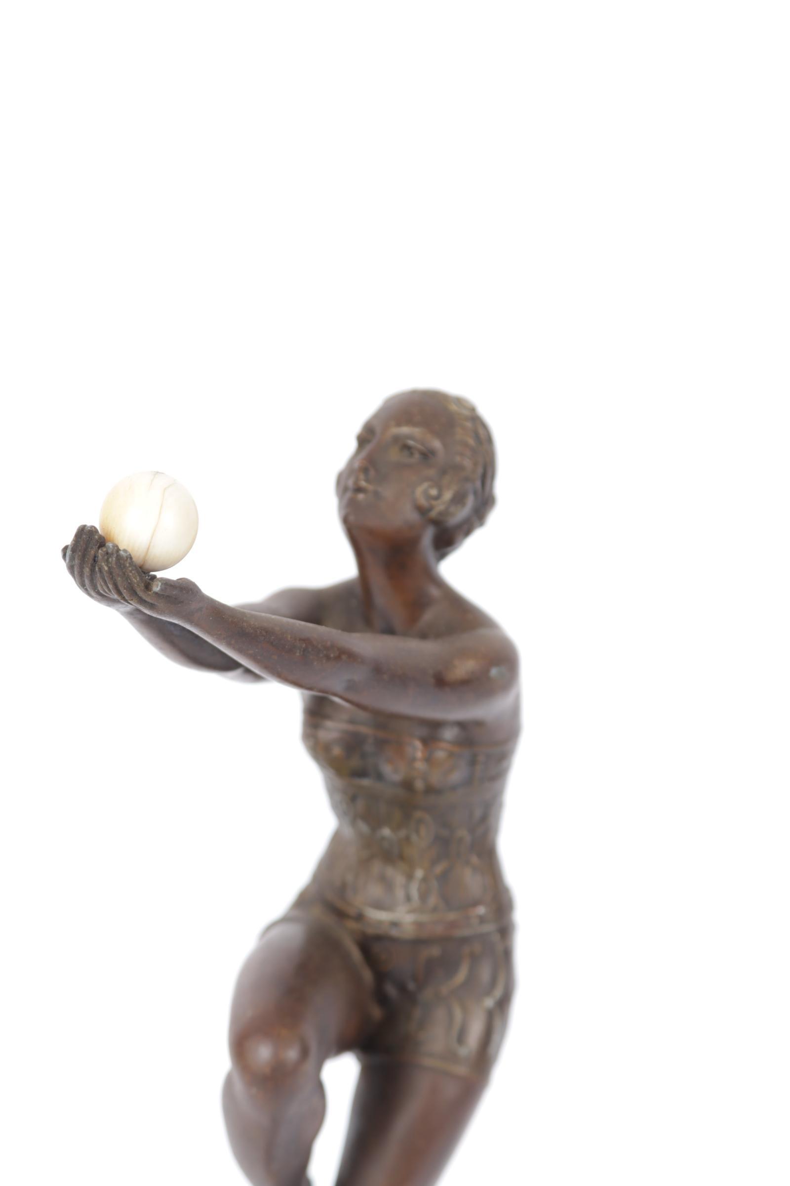Art Deco beeld van een danseres op marmeren voetstuk, h.