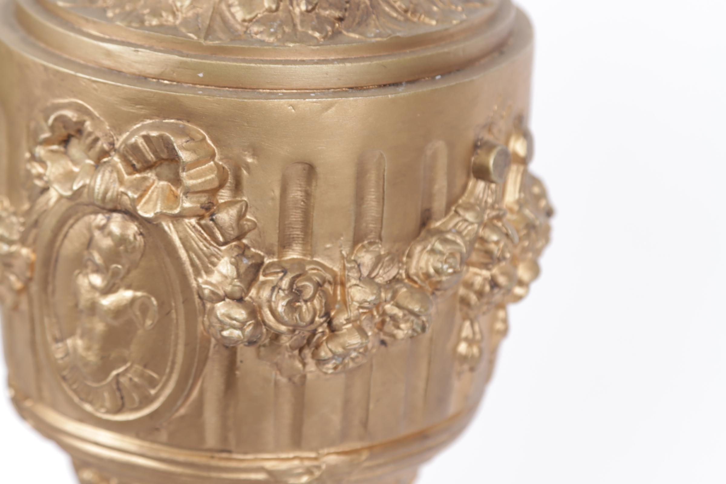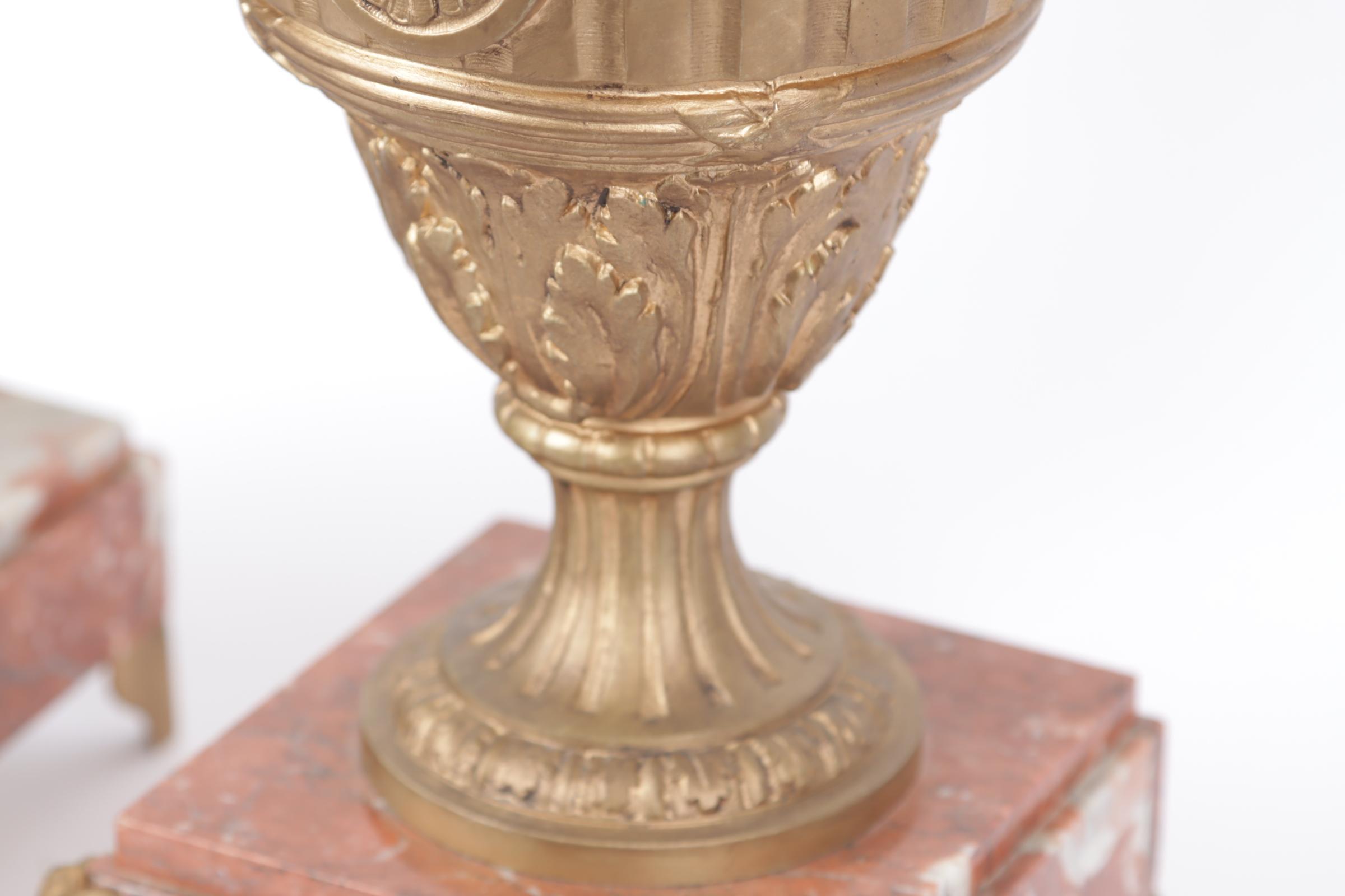 2 goudkleurige metalen vazen op rood marmeren voetstuk, h. (1 vaas los van voet)
