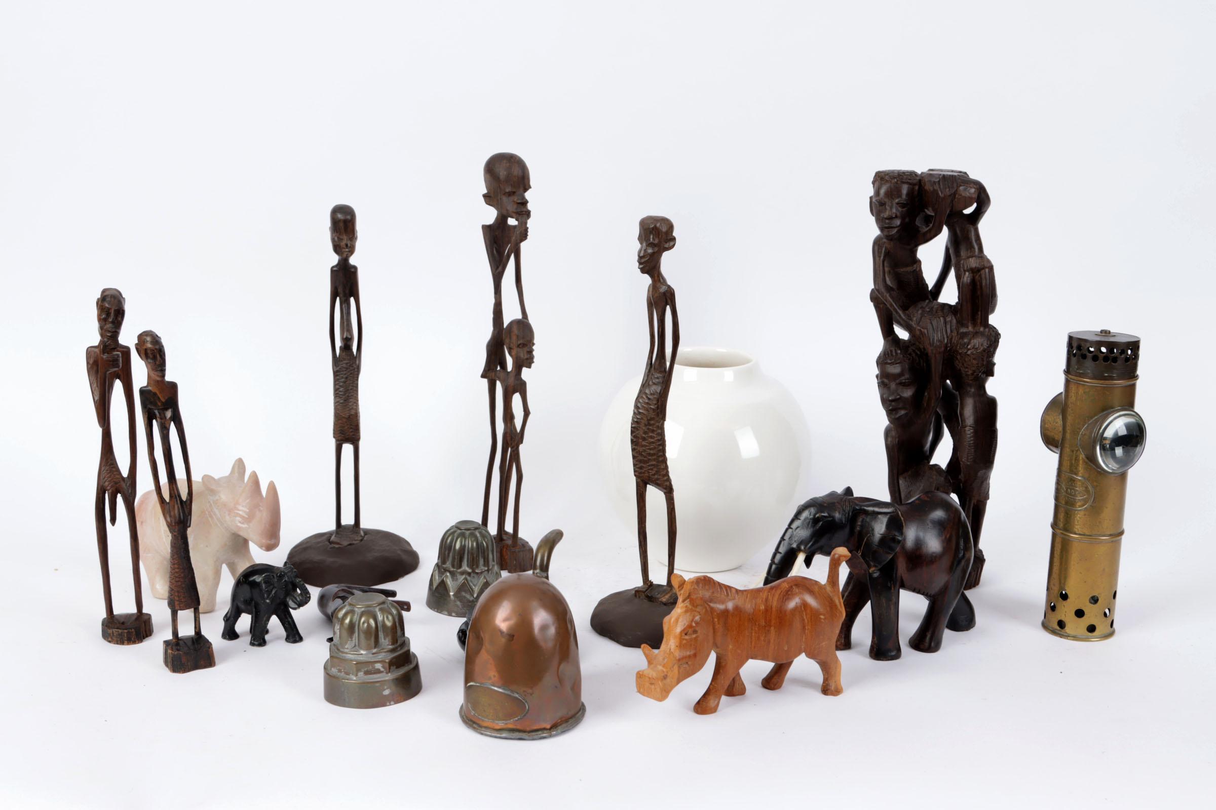 Koop diverse Afrikaanse beelden, divers koper en een Delftse witte vaas