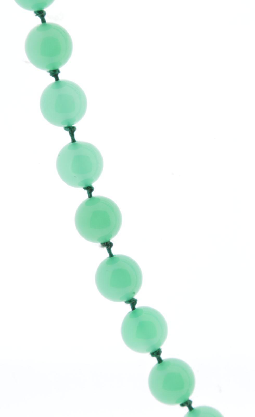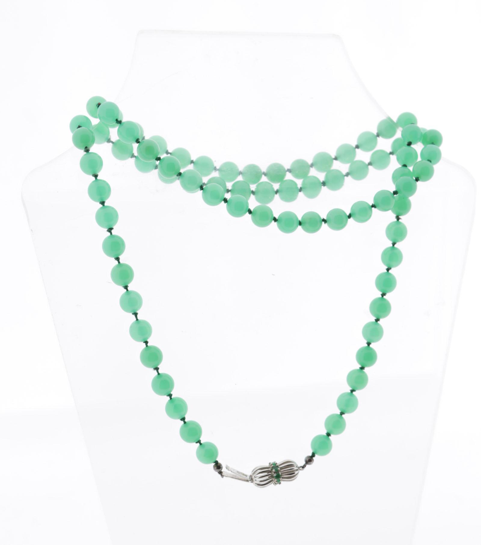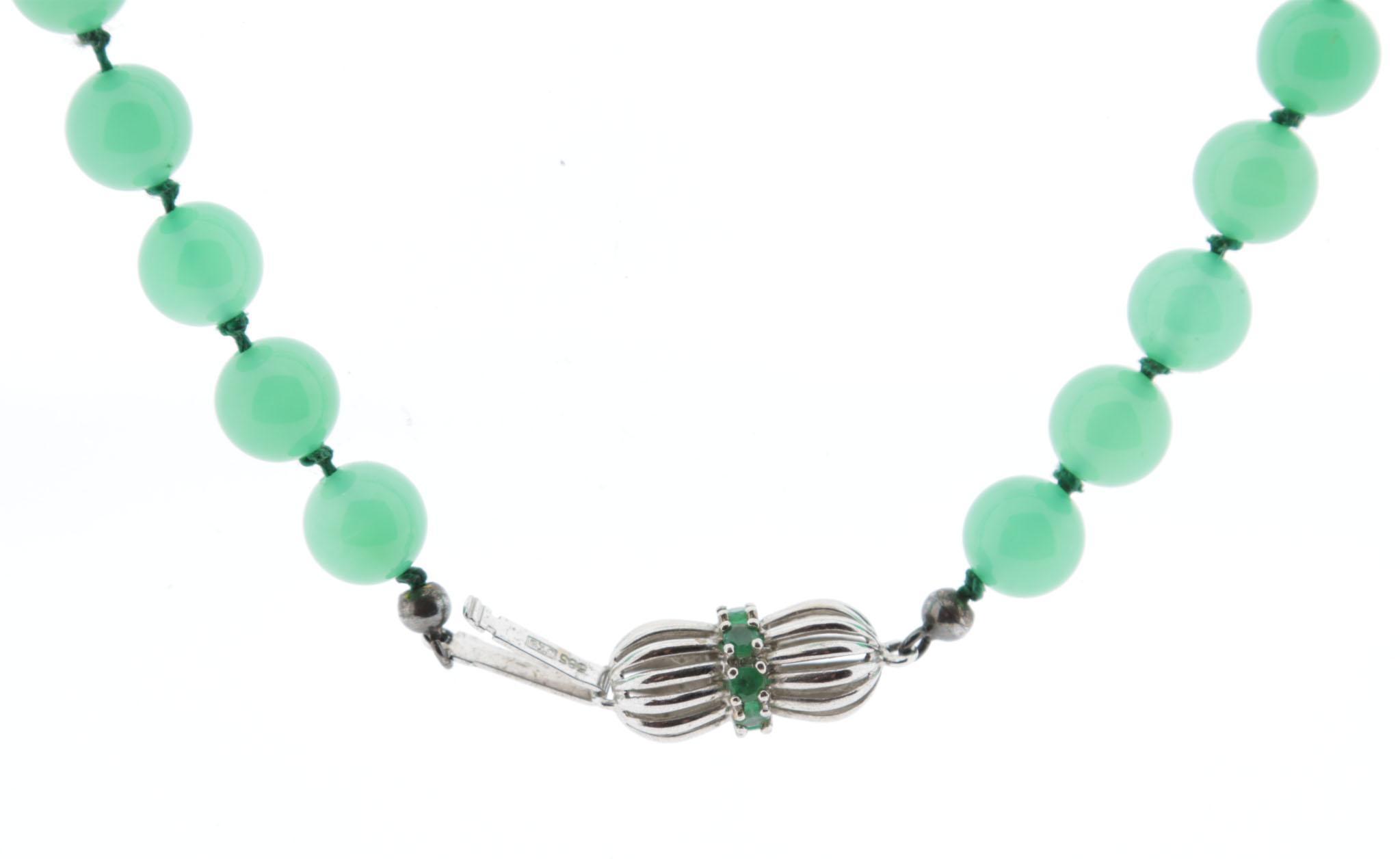 Groen topaas collier met witgouden slot bezet met smaragd, L.76 cm.