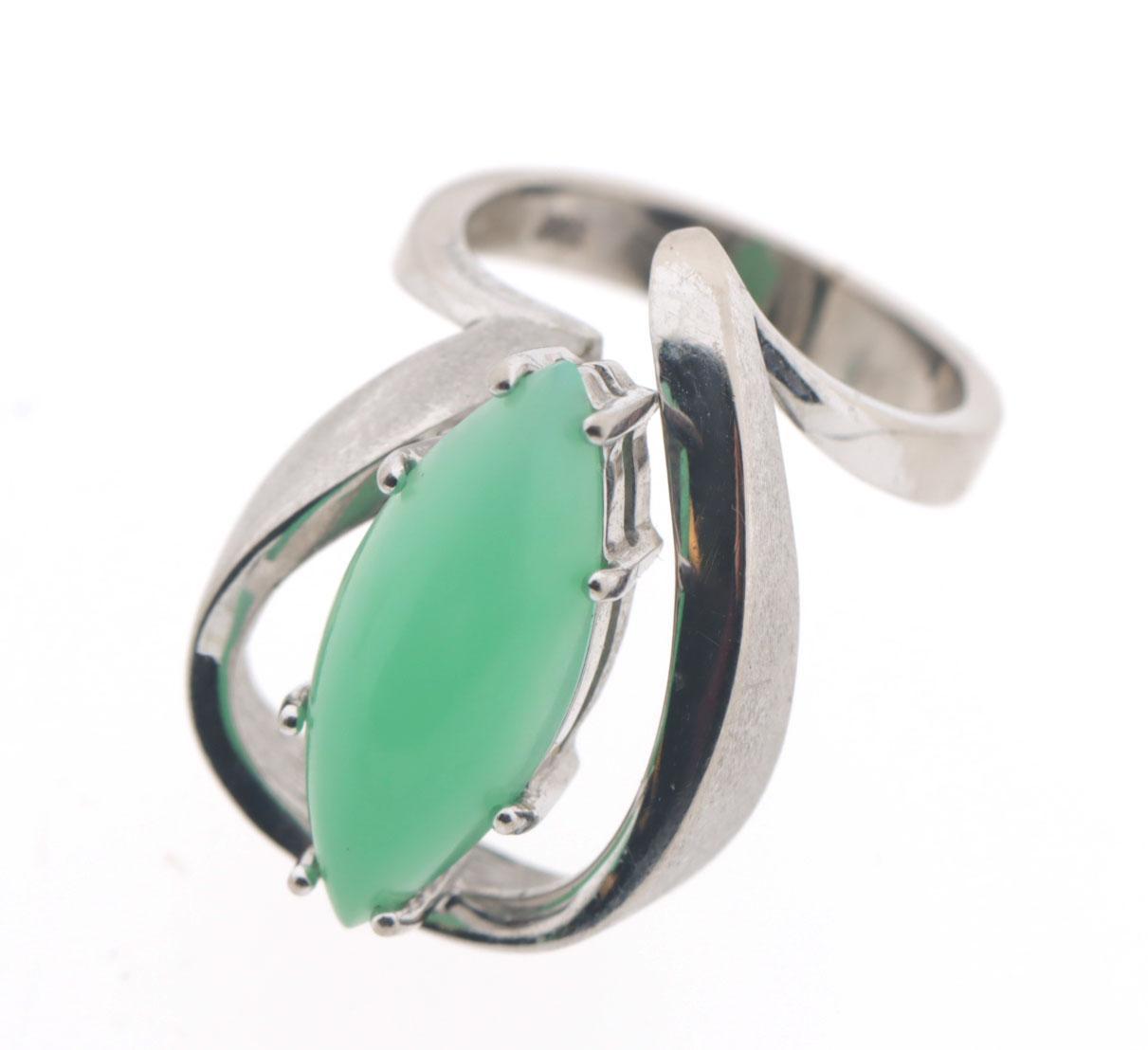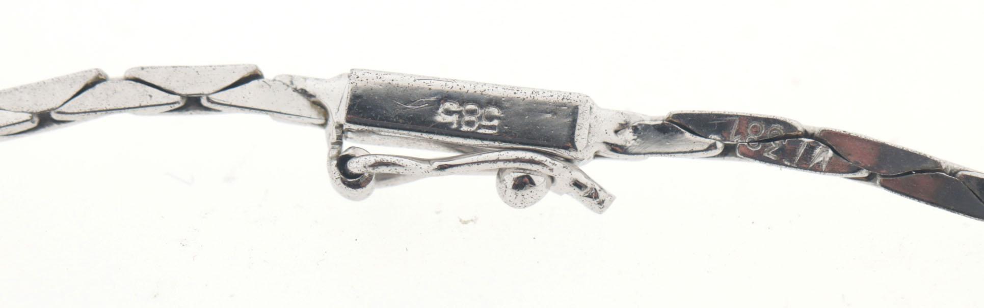 14 Kt. witgouden collier met groene topaas hanger bezet met 3 briljant geslepen diamanten, bijpassende ring bezet 6 briljant geslepen diamanten en groene topaas, 14 kt gouden ring bezet met topaas en bijpassende broche, totaal 39,4 gram