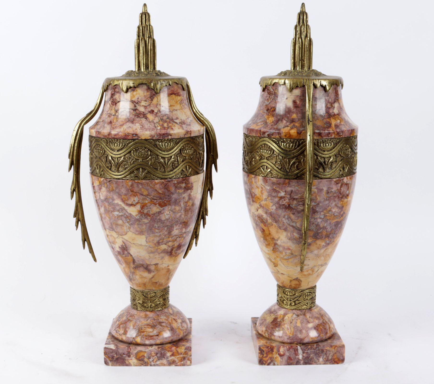 2 Roze marmeren met messing Art Deco casolettes, h.