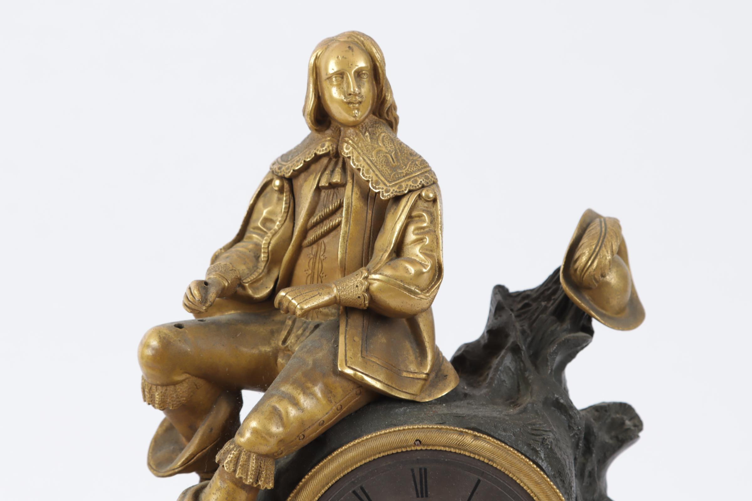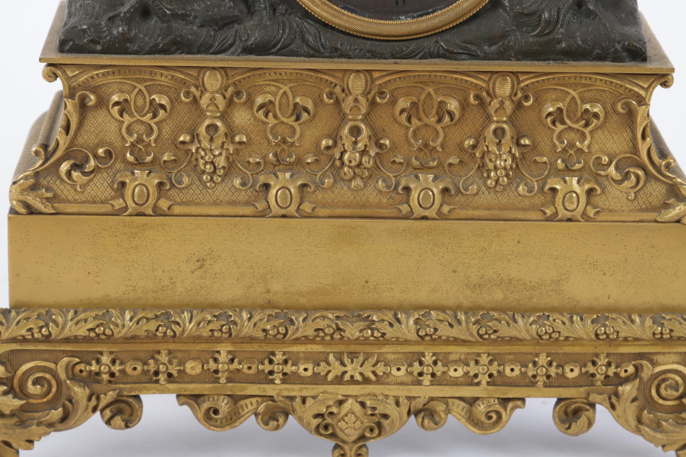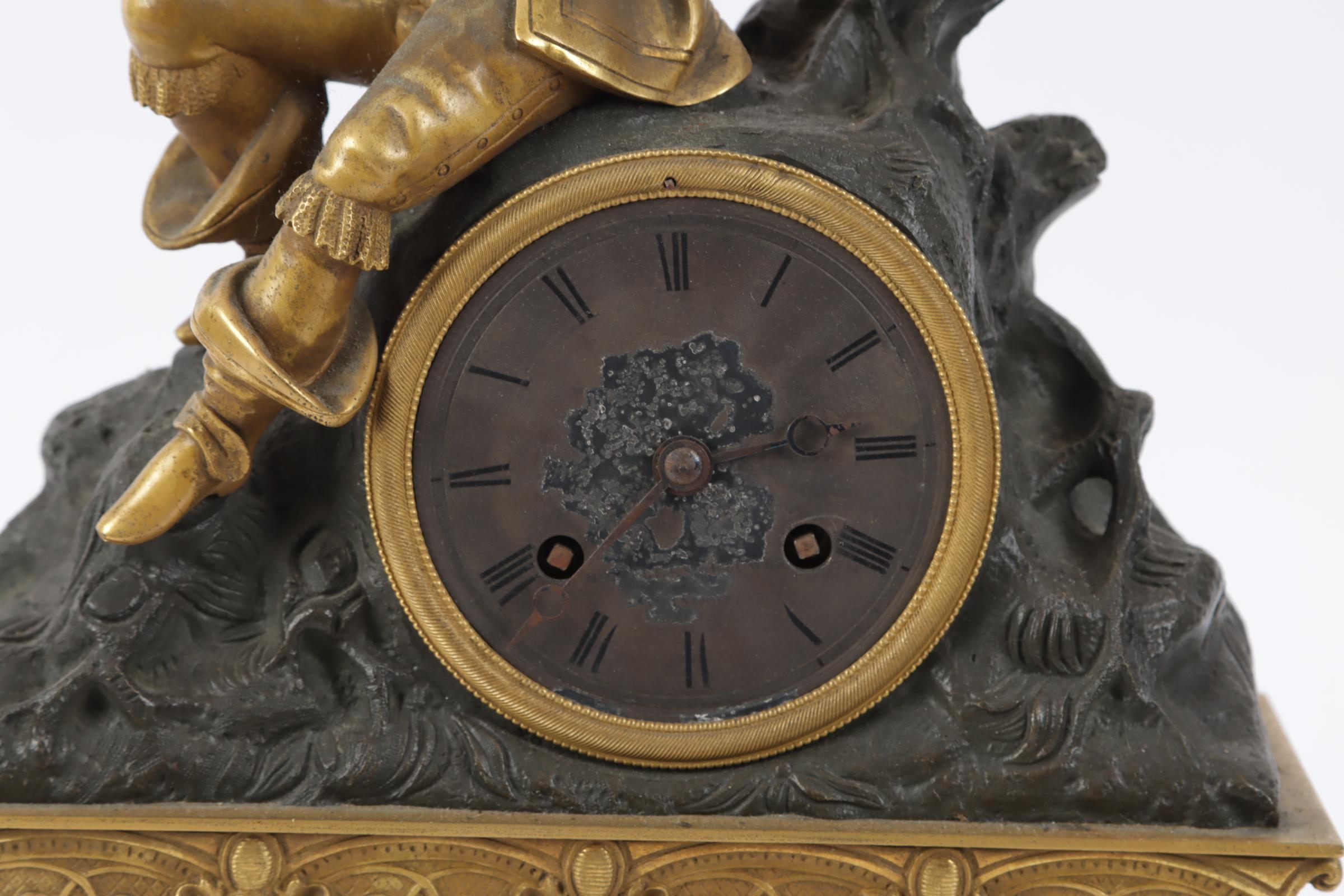 Antieke deels verguld bronzen pendule met bovenop het uurwerk een rustende man, Frankrijk, 19e eeuw, h.