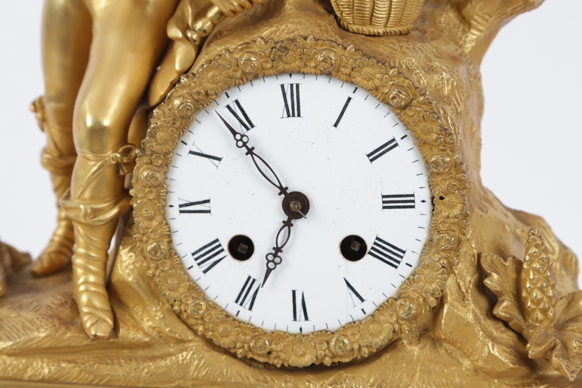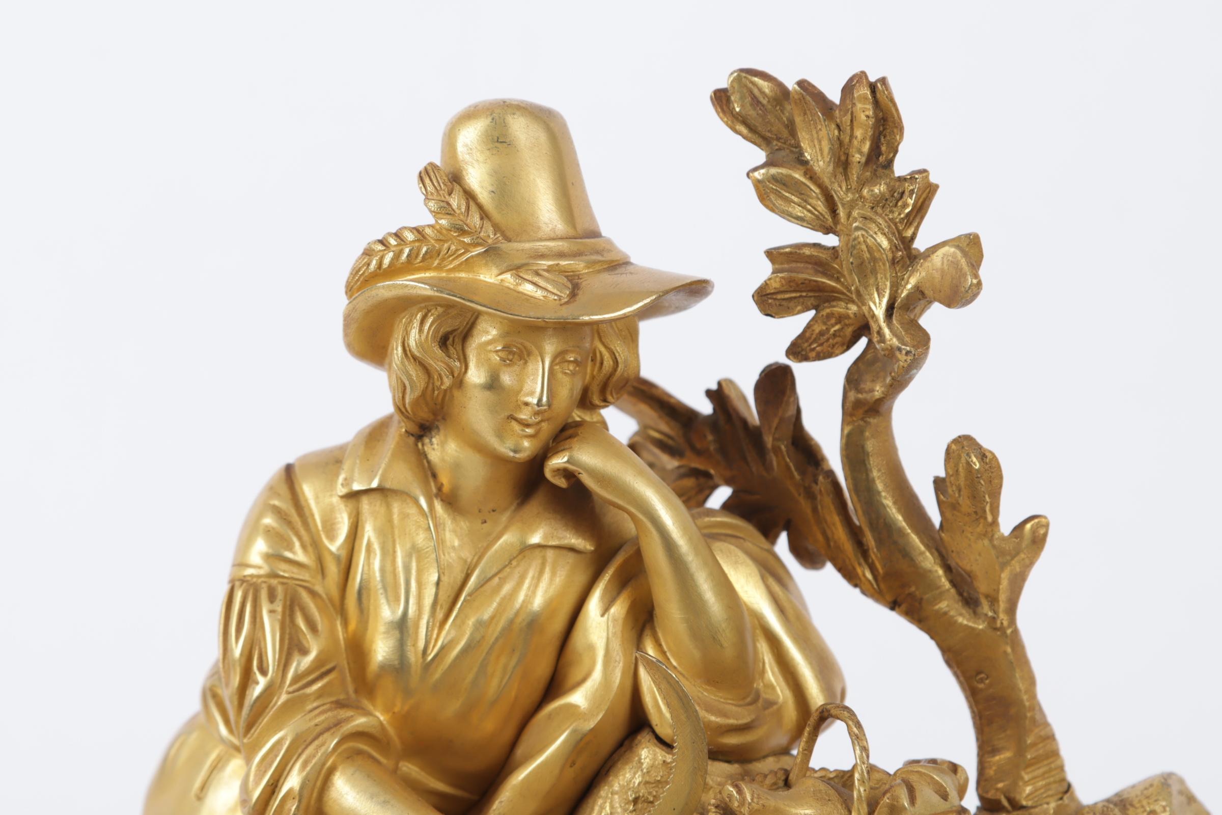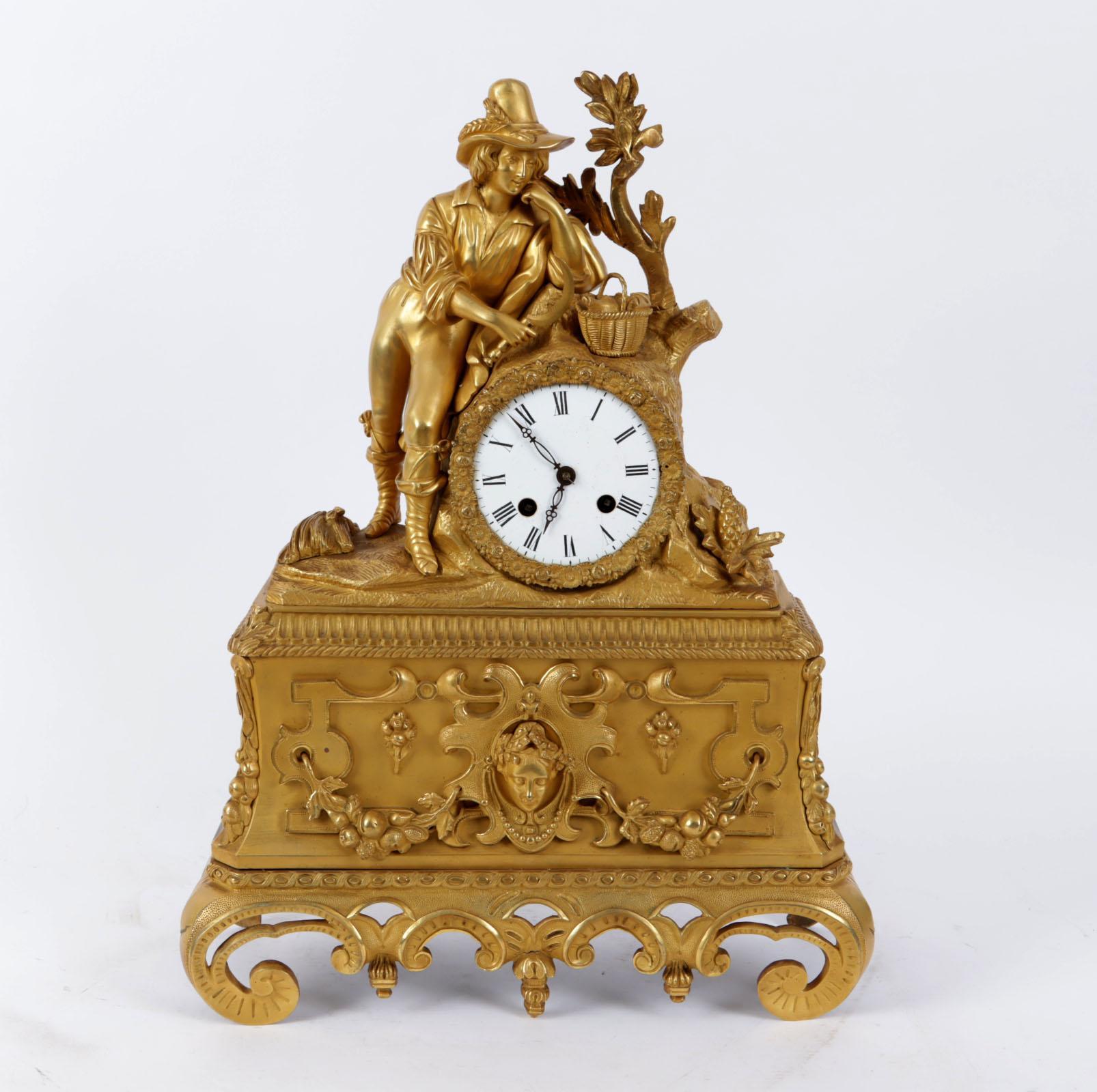 Antieke verguld bronzen pendule met naast het uurwerk een rustende man, Frankrijk, 19e eeuw, h.