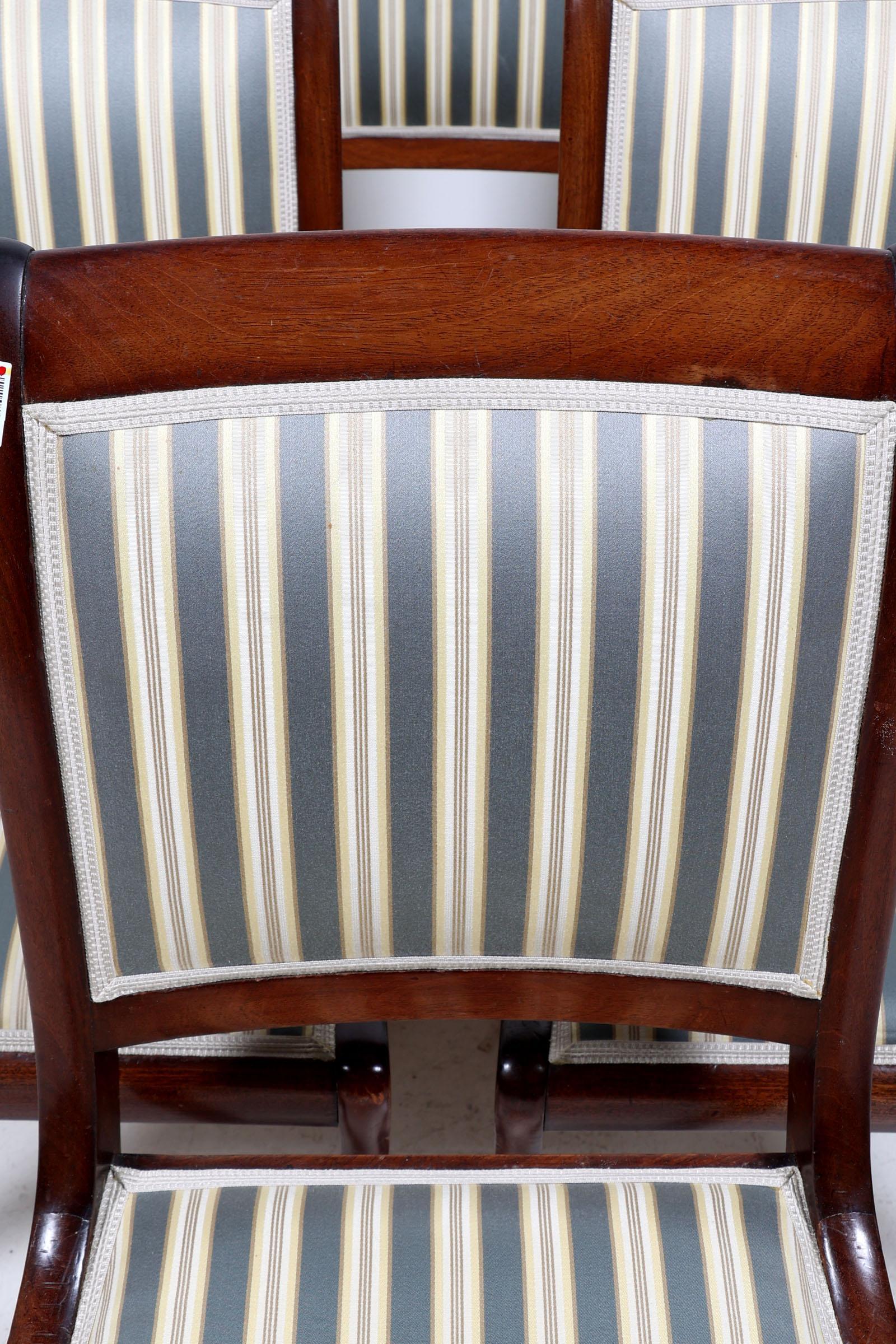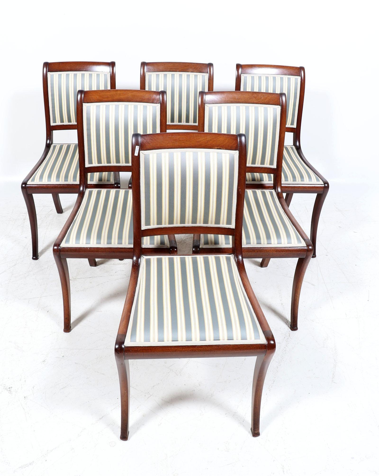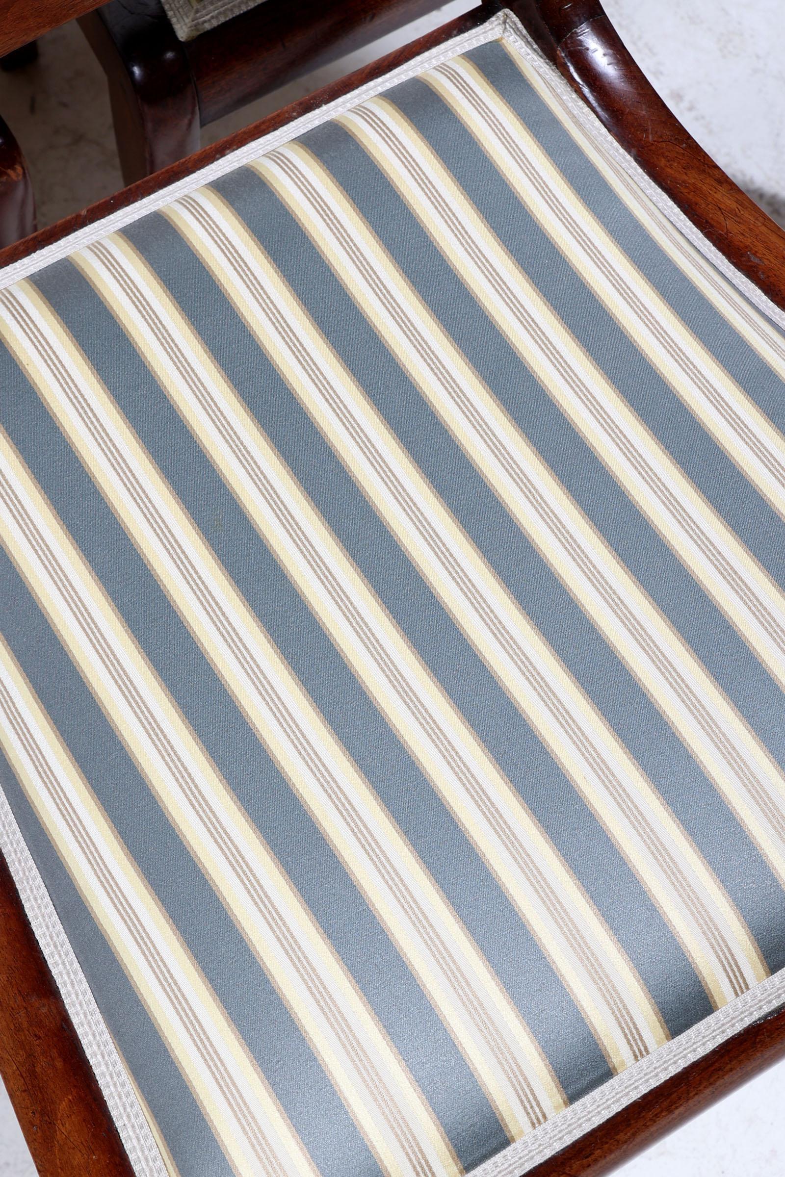 Set van 6 antieke mahoniehouten stoelen met zadelpoten en grijs/blauw gestreepte stof bekleed