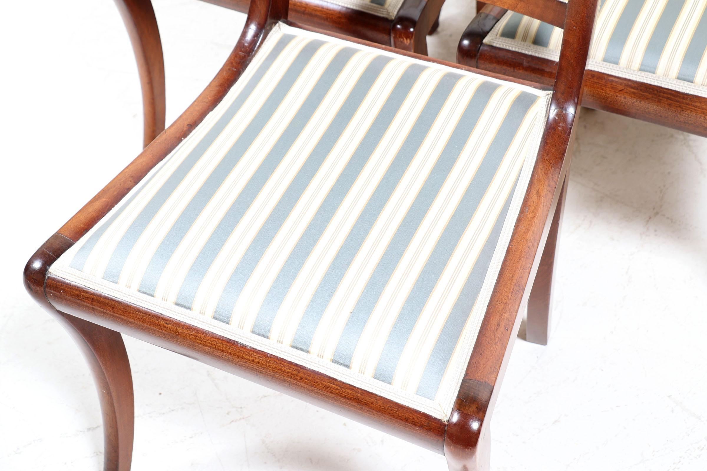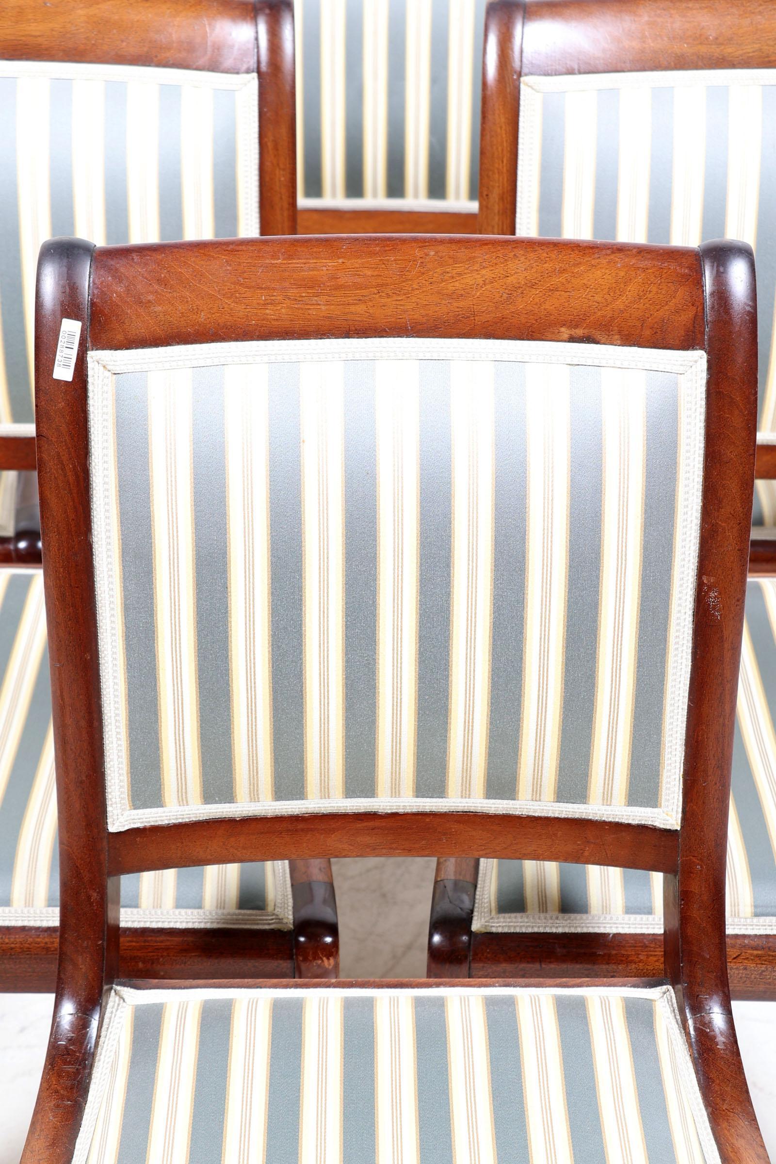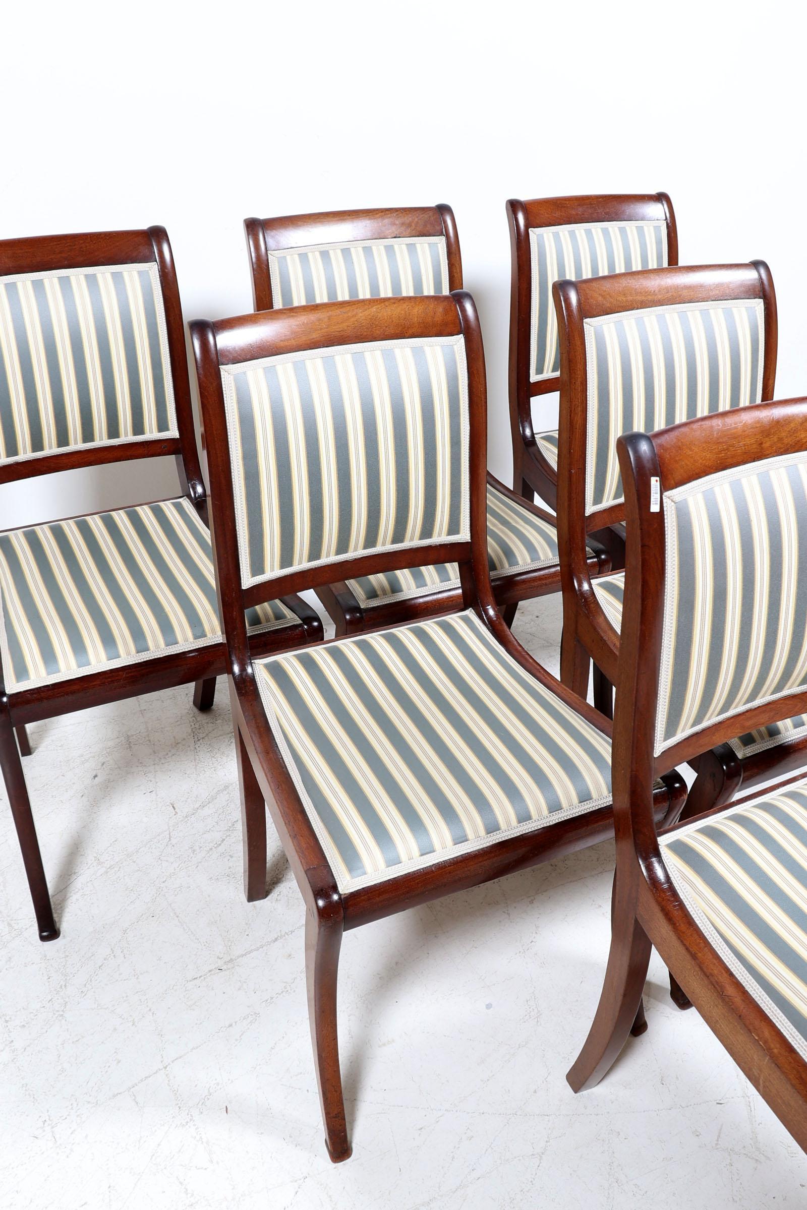 Set van 6 antieke mahoniehouten stoelen met zadelpoten en grijs/blauw gestreepte stof bekleed