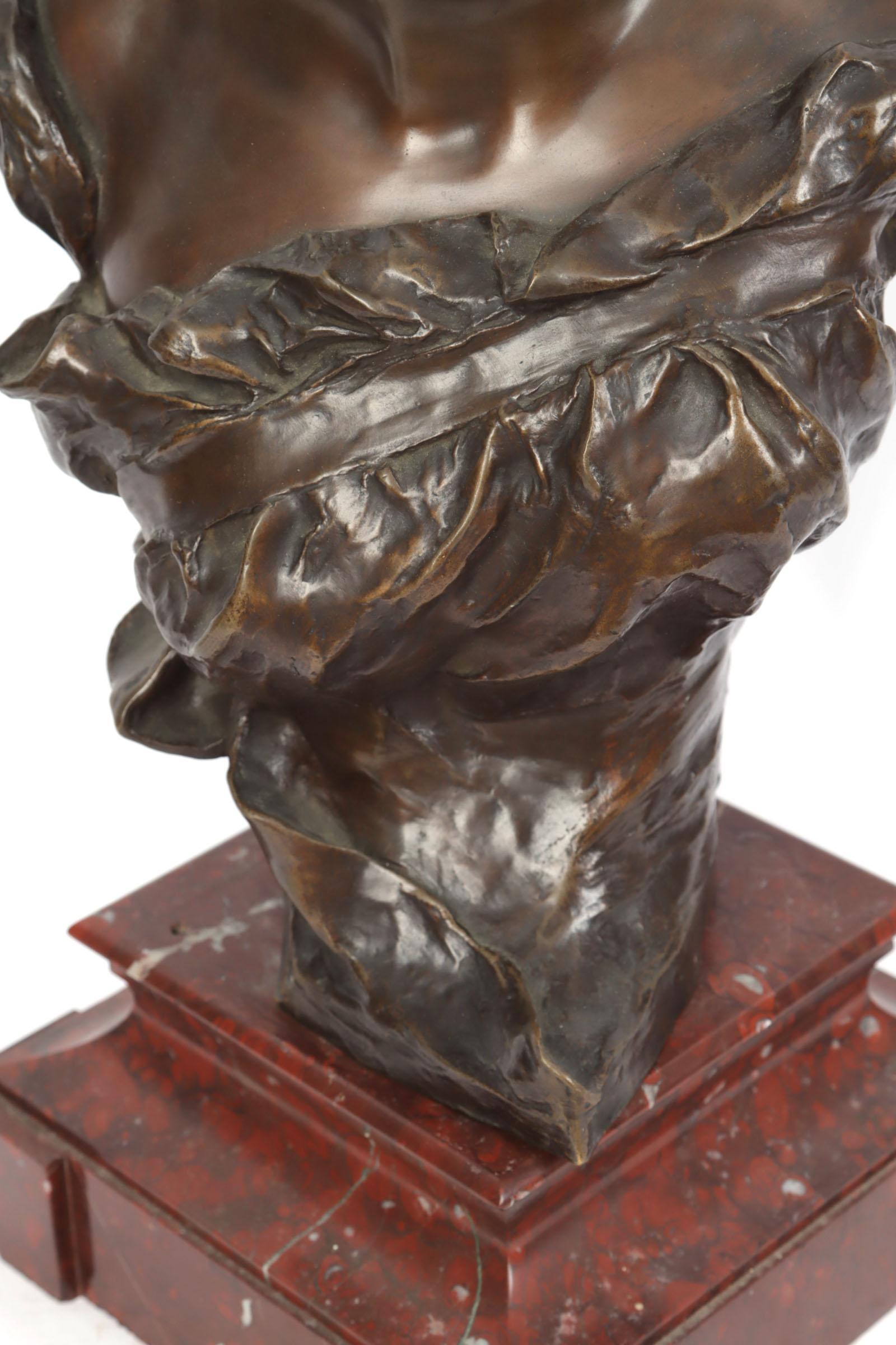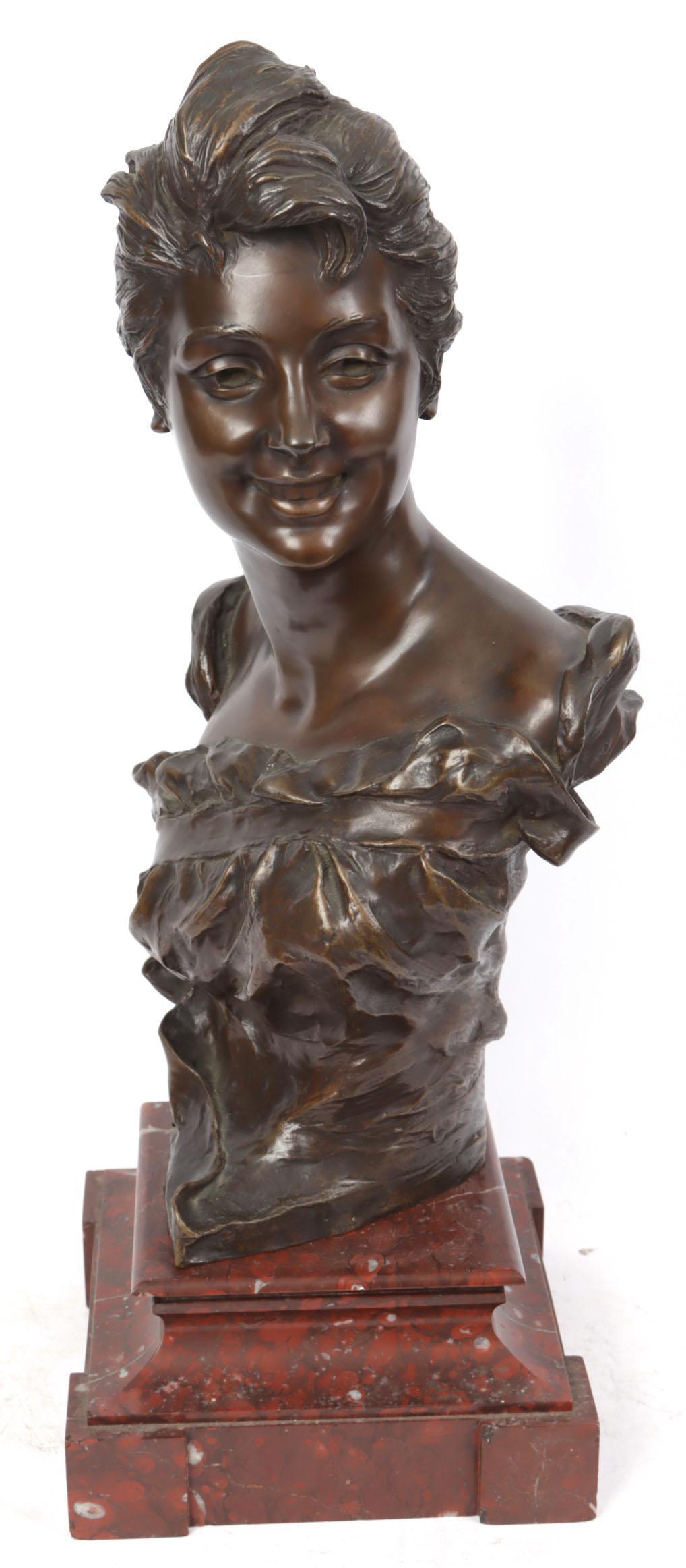 Georges van der Straeten (1856-1928), Bronzen buste van een dame rustend op rood marmeren voetstuk, h.
