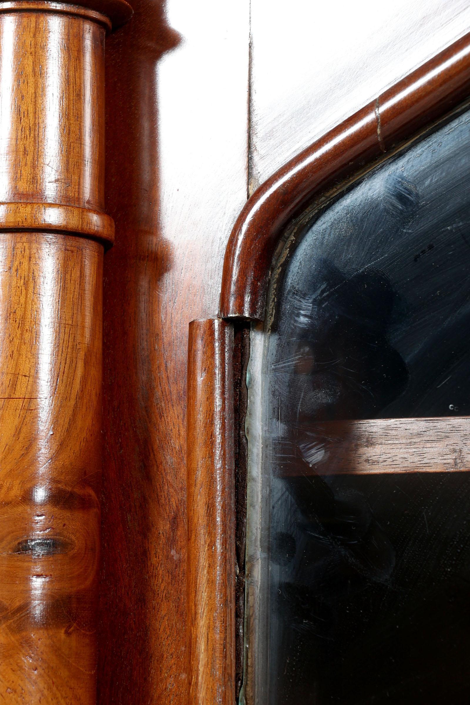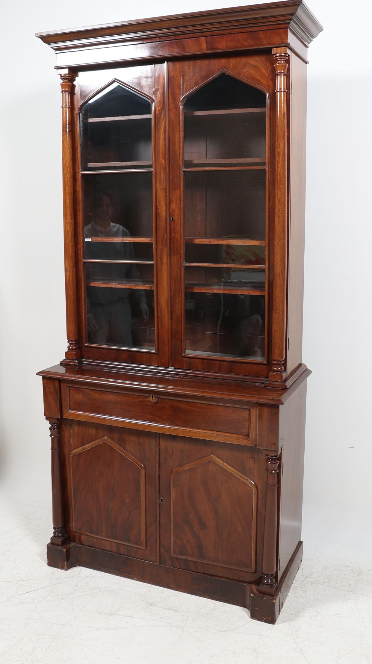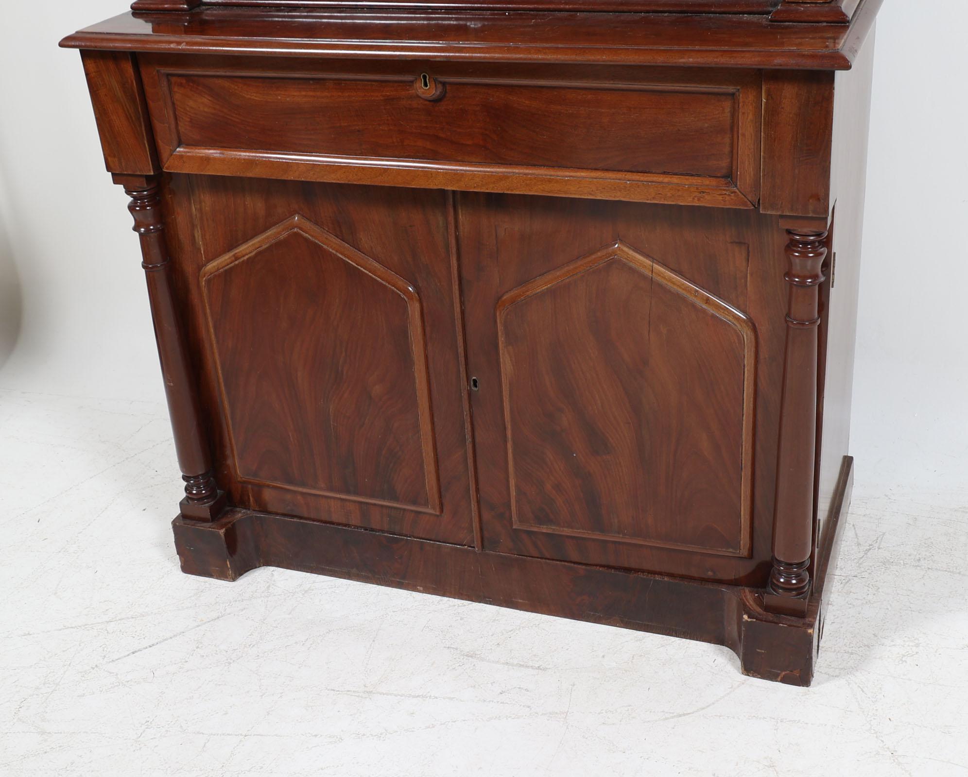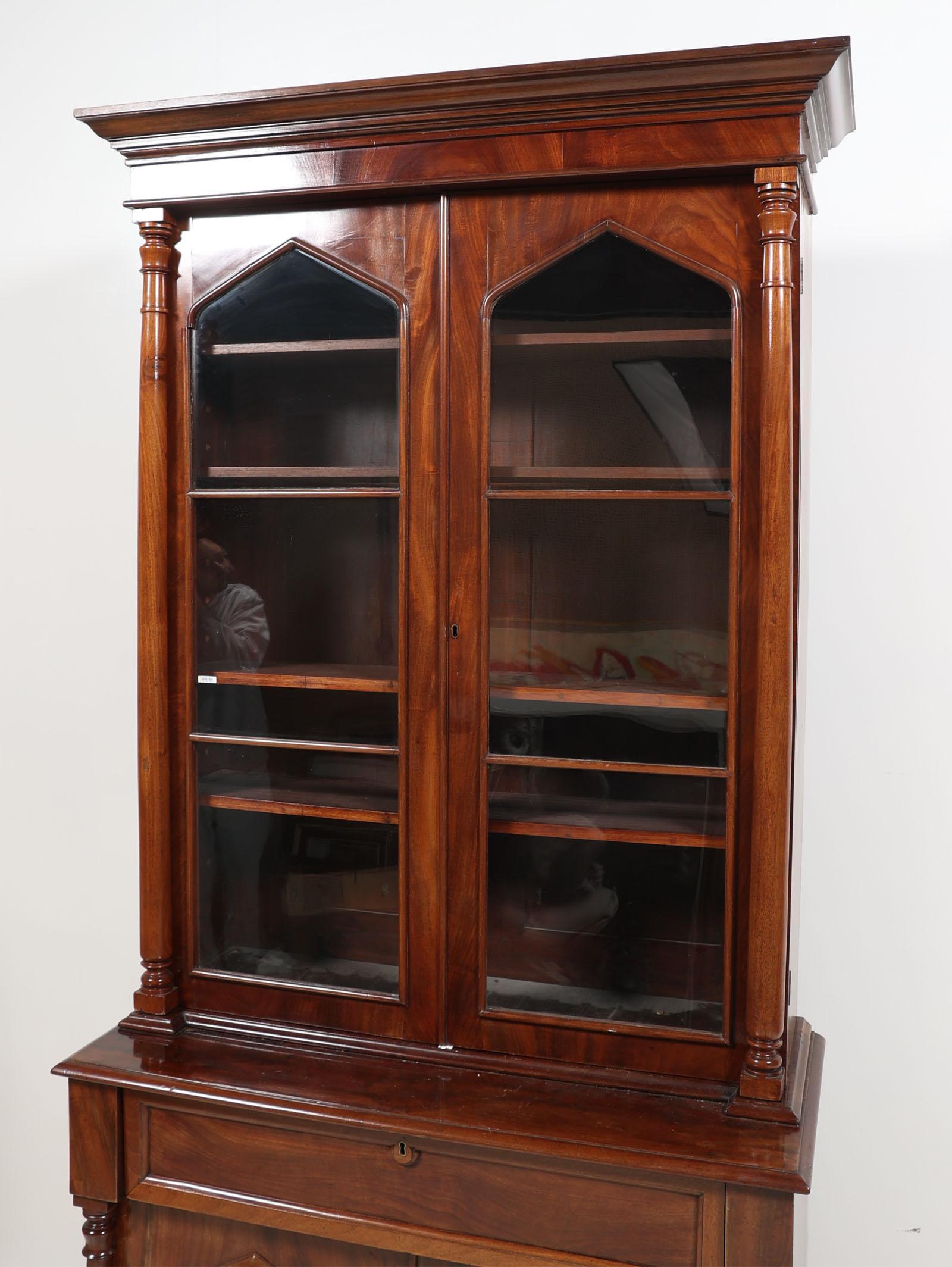 Antieke mahoniehouten 2-deurs kast met secretaire-gedeelte en vitrine-opstand