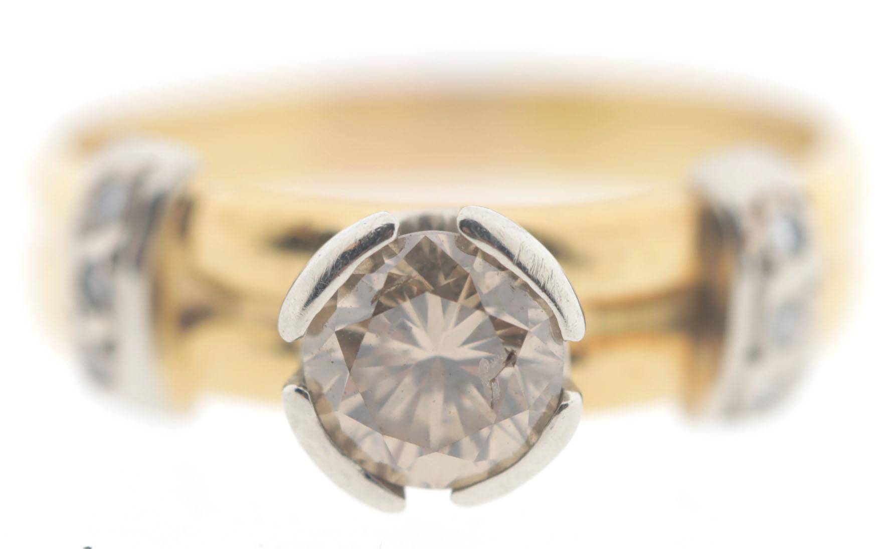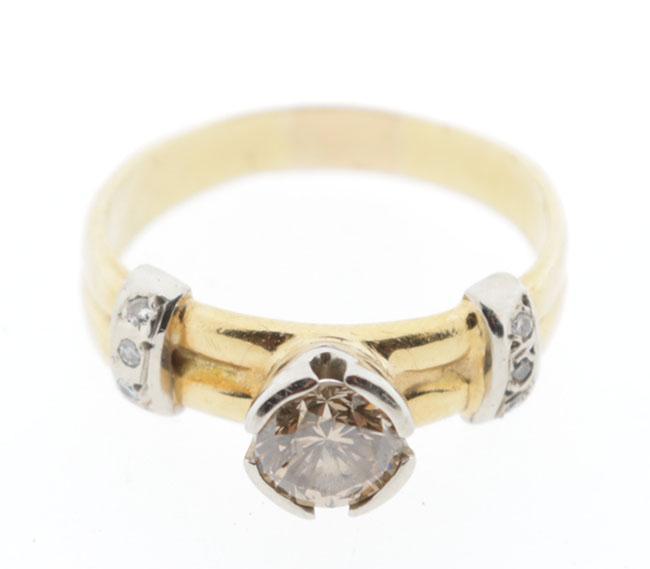 18 Kt. gouden ring bezet met 0.75 ct. roze diamant en 6 briljant geslepen diamantjes, 5,7 gram