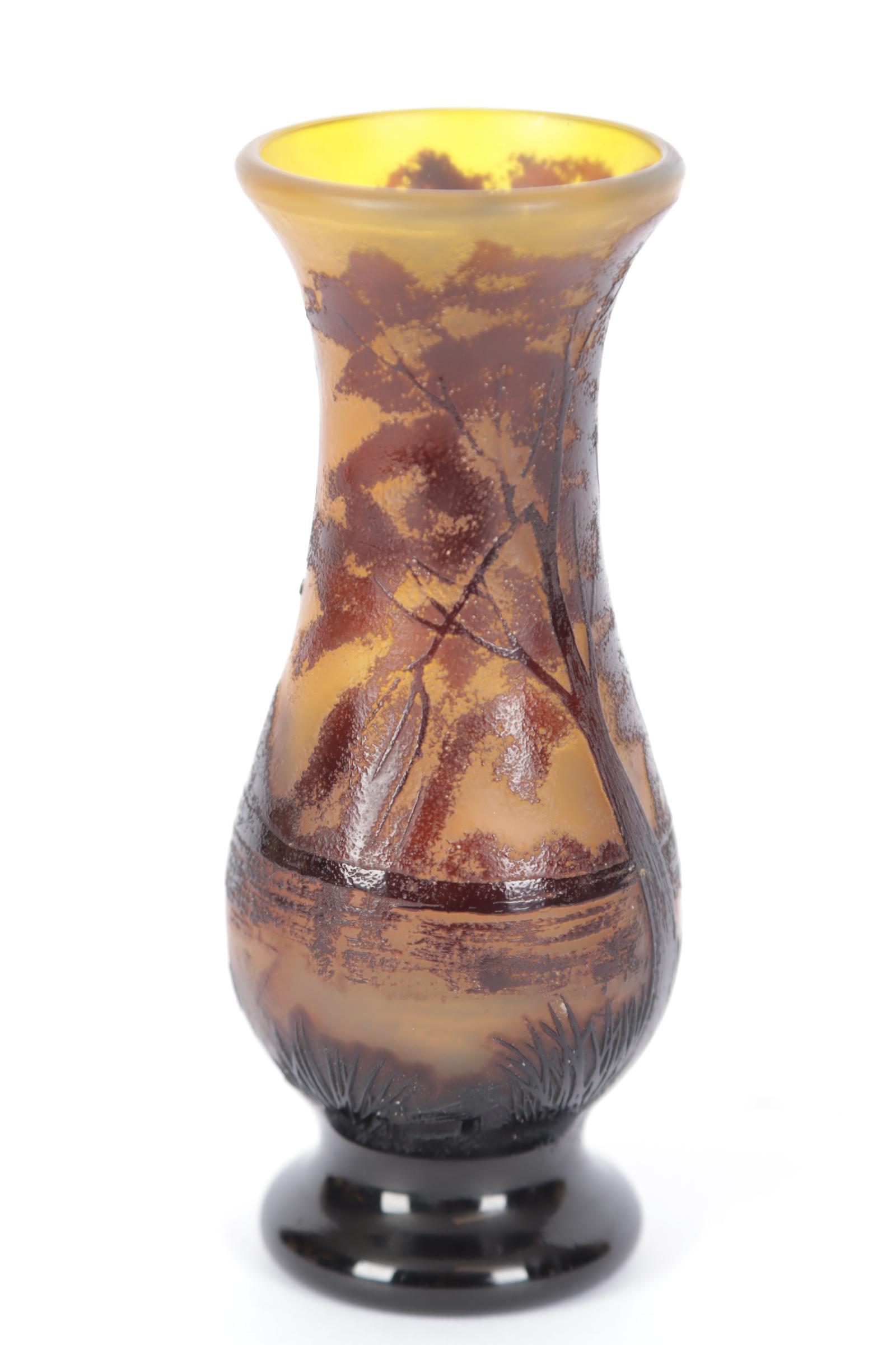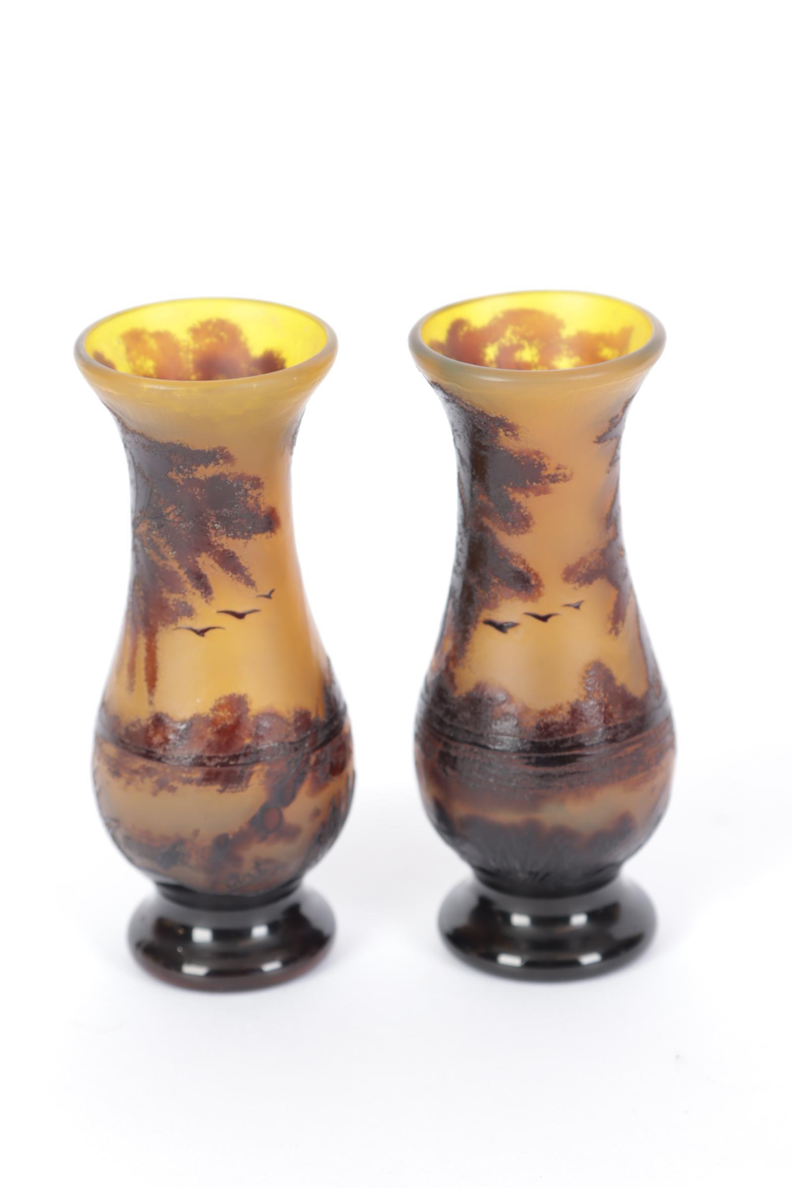 Art, twee met landschap gedecoreerde glaspasta vaasjes, h.13 cm.