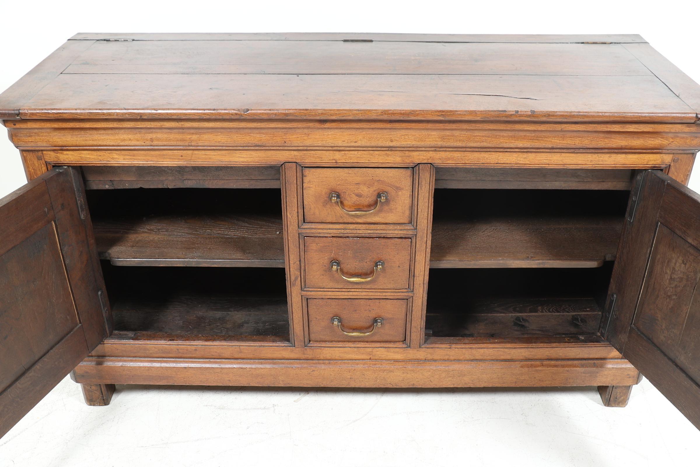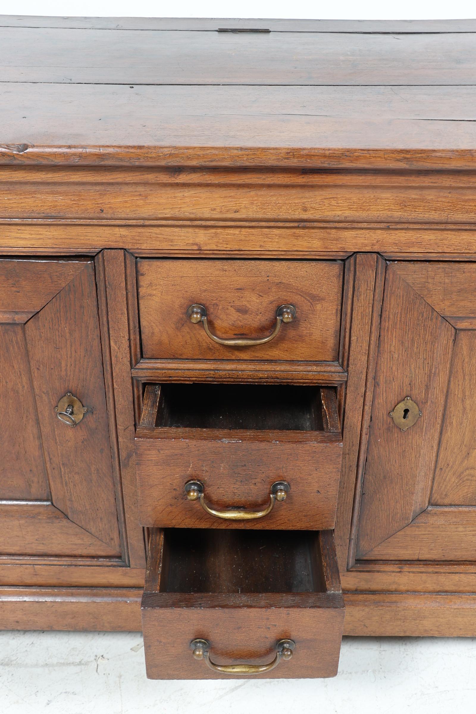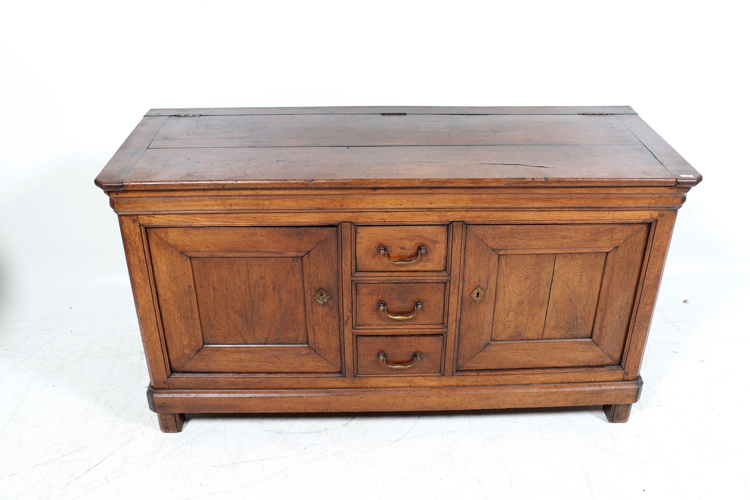 Antieke eikenhouten dekenkast/kist met 2 deuren en 3 laden, h.85 x b.155 x d.37 cm.