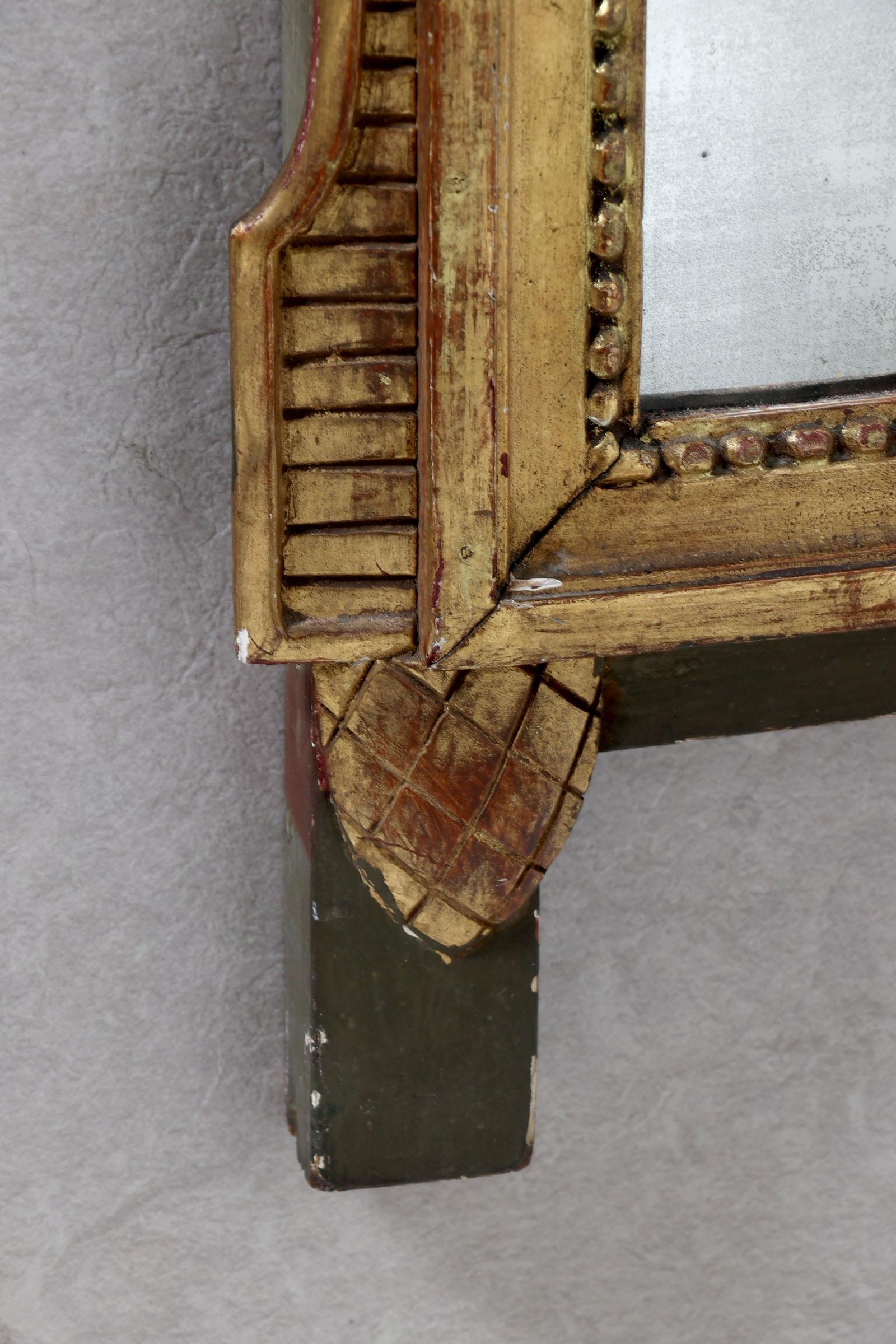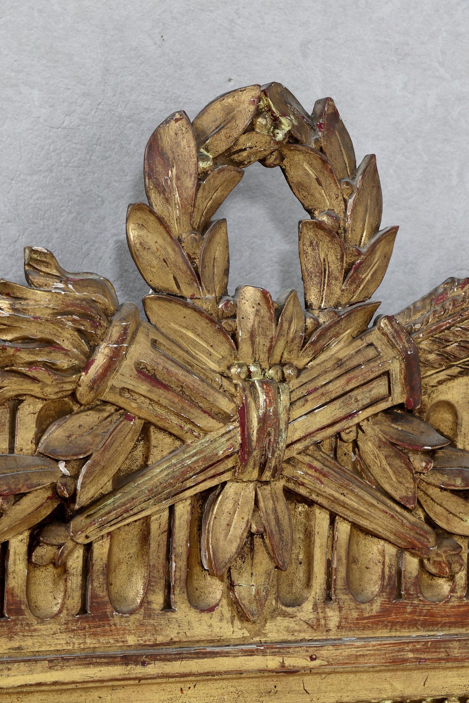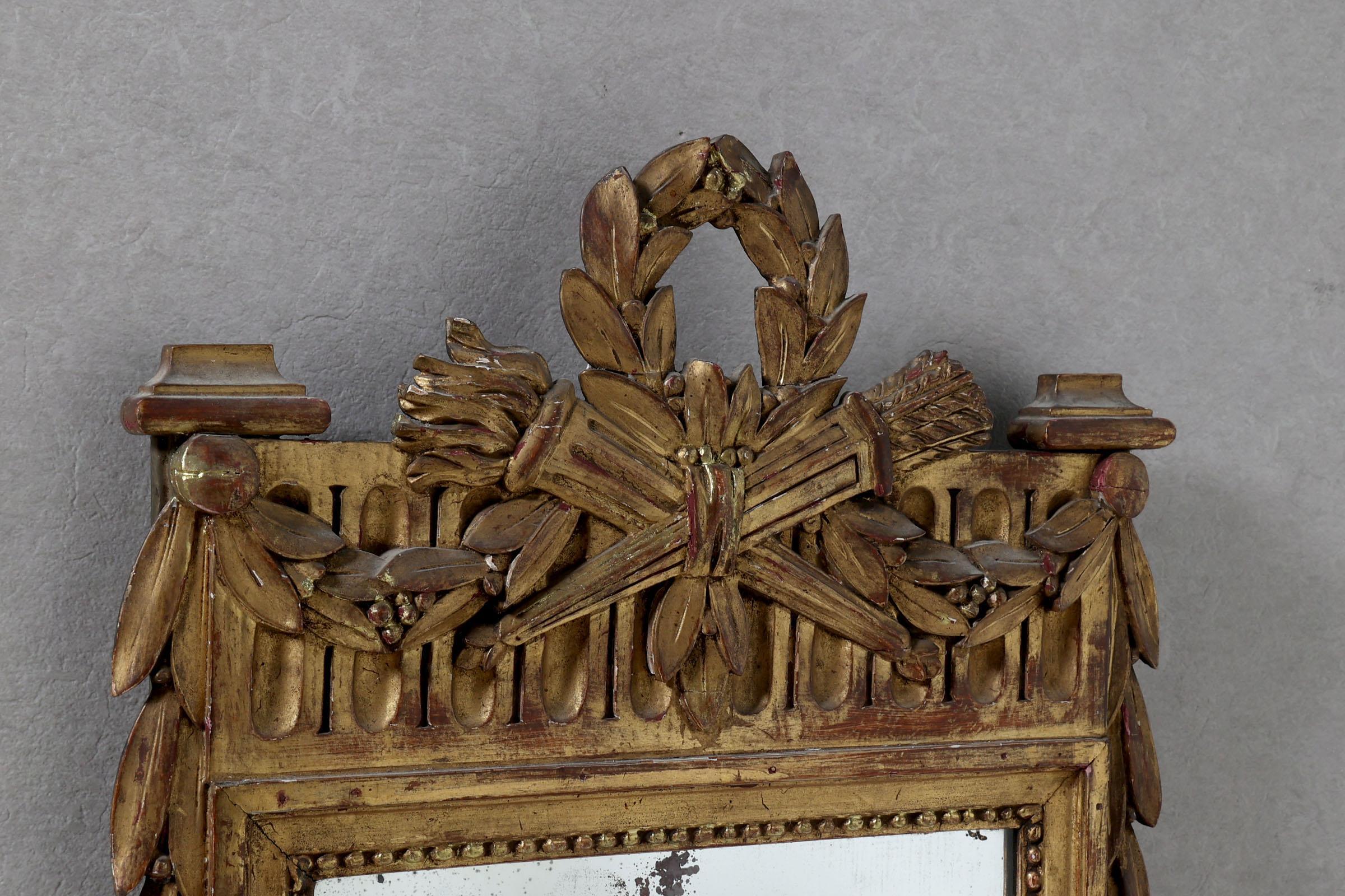 Antieke spiegel in vergulde lijst bekroond door een lauwerkrans, 120 x 45 cm.