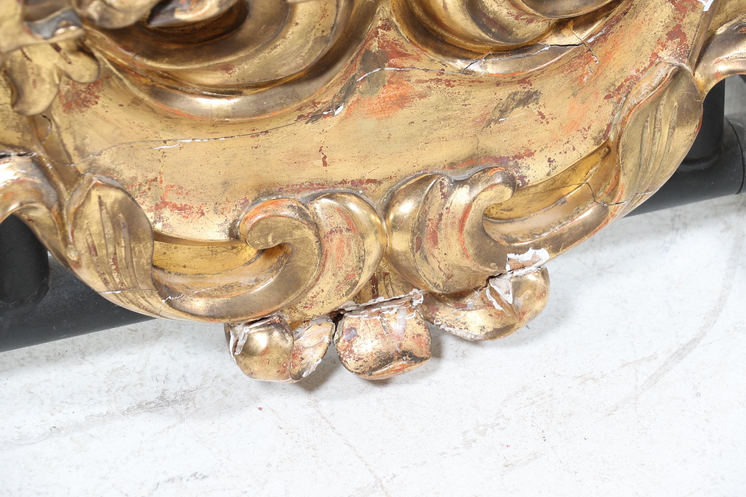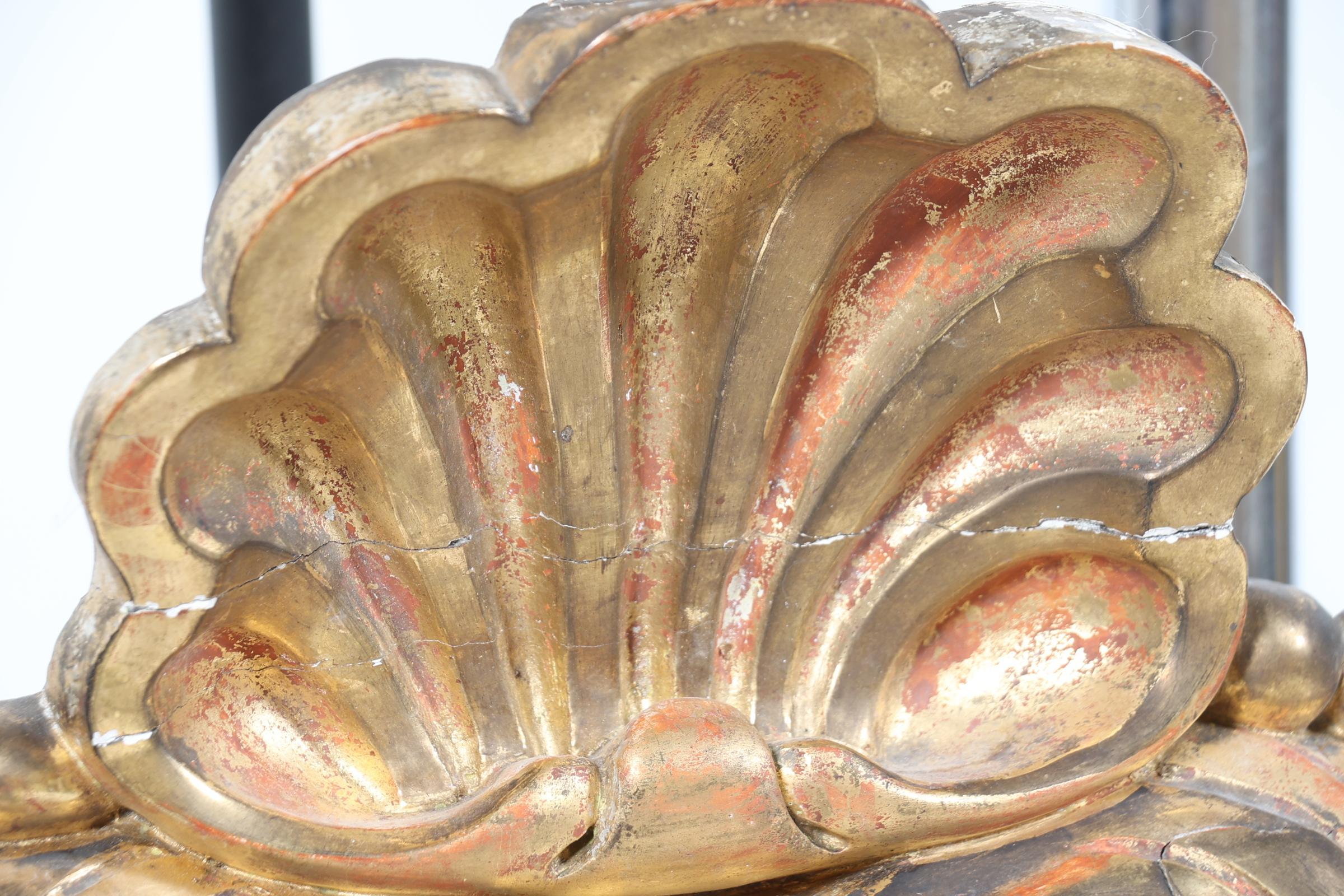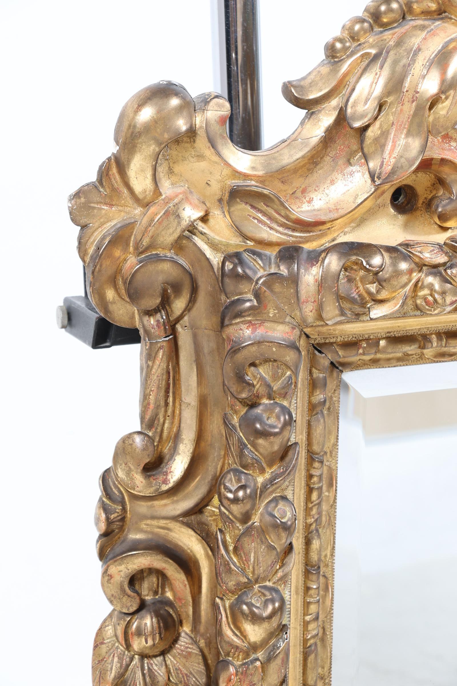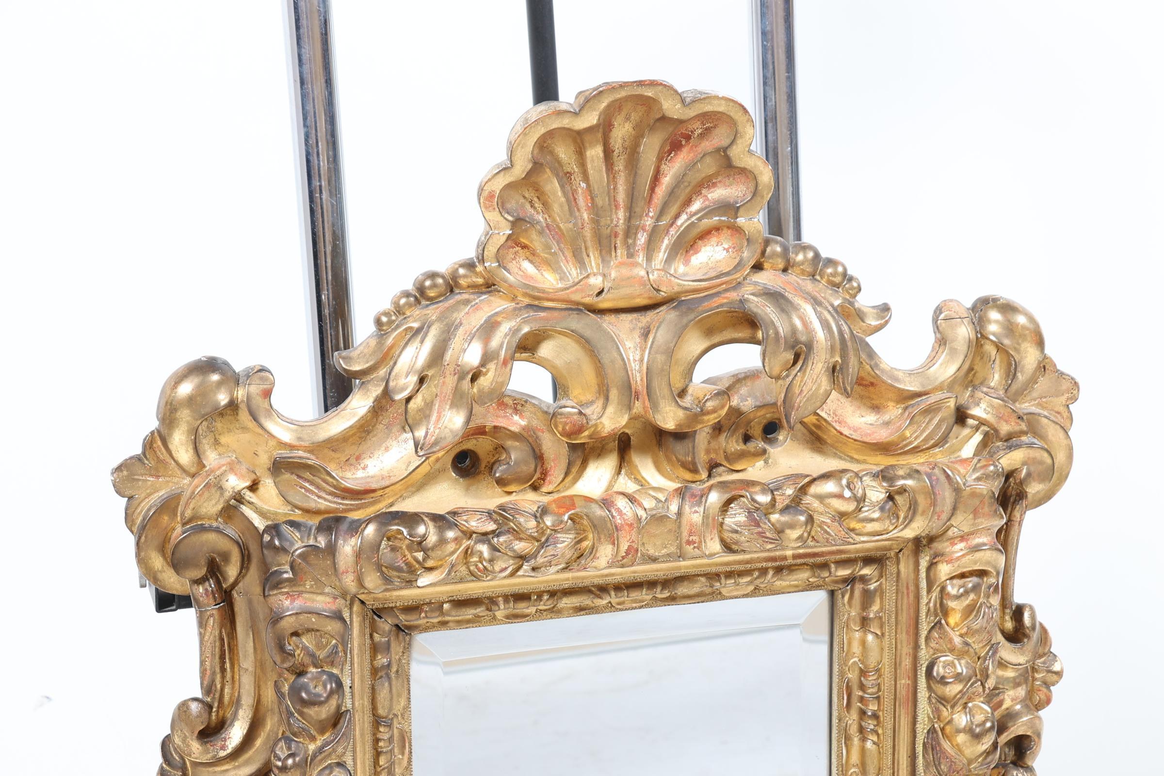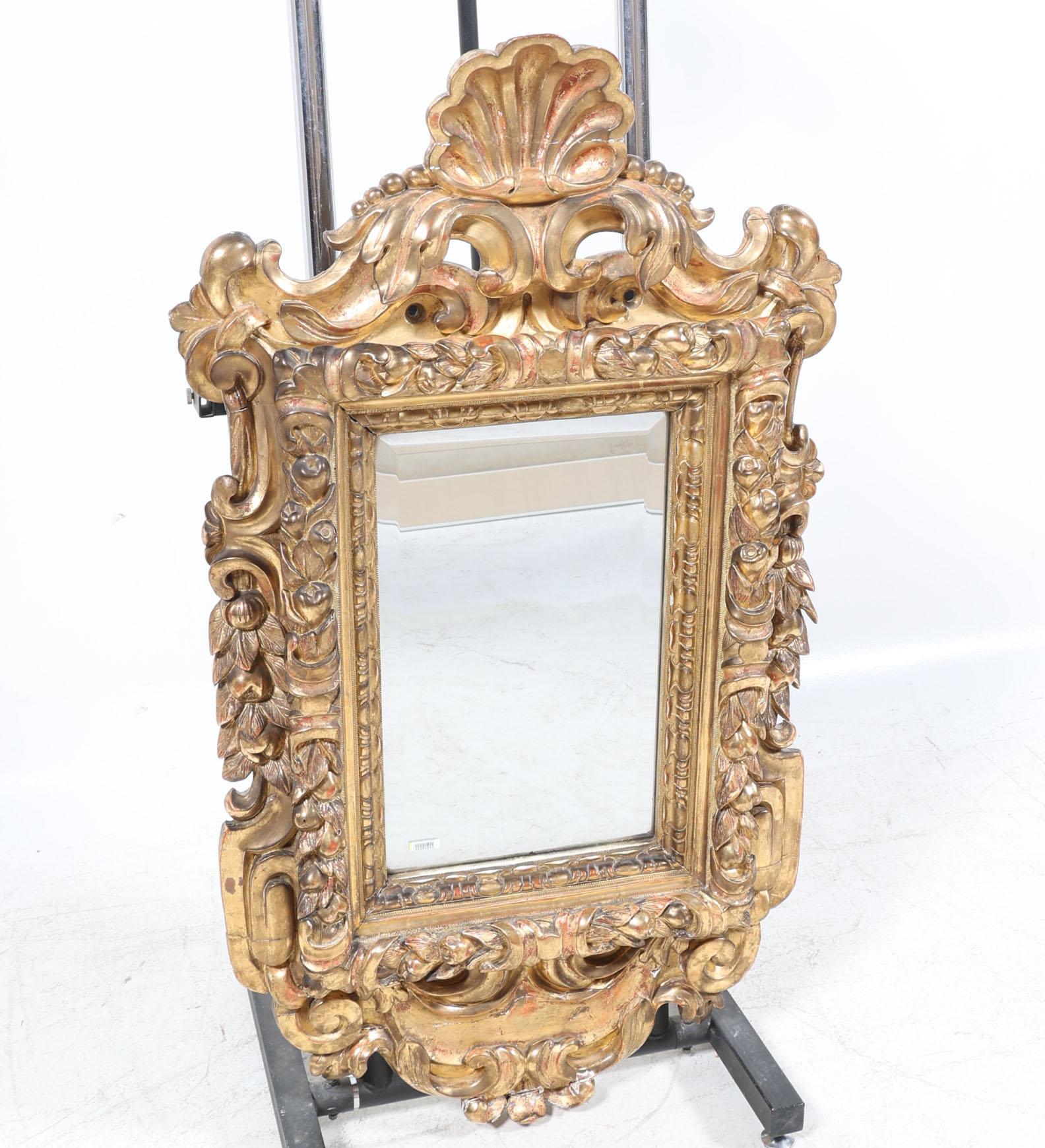 Geslepen spiegel in een antieke rijk bewerkte lijst bekroond door een schelp, 118 x 64 cm. (restauraties)
