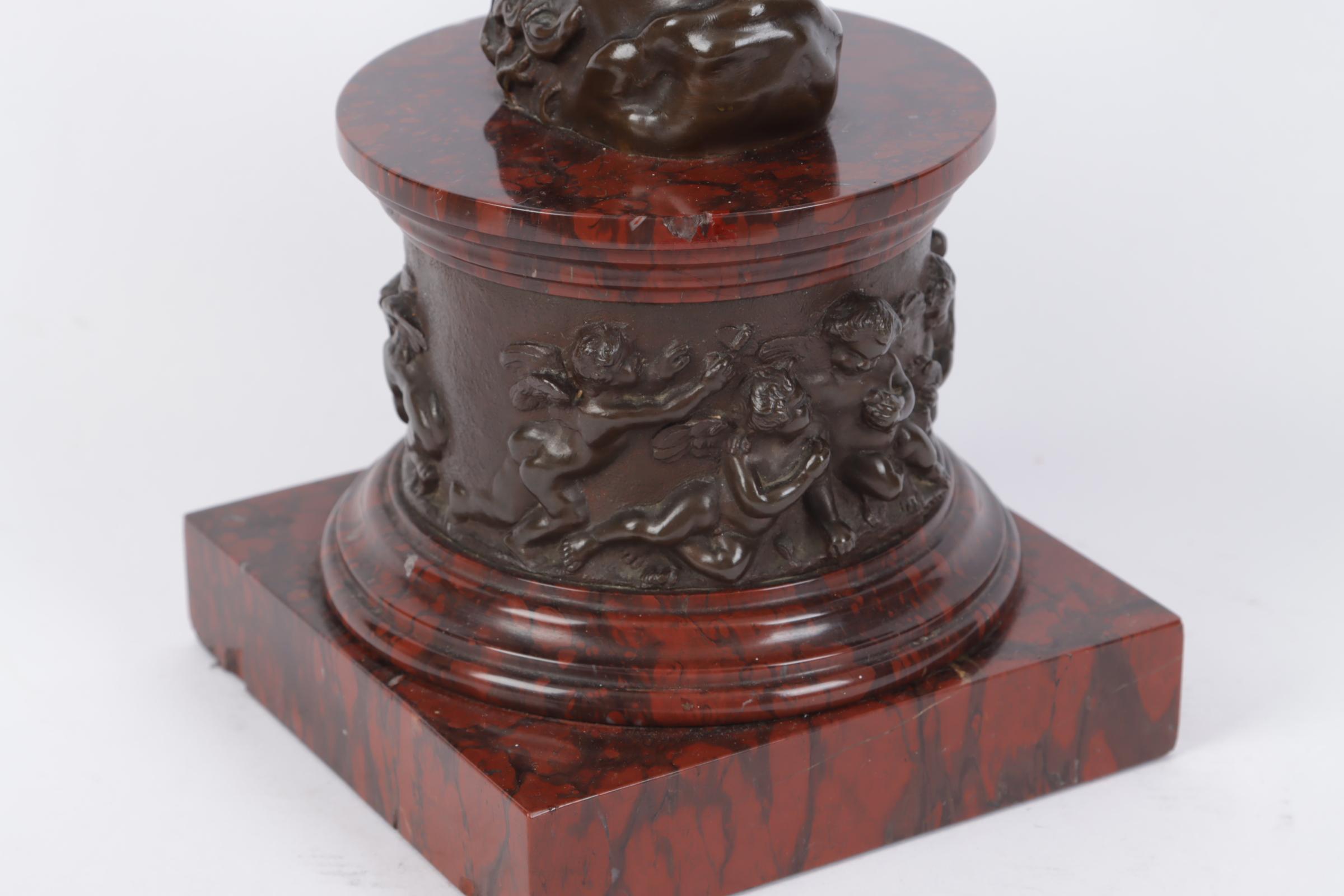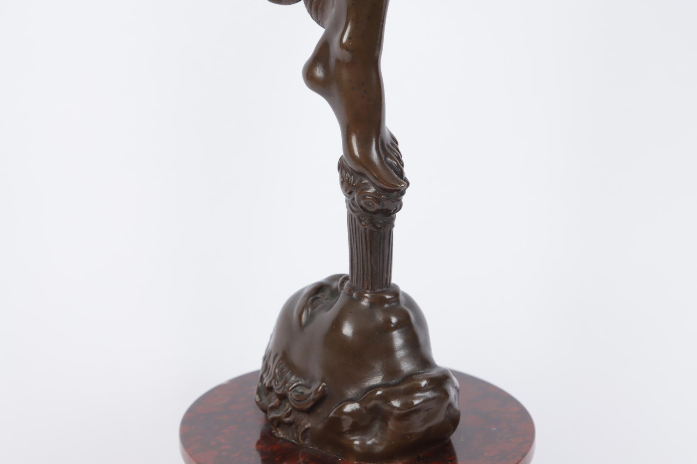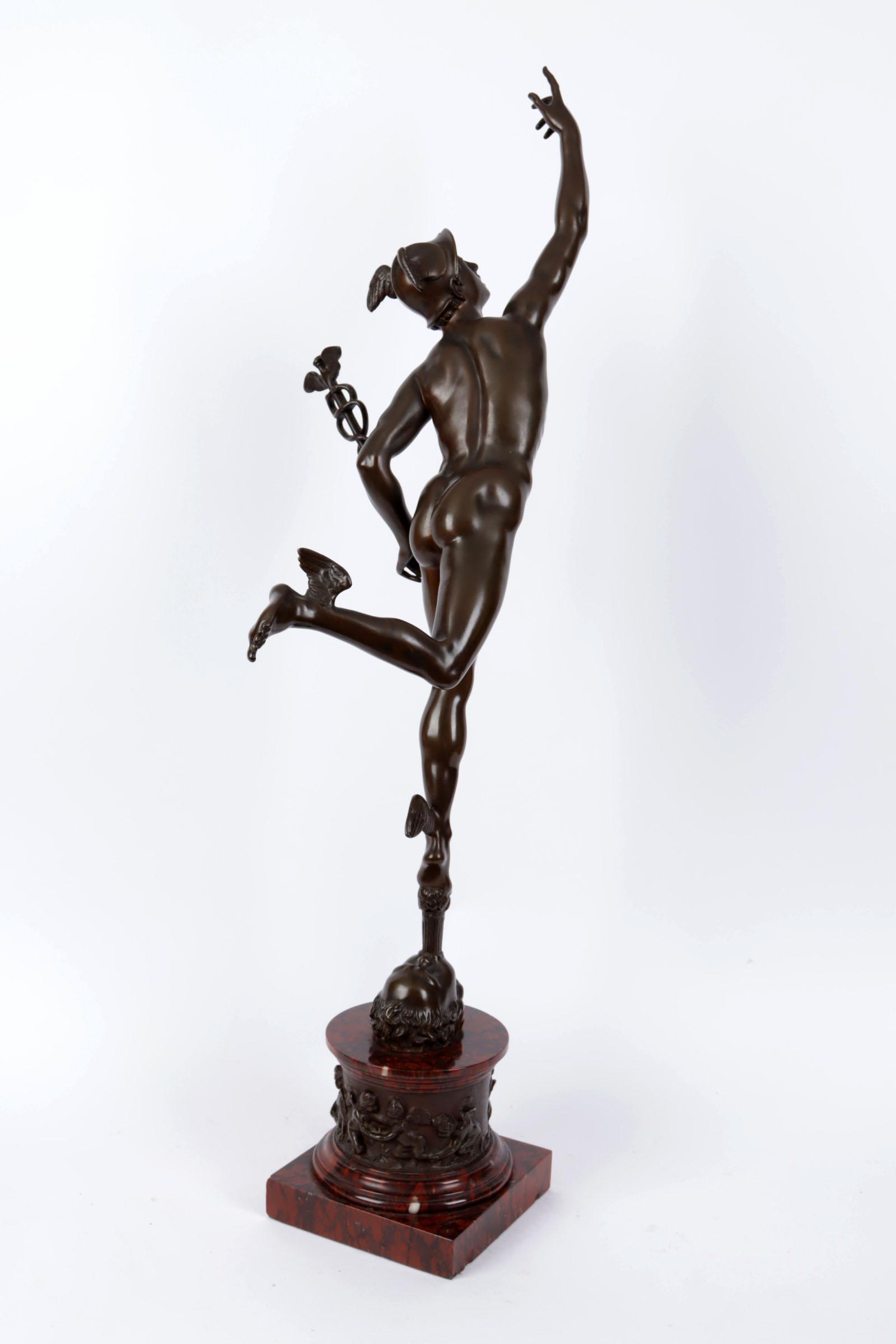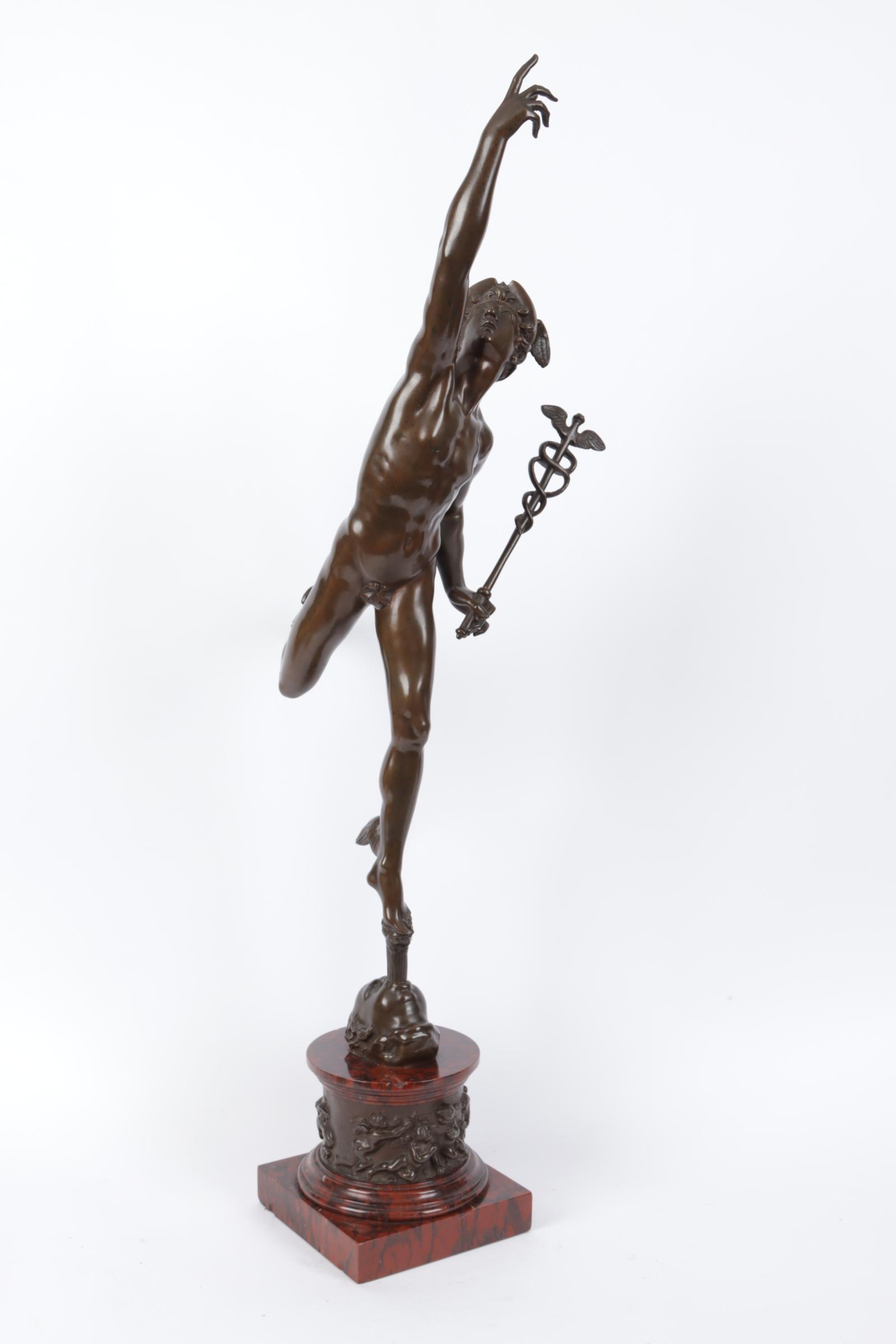 Naar Giambologna, Bronzen sculptuur van Mercurius rustend op rood marmeren voetstuk, h.82 cm. (chipjes aan marmer)