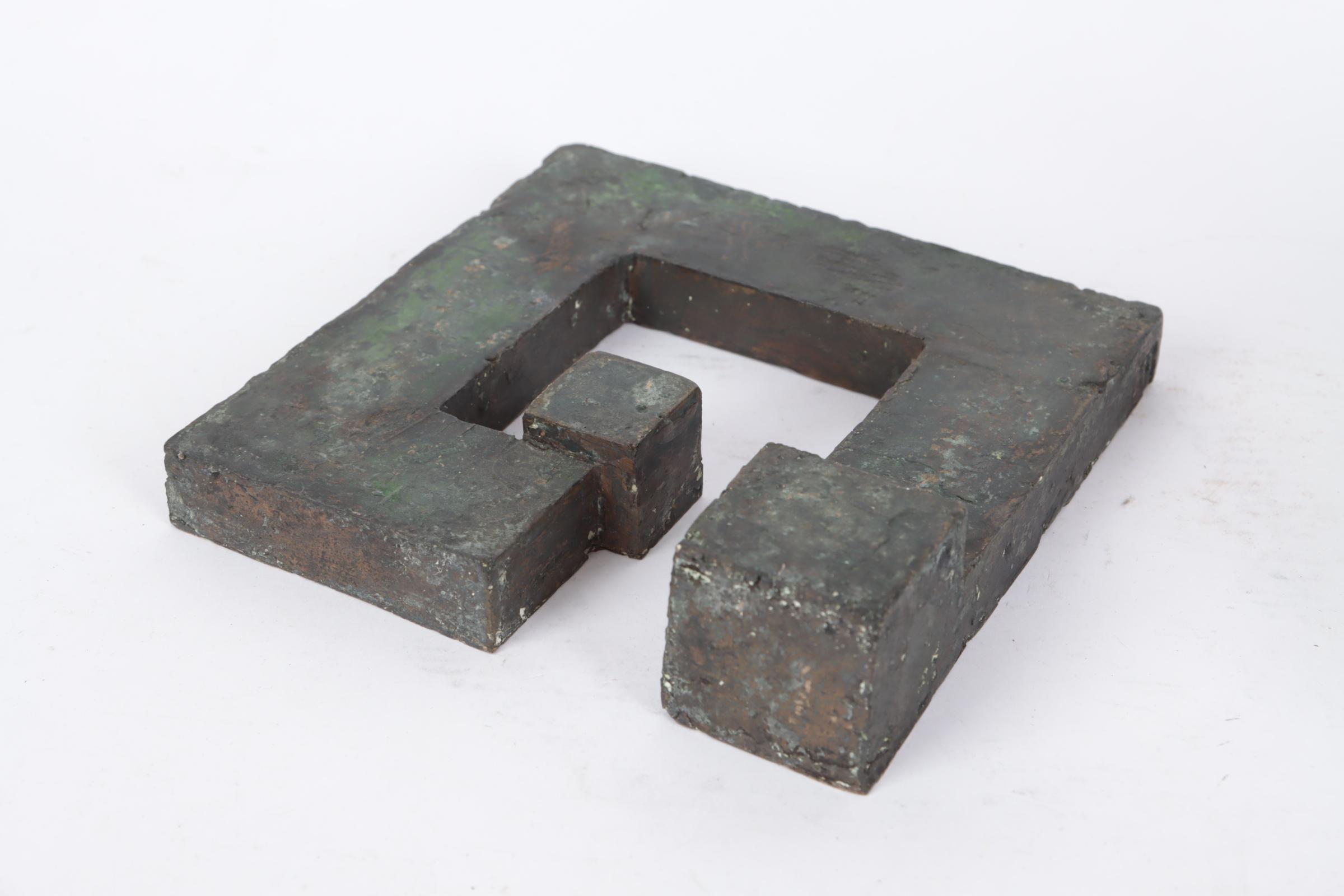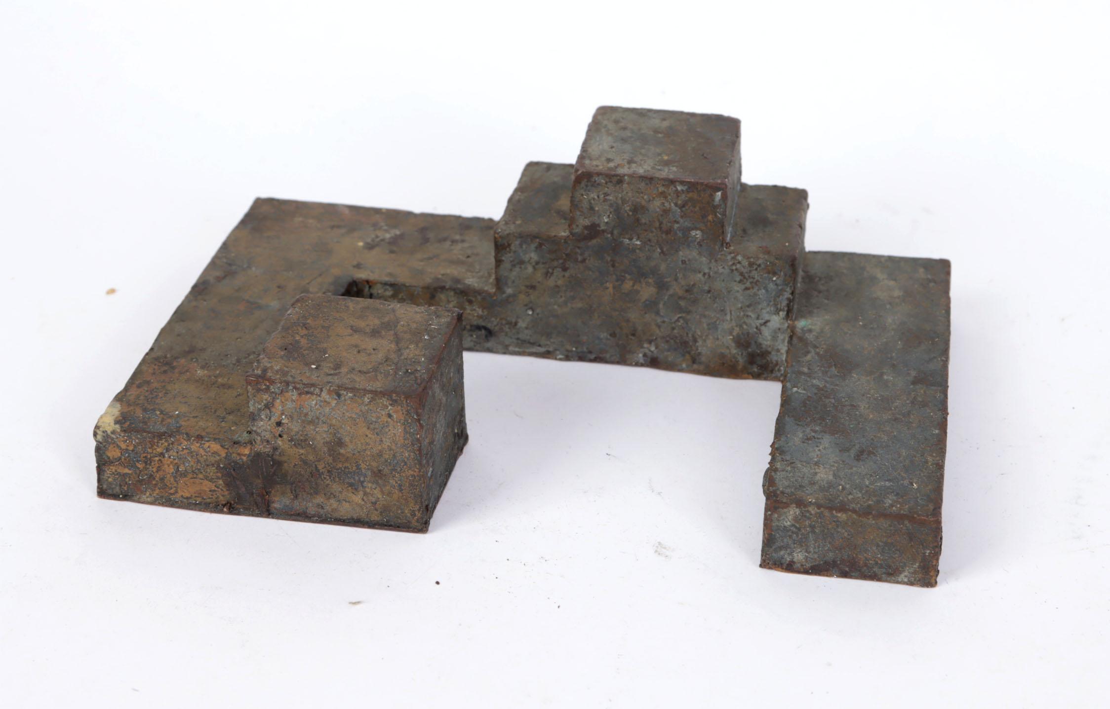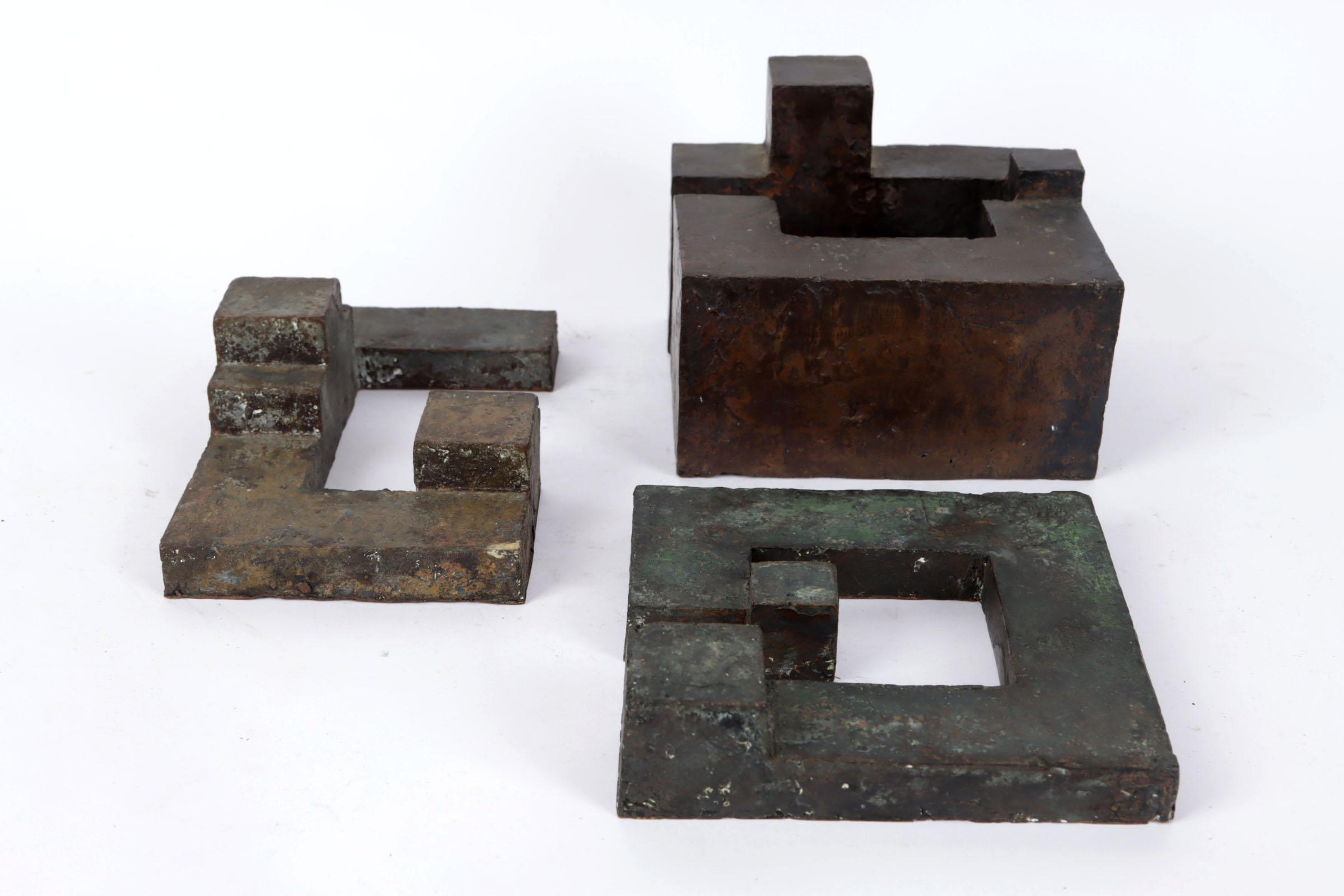Corrie Kuijs (1955), Samenplaatsing nrs 3, 5 en 7, compositie van drie bronzen sculpturen, 2002, grootste element h.12 x b.16 x d.15 cm.