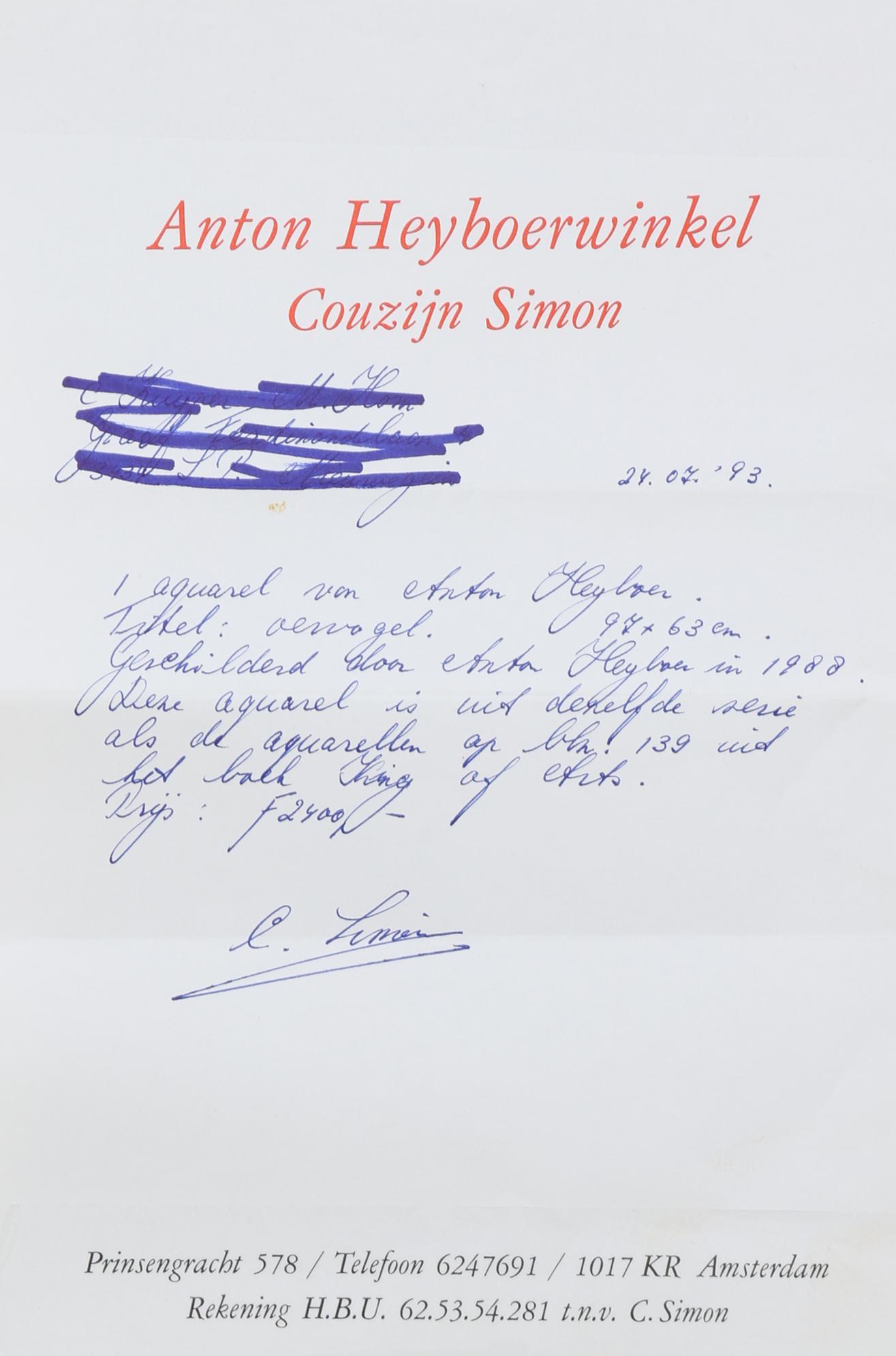 Anton Heijboer (1924-2005), Oervogel, aquarel, 108 x 78 cm., geschilderd door Anton Heijboer in 1988, aquarel is uit de zelfde serie als de aquarellen op bladzijde 139 vanuit het boek King of Arts, 97 x 63 cm., provenance particuliere collectie : aangekocht in 1993, voor fl.2400, Anton Heijboer winkel op de Prinsengracht 578 te Amsterdam