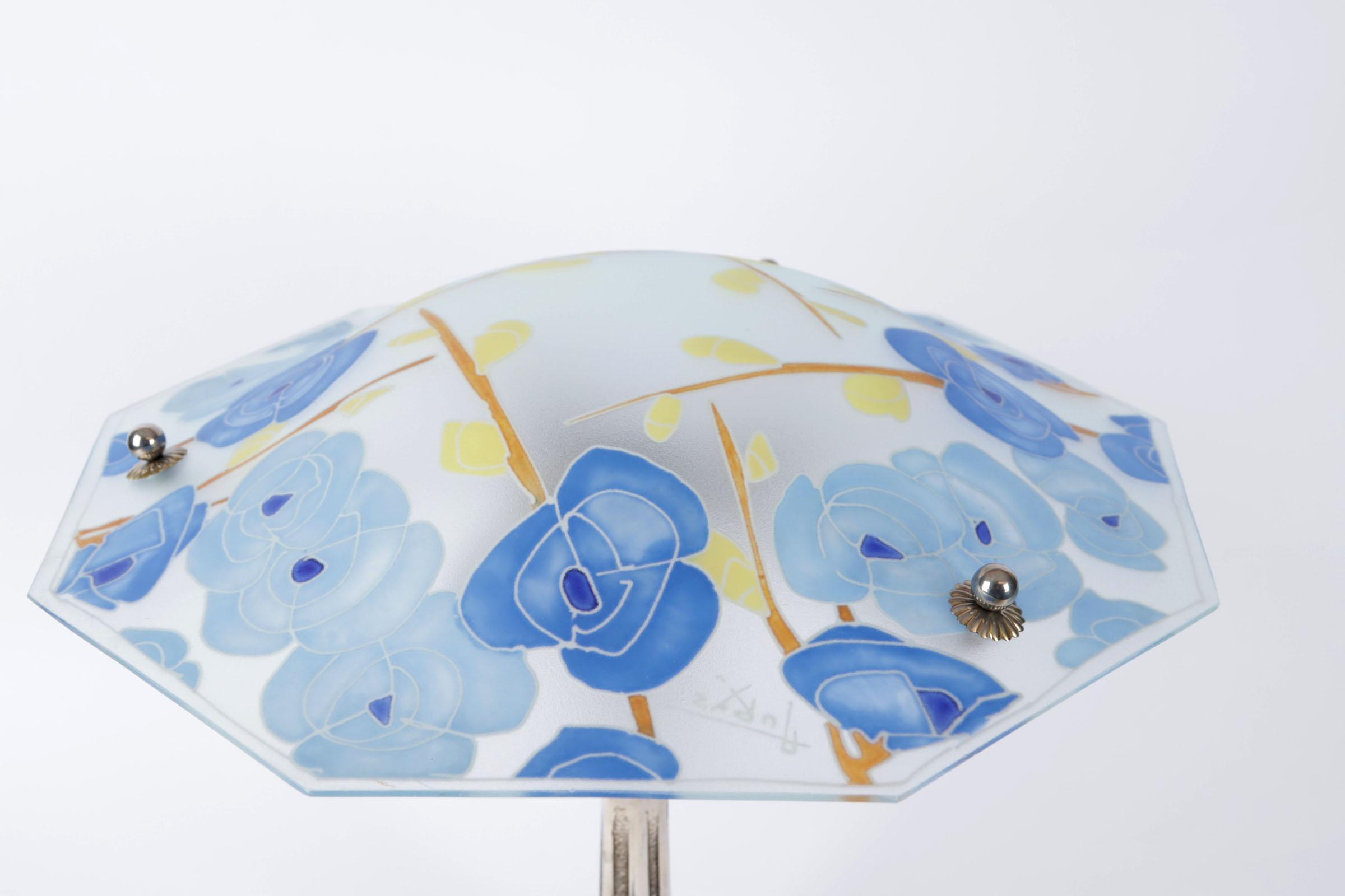 Loys Lucha, gesigneerde tafellamp op bronzen voet met glazen kap in geëmailleerd floraal decor, h.