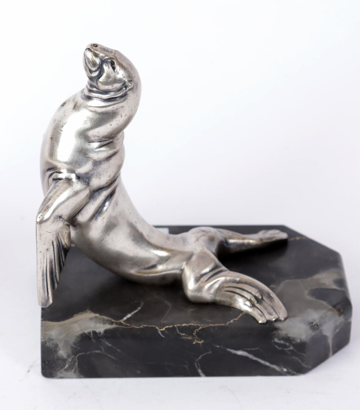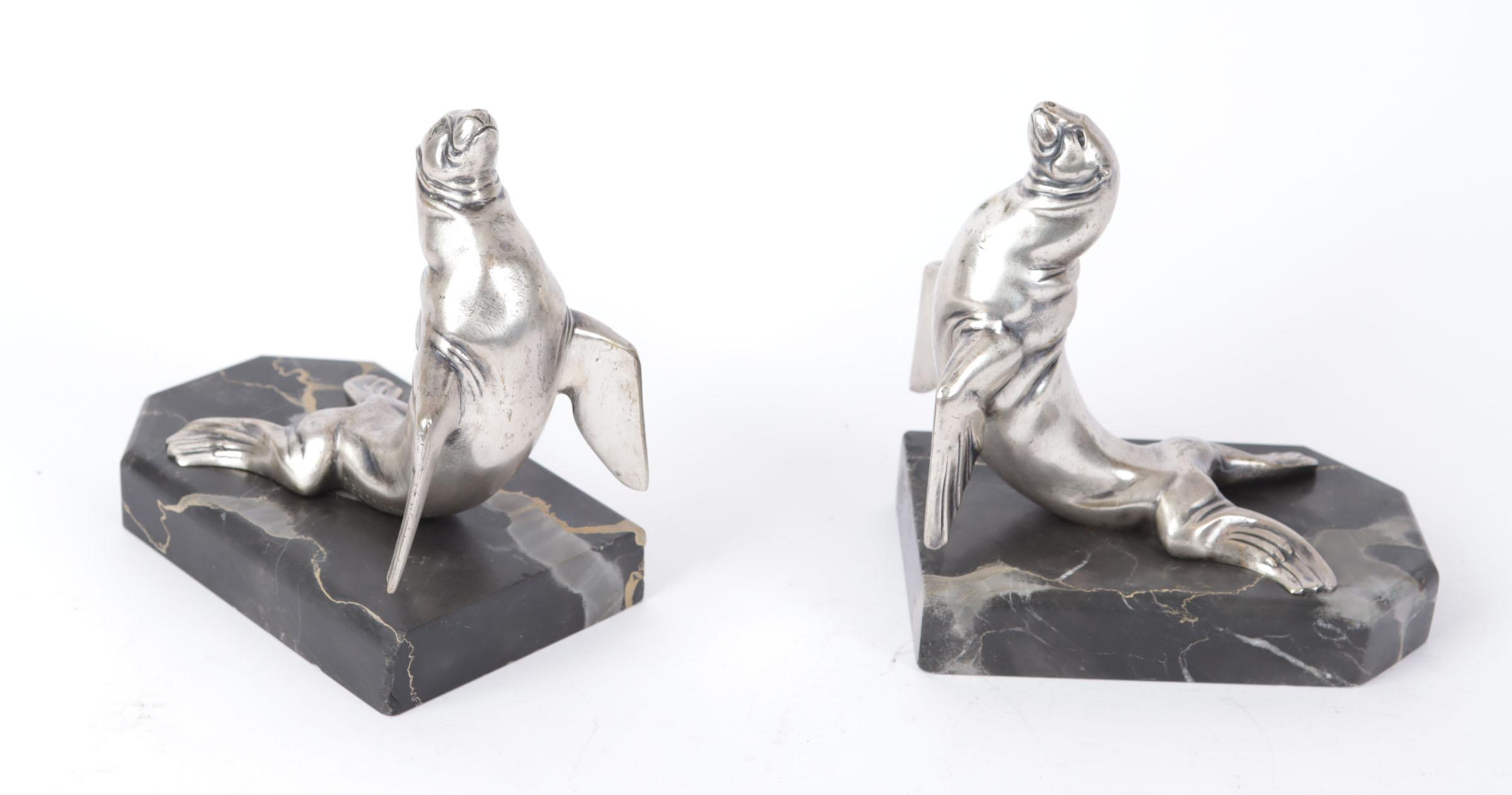 Stel Art Deco boekensteunen met voorstelling van bronzen zeeleeuwen op marmeren voetstuk gesigneerd Frécourt - Maurice Frécourt 1890-1961
