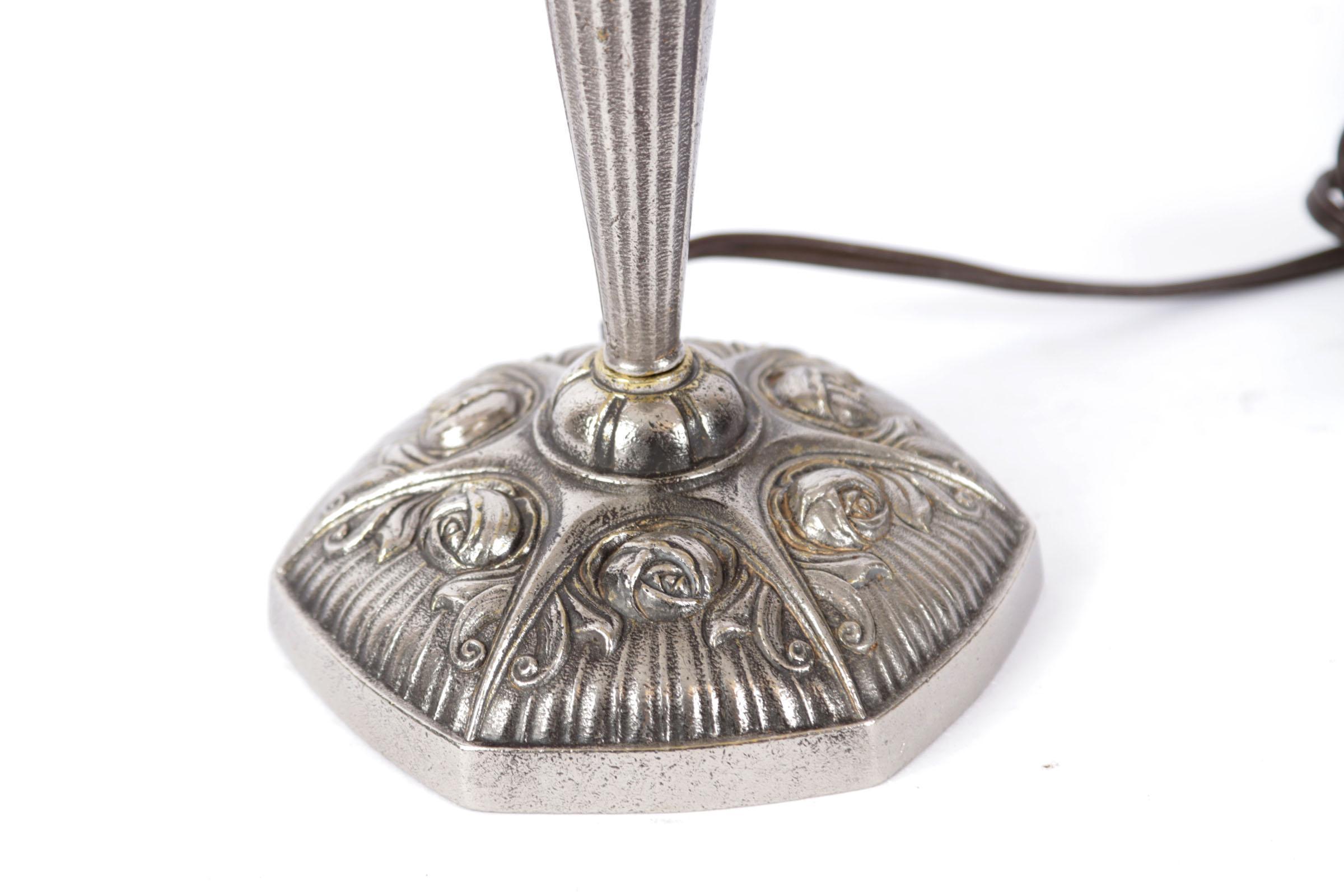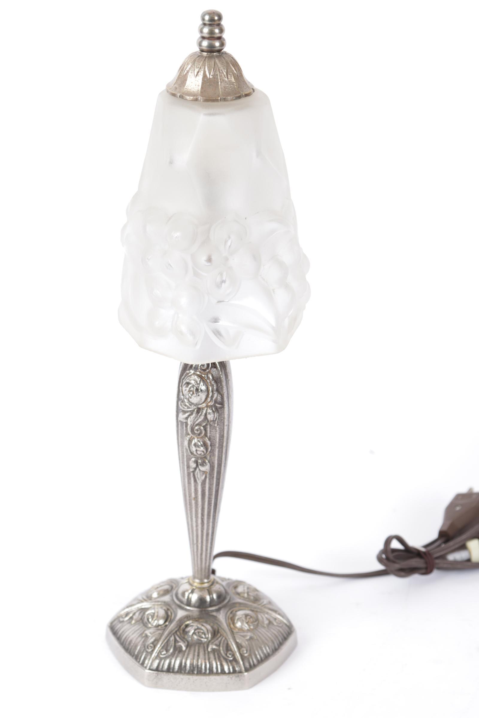 Art Deco tafellamp op rijk bewerkt verzilverd bronzen voetstuk met gesatineerd glazen kap in hoog reliëf, h.