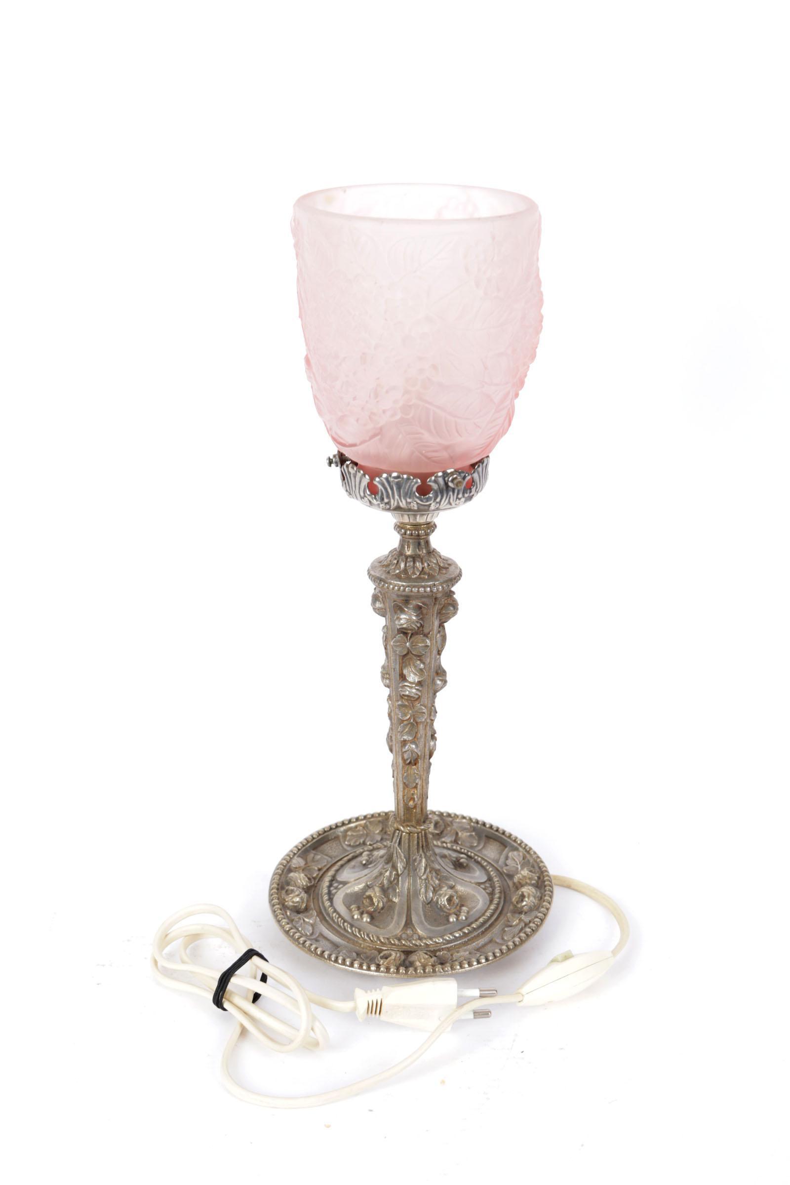 Tafellamp op rijk bewerkt verzilverd bronzen voet met rosé gesatineerd glazen kap in floraal hoog reliëf, h.