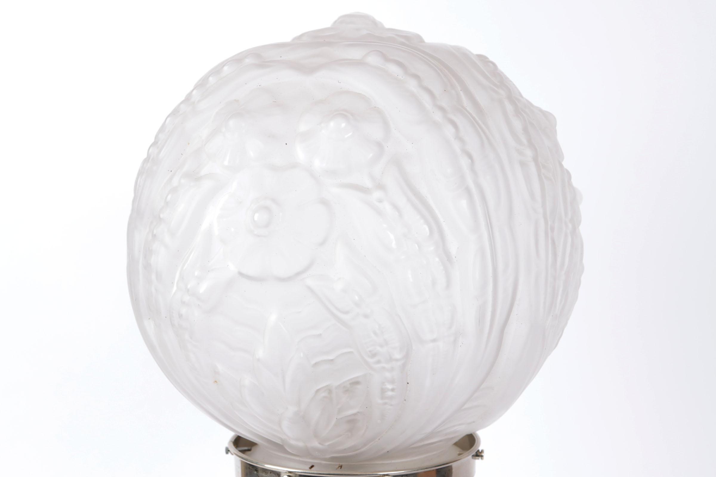 Art Deco tafellamp op verzilverde voet met gesatineerde glasbol in reliëfdecor