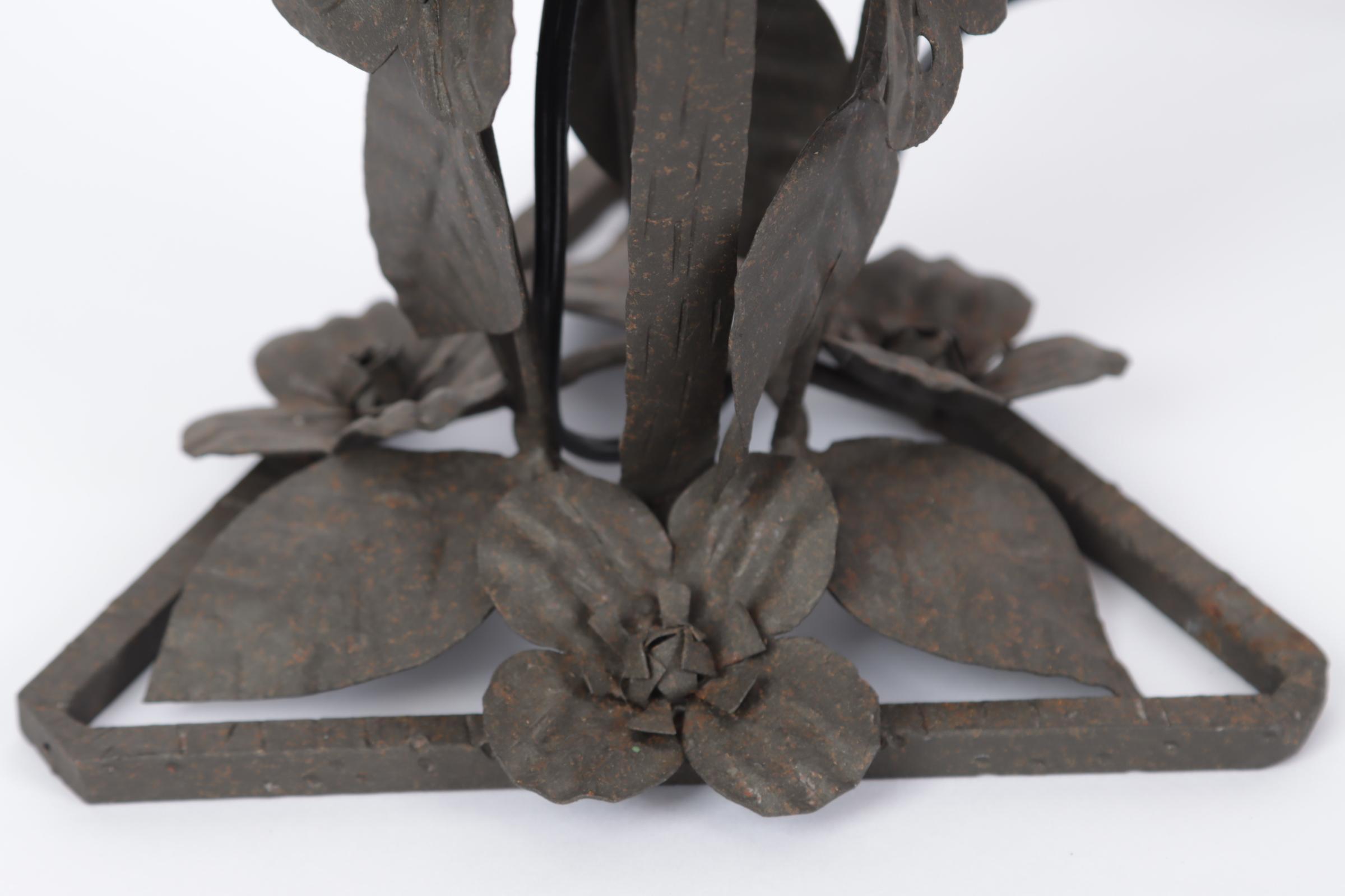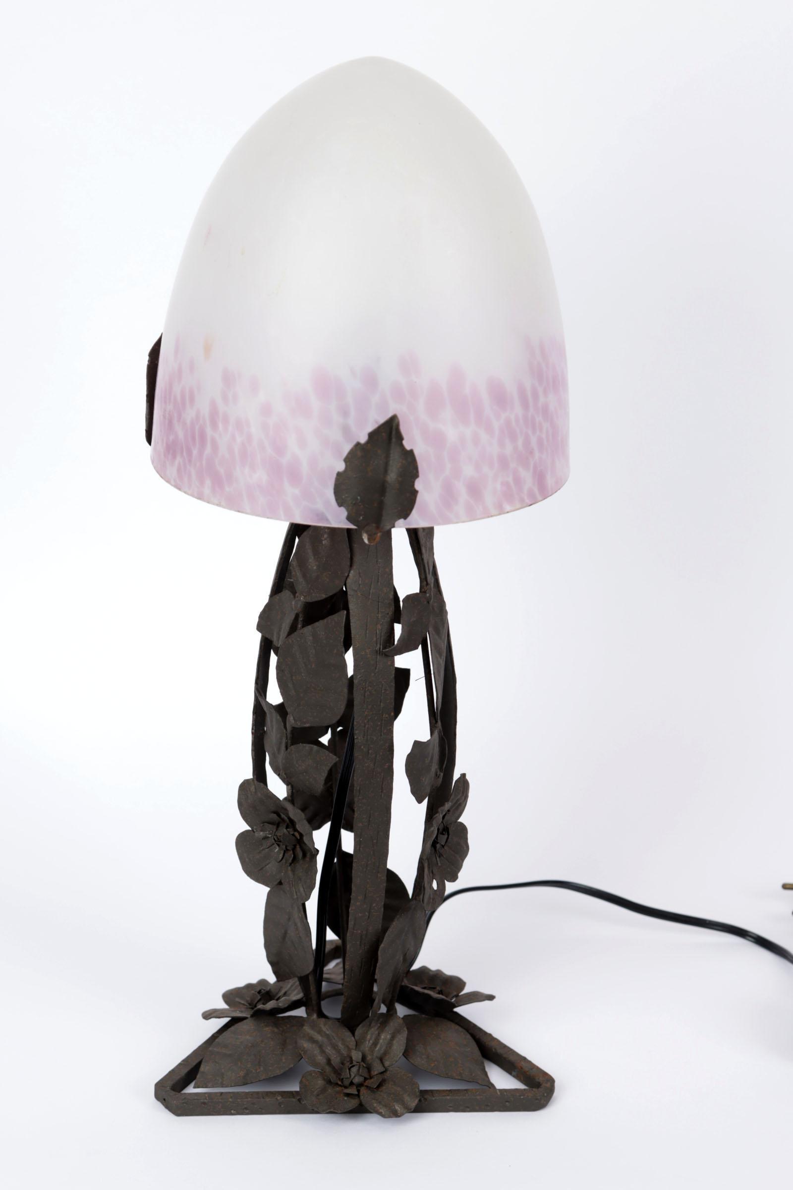 Art deco tafellamp op rijk bewerkt smeedijzer voet met pâte de verre glaskap h.46.5 cm.