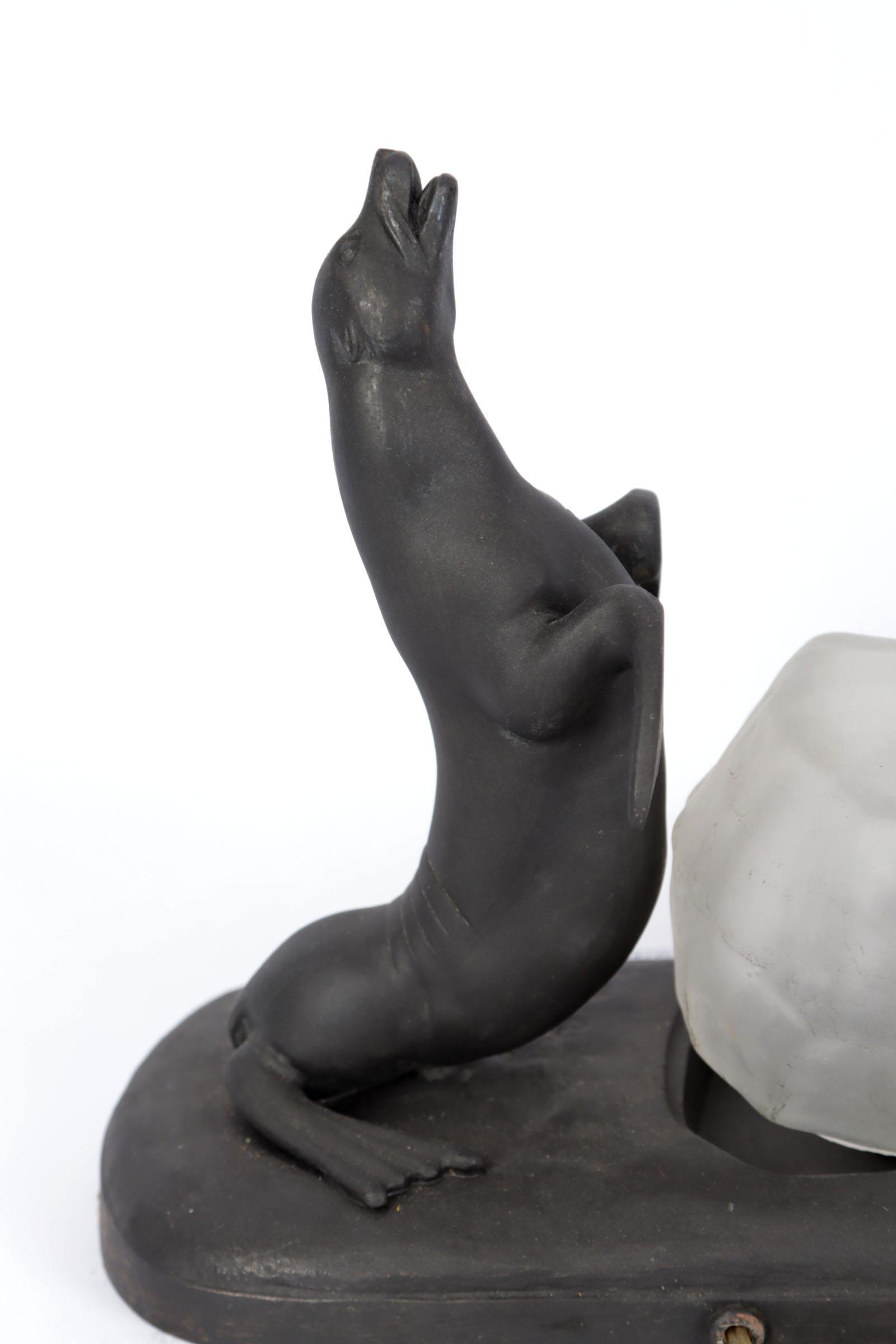 Art Deco tafellampje met voorstelling van een zeeleeuw en glaskapje in de vorm van een ijsrots
