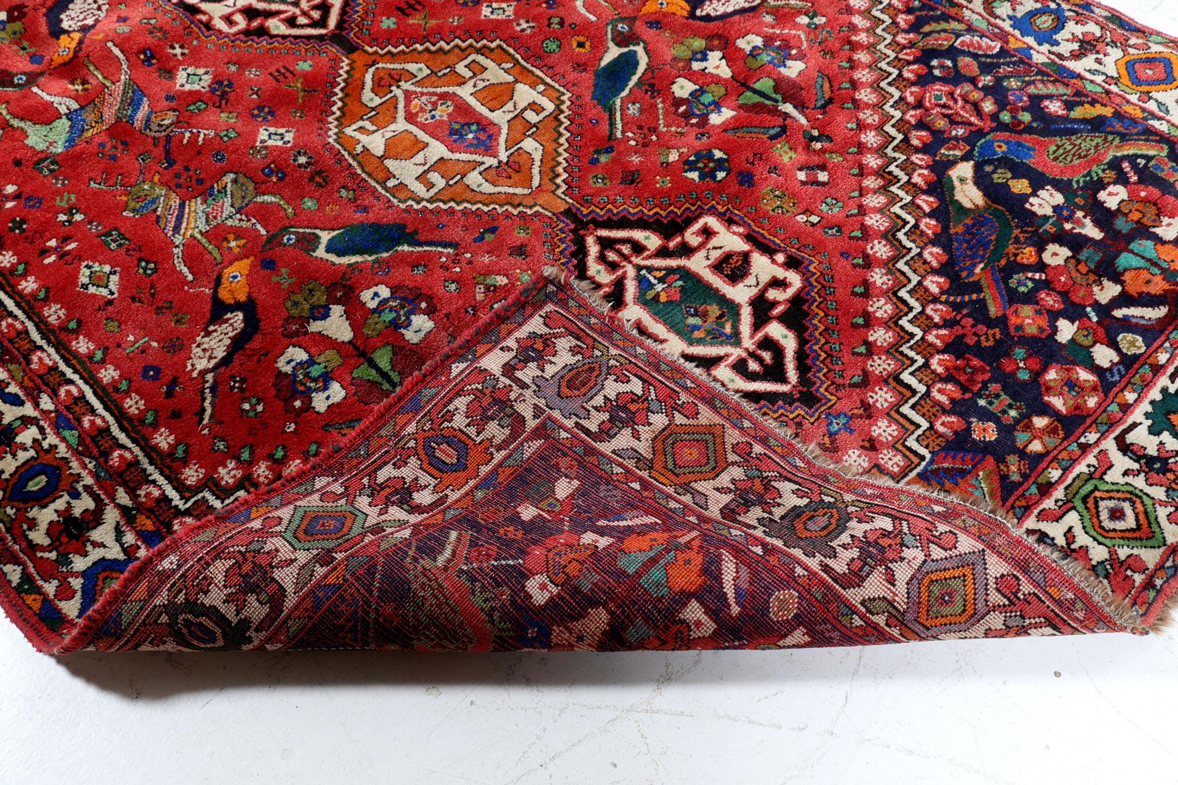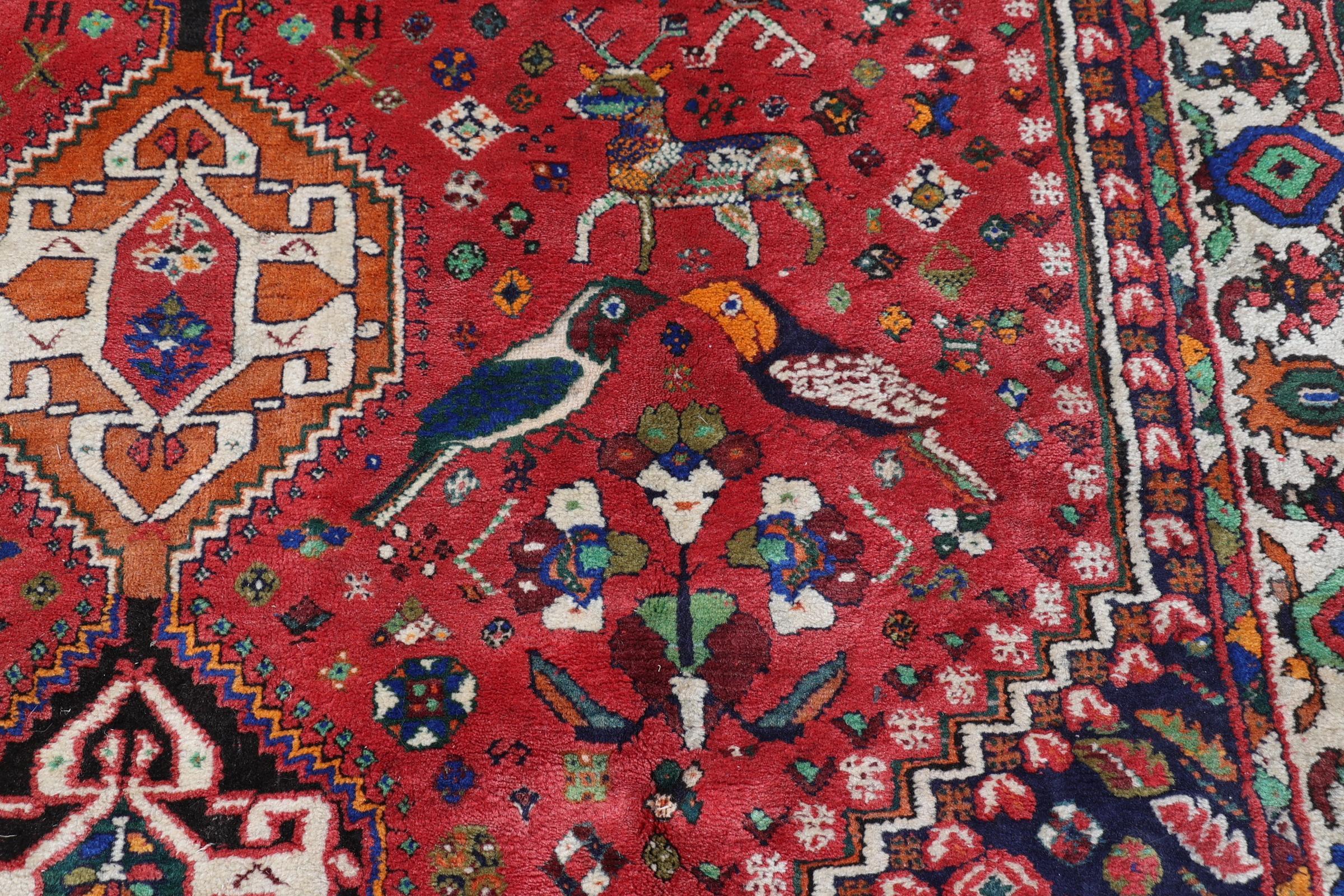 Handgeknoopt Shiraz vloerkleed met motieven van herten en vogels, 260 x 165 cm.