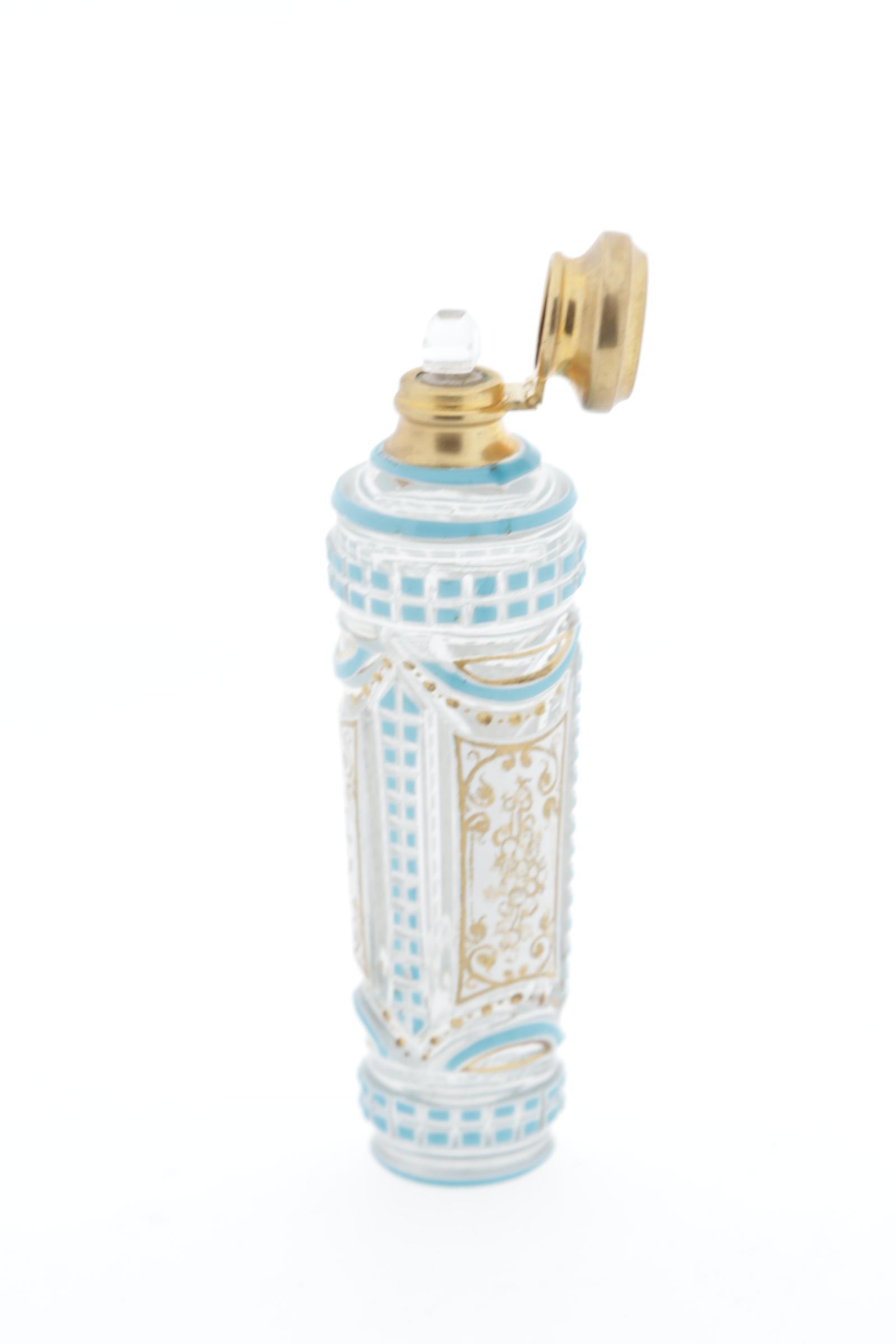 Parfumfles, Frans, turquoise en wit overlay met goud beschilderde panelen, scharnierende metalen dop, kristal binnenstopje, rond 1830, hoogte 11 cm