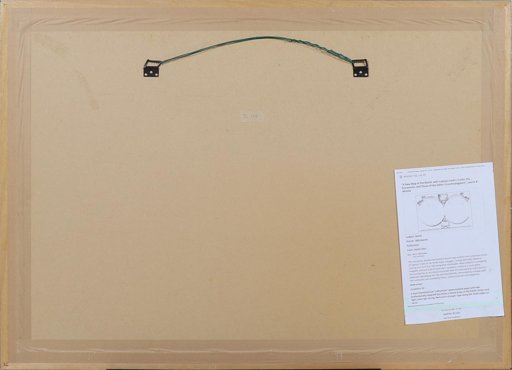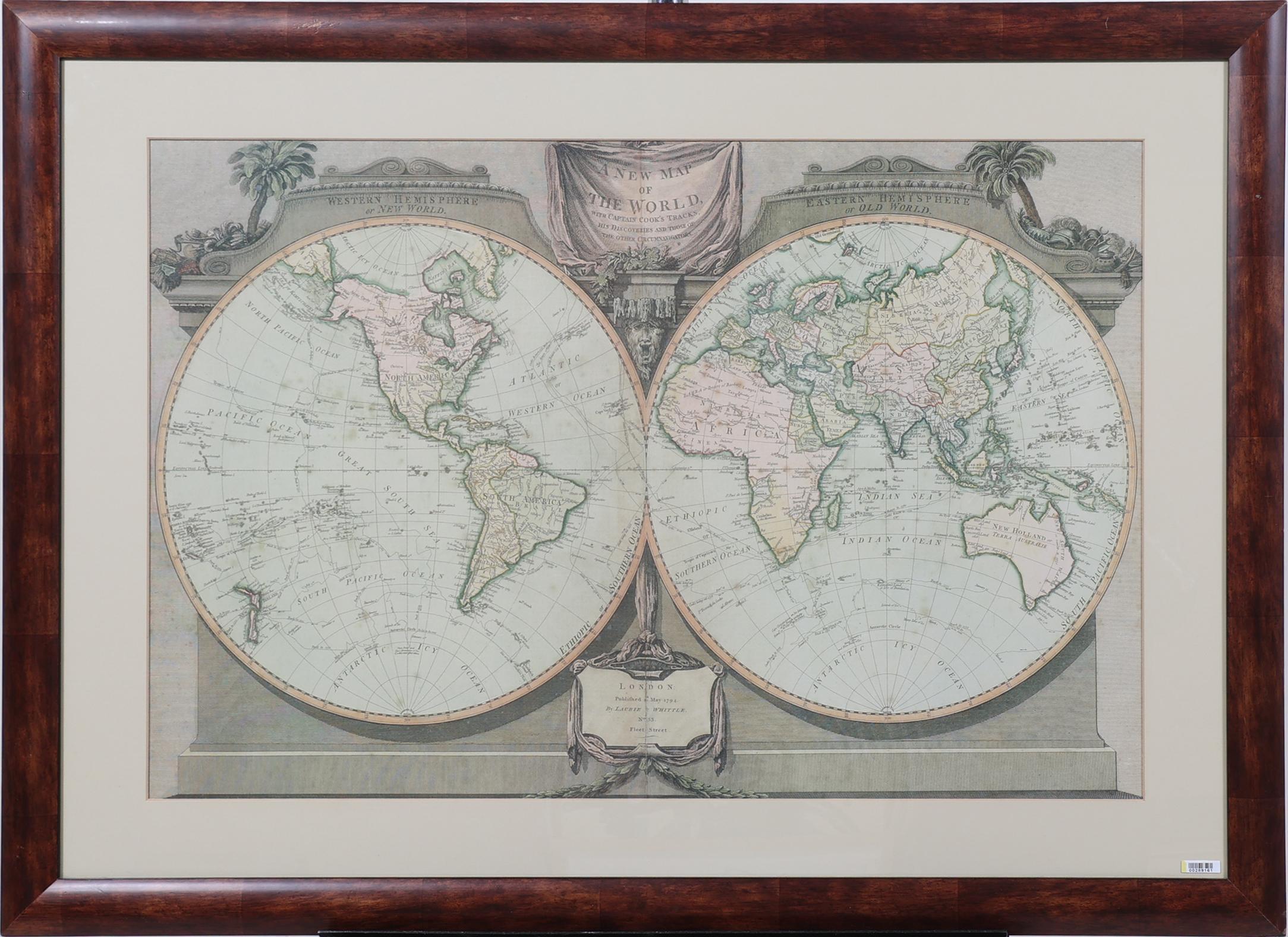 A new map of the world, with captain Cook's tracks, his discoveries and those of the other circumnavigators, gepubliceerd in London door James Whittle & Robert Laurie, begin 19e eeuw, handgekleurde kopergravure, 84,5 x 55,5 cm.