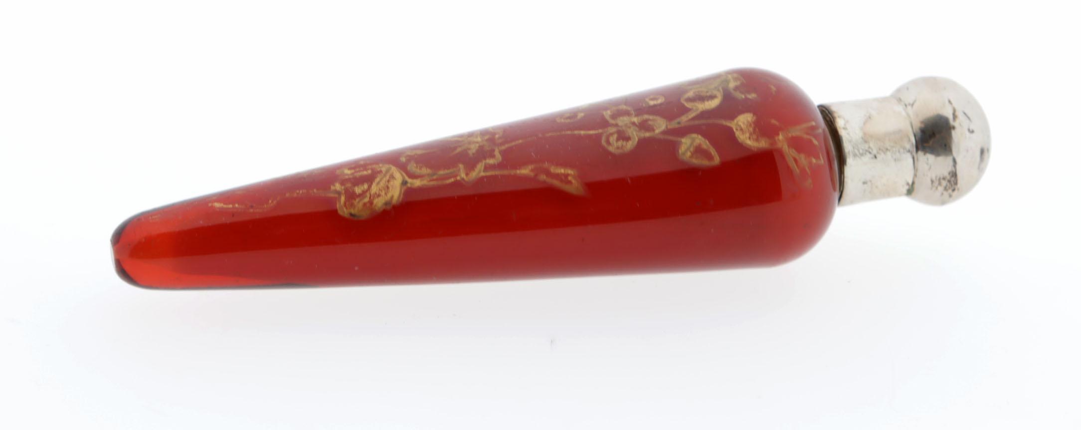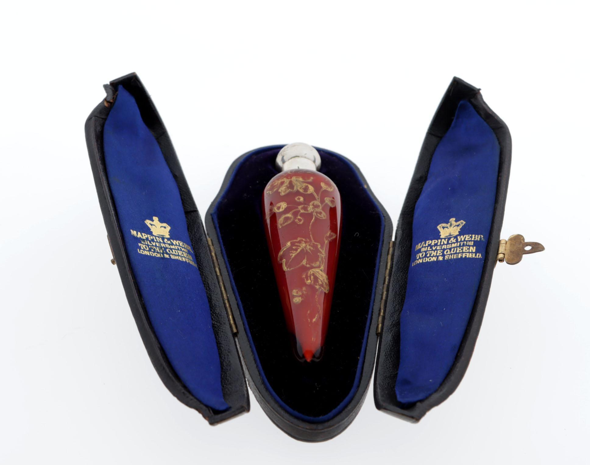 Rode puntvormige glazen parfumfles met zilveren dop, gouden bloembeschildering, in etui waarop "Mappin & Webb Silversmiths to the queen London & Sheffield"