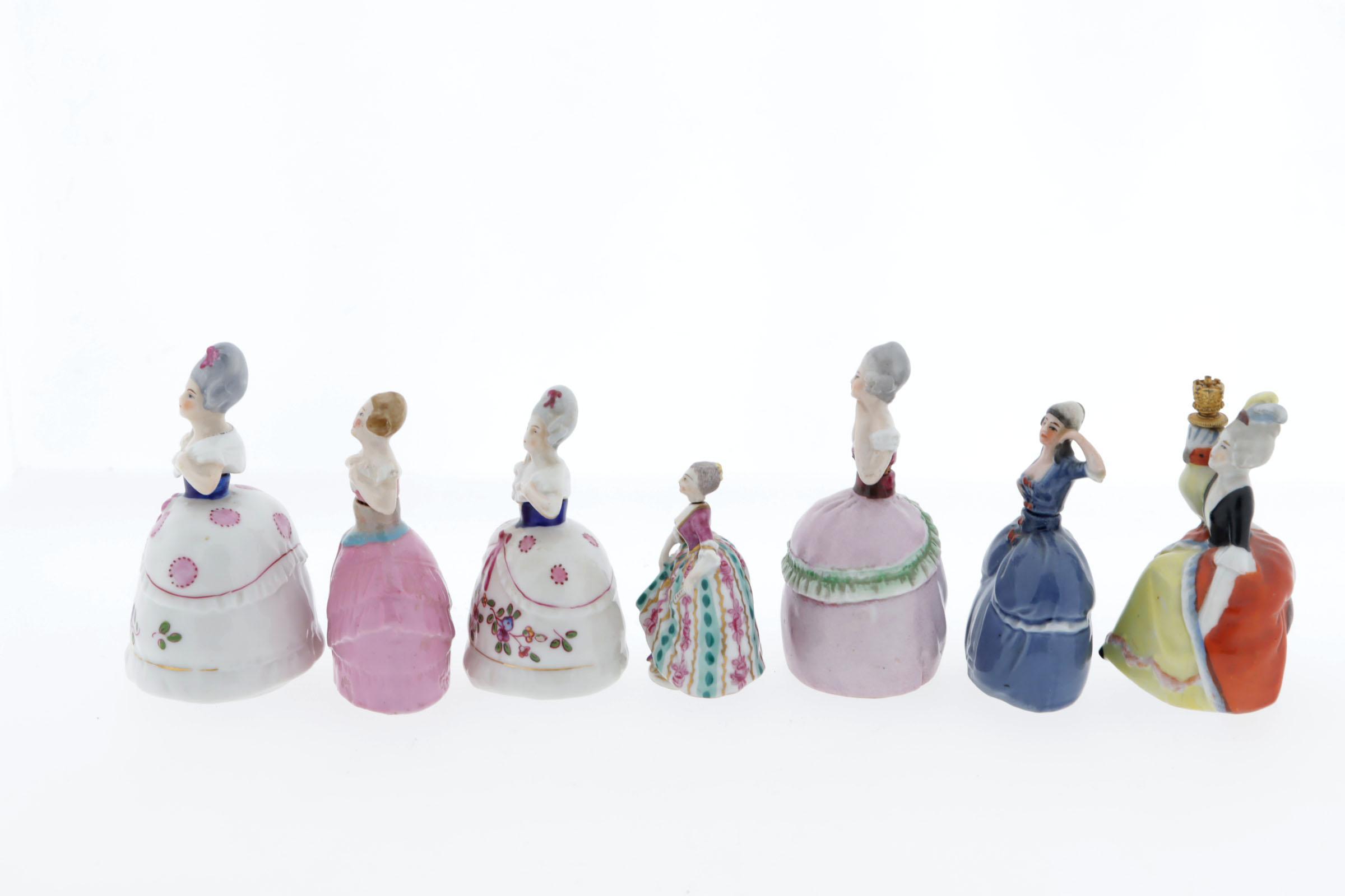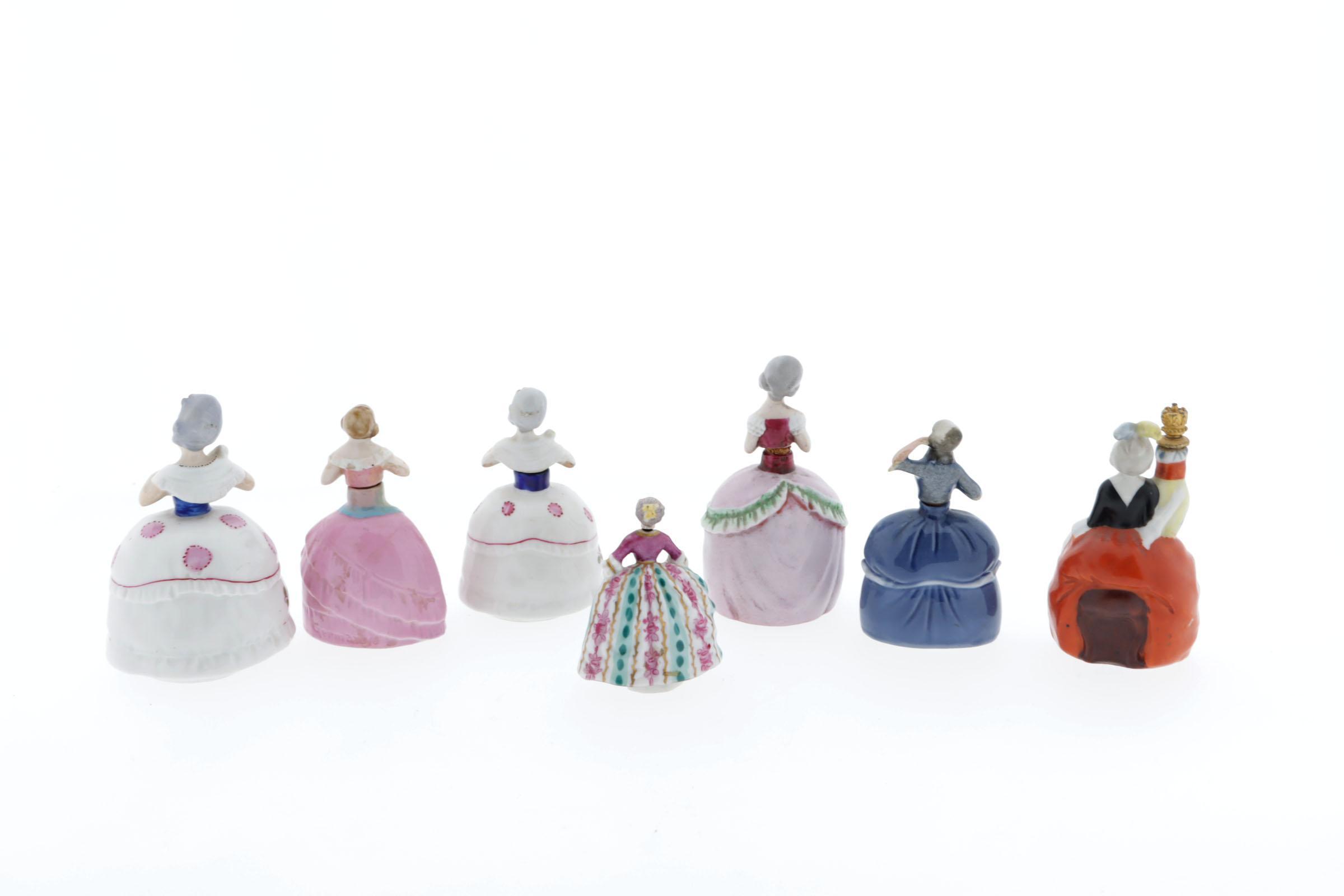 7 parfumflesjes, porseleinen vrouwfiguurtjes, waaronder rococo figuurtje met roze/wit/groene gestreepte rok, gemerkt D (Derby?), 18e eeuw, hoogte 6,5 cm, 2 witte vrouwtjes met gebloemde rokken, lijfjes zijn dop op kurk, gemerkt blauw porceleinmerk W. Goebel, rond 1920, Duits, roze vrouwtje blauwe strik, bovenlijf is stop, inscriptie 7742, Duits? rond 1920, hoogte 9 cm, blauw vrouwtje, rococo, gemerkt "foreign" Sitzendorf, Duitsland, rond 1920, hoogte 8,5 cm