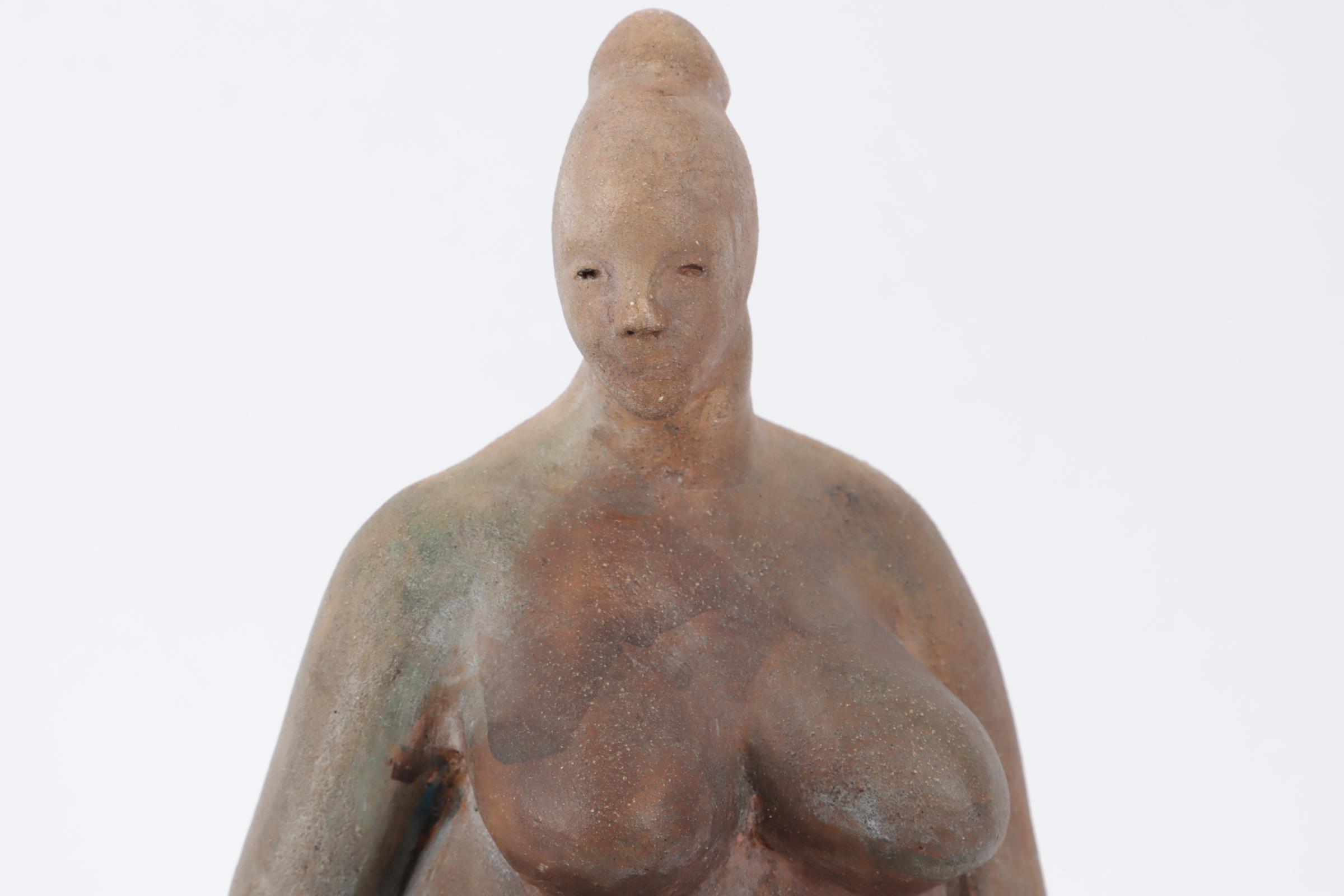 Onb.meester, terracotta sculptuur van een vrouwelijk naakt rustend op houten sokkel, h.37 cm.